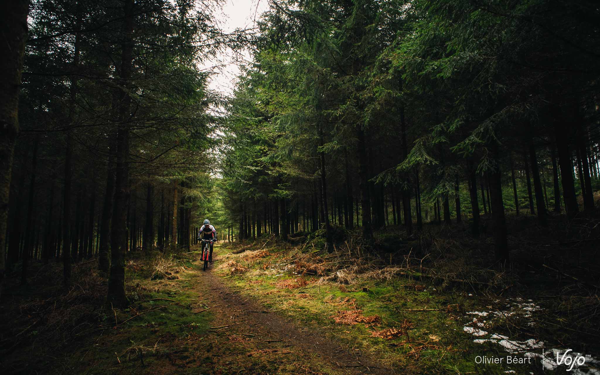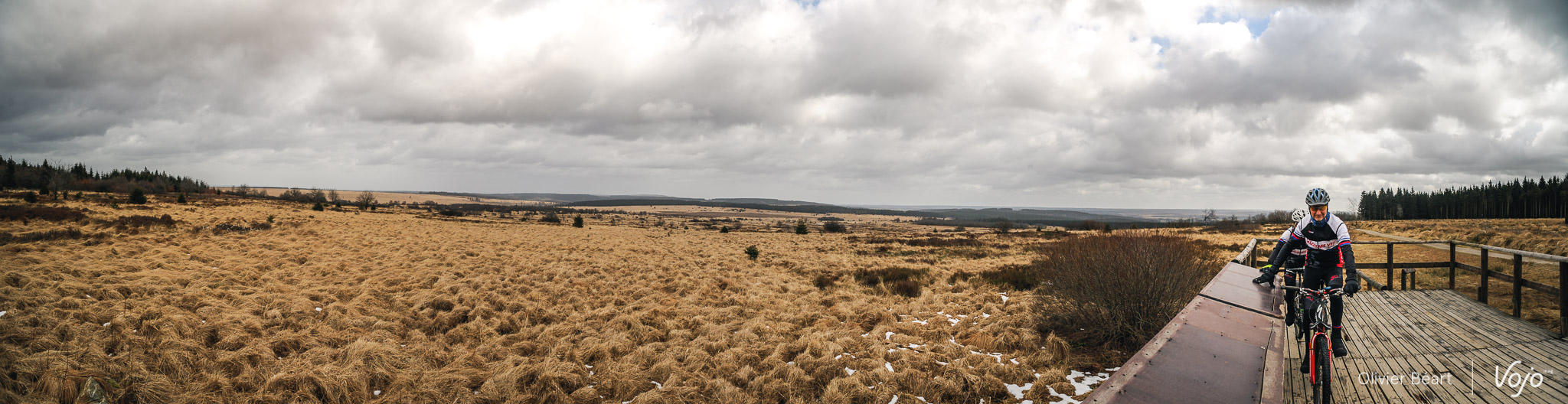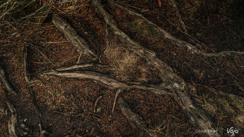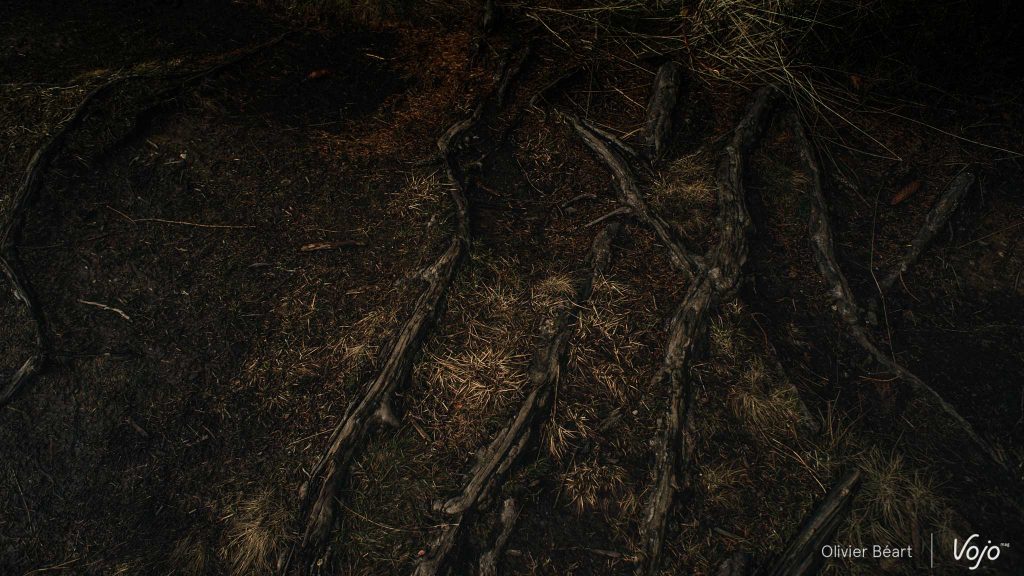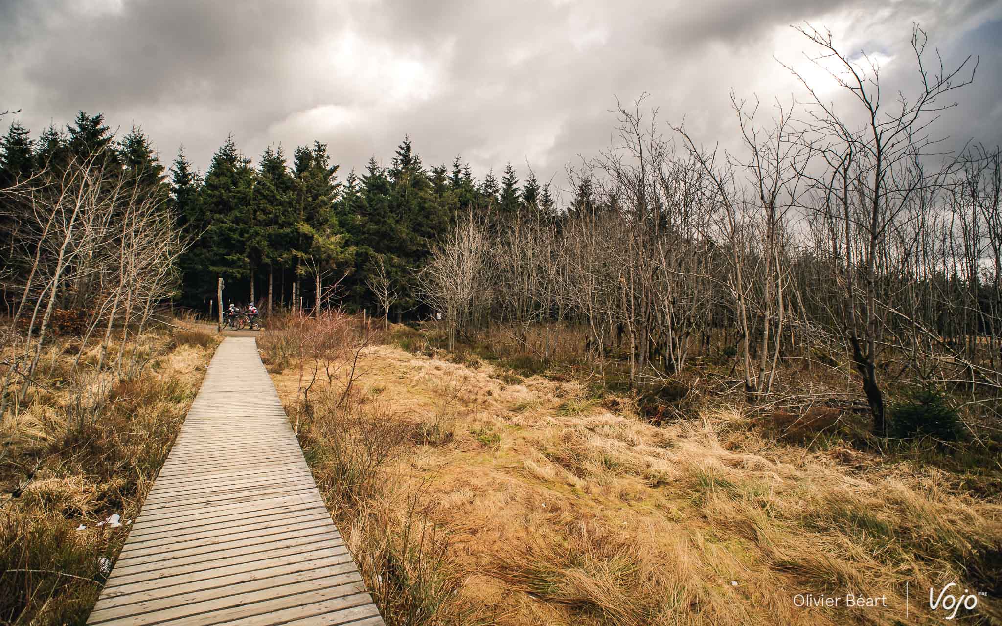 Le toit de la Belgique n’est plus très loin. Les paysages se font plus dégagés et le sol tourbeux particulièrement typique des Fagnes se montre très agréable à rouler, surtout quand il est rempli des racines des arbres fraichement coupés dans ces zones intermédiaires où l’exploitation forestière est encore permise. Au sommet par contre, ce n’est qu’une énorme réserve naturelle.