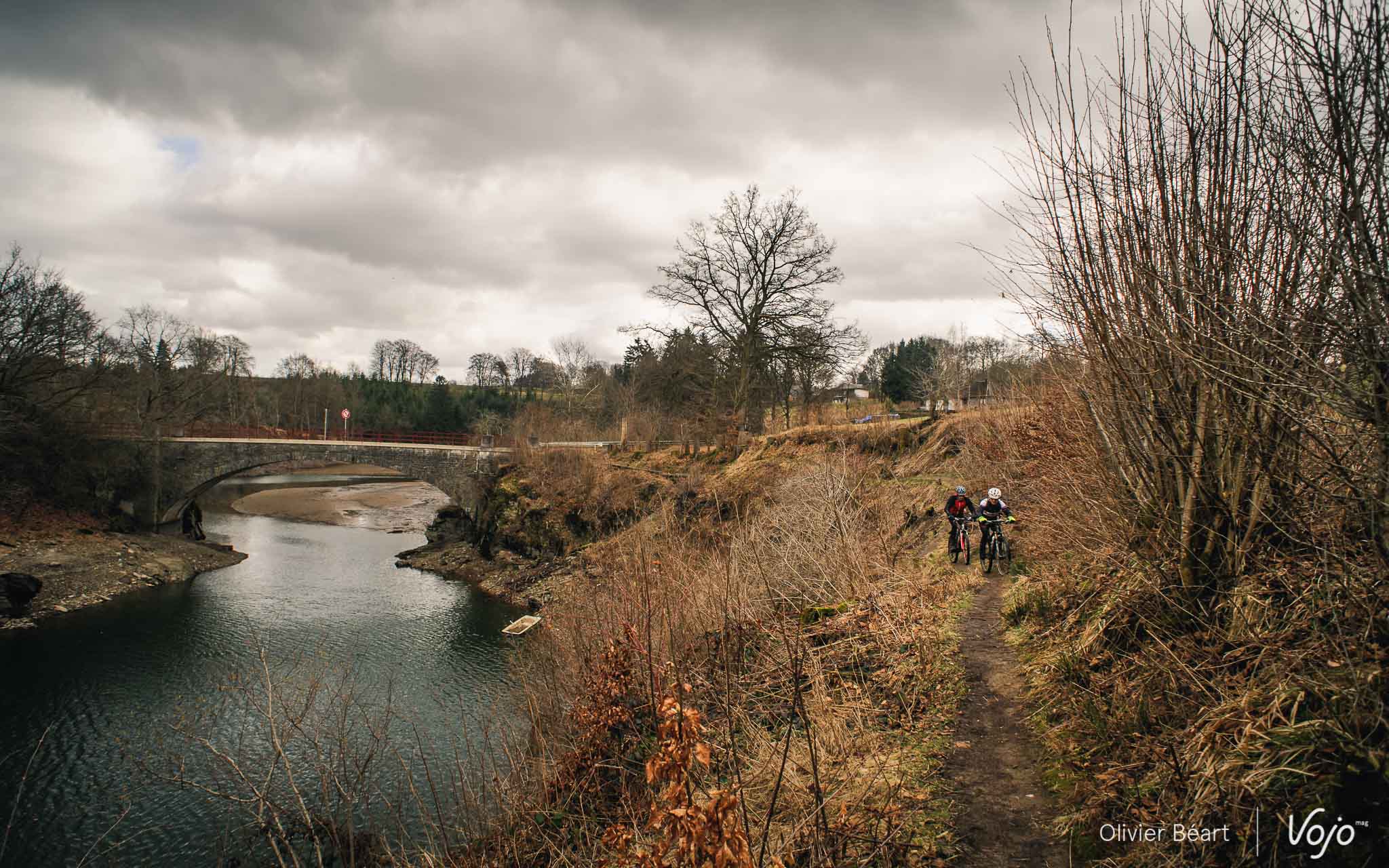 En bas, on rejoint la Warche, juste avant qu’elle n’arrive dans le lac de Robertville. Des passerelles aménagées permettent de profiter pleinement du sentier qui longe l’eau. C’est trialisant et franchement amusant. Hélas, il arrive parfois que quelques arbres tombent des pentes raides voisines et il faut parfois descendre du vélo. heureusement, l’endroit est assez touistique et bien entretenu en saison.