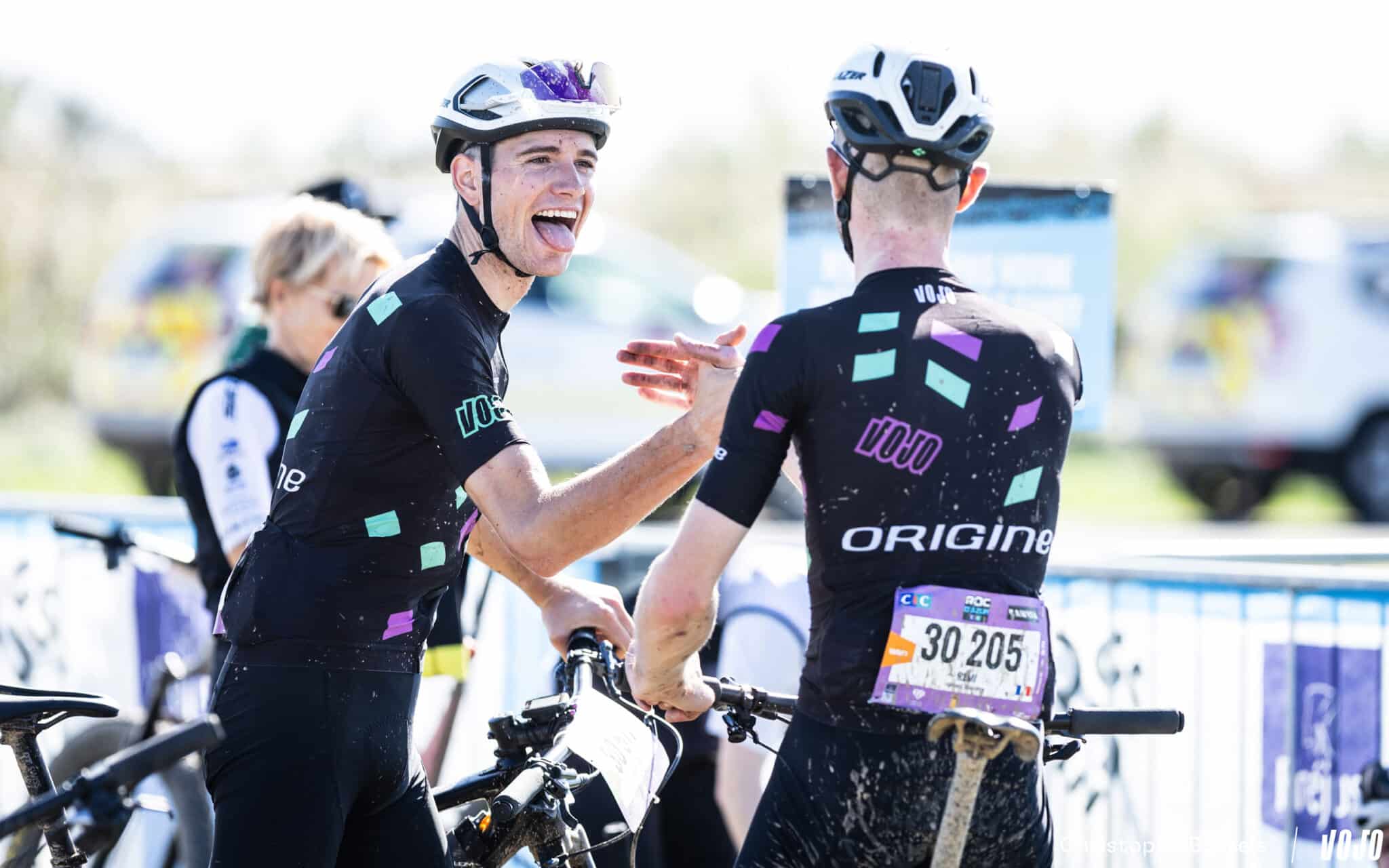 Accueilli à l’arrivée par son co-équipier Basile Allard, Rémi Groslambert du team Origine x Vojo prend la 28e place.