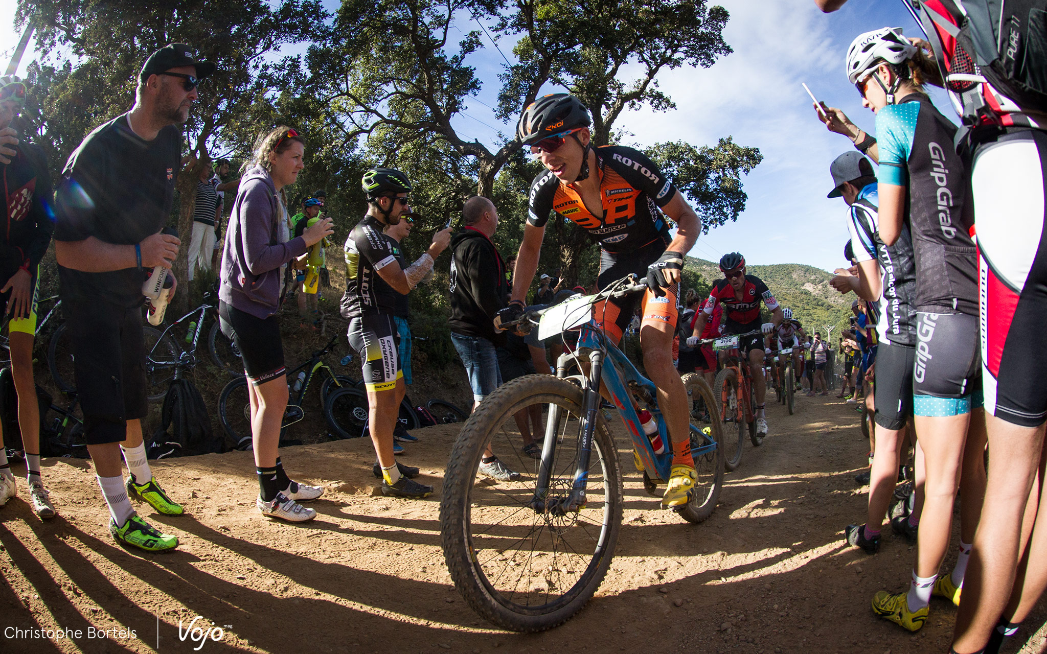 C’est Jordan Sarrou, vainqueur du Roc en 2016, qui fend le premier la poussière de la moto ouvreuse ! L’esprit léger, puisqu’il vient de re-signer son contrat chez BH-Suntour-KMC (qui aura l’an prochain Ekoï pour sponsor titre), il semble bien parti pour réaliser une inédite passe de 3.