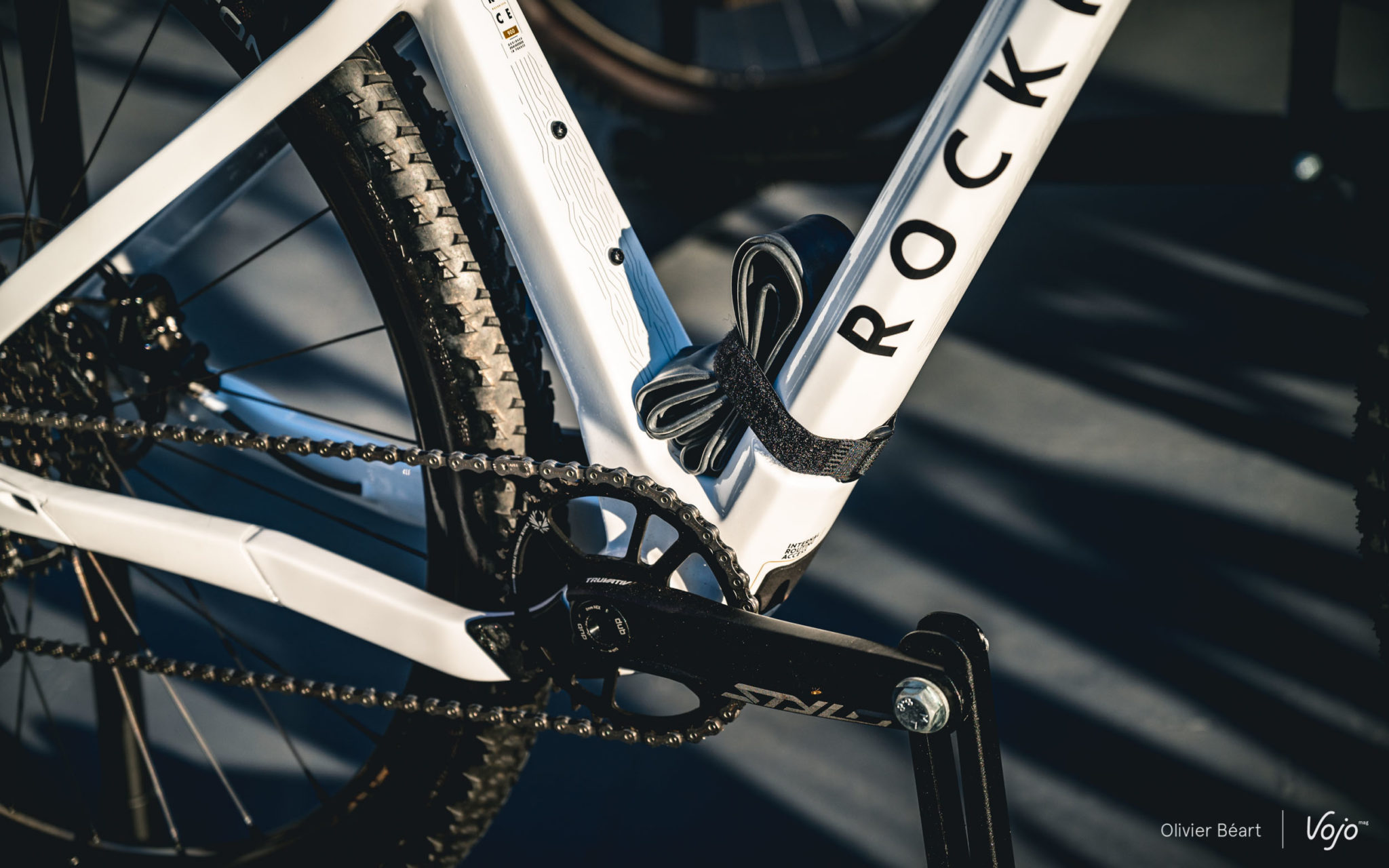 On remarque également une patte de dérailleur Sram UDH, ce qui s’approche le plus d’une patte de dérailleur universelle aujourd’hui (puisqu’elle est conçue par Sram, elle n’est plus spécifique au cadre donc coûte moins cher et est beaucoup plus facile à trouver) et un plateau en 32 dents, plus accessible que le 34 dents que Rockrider proposait jusqu’alors sur ses vélos de XC.