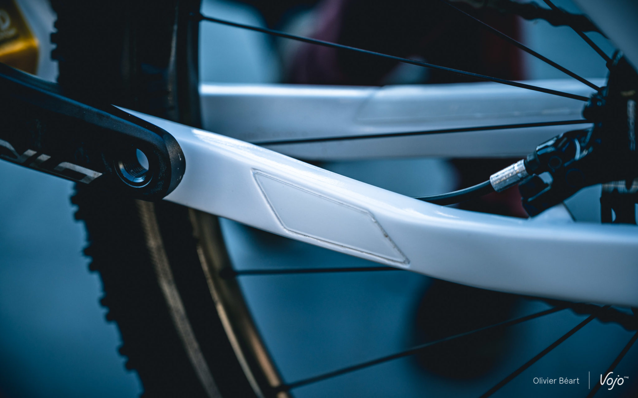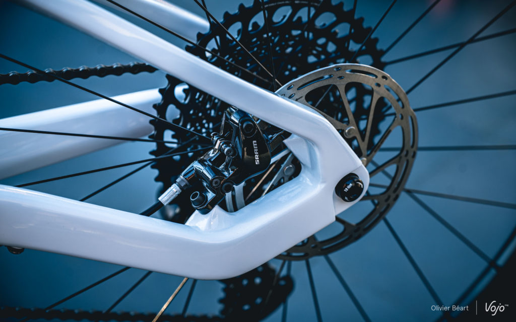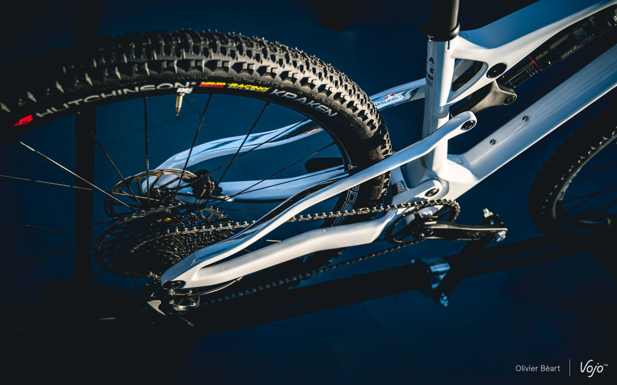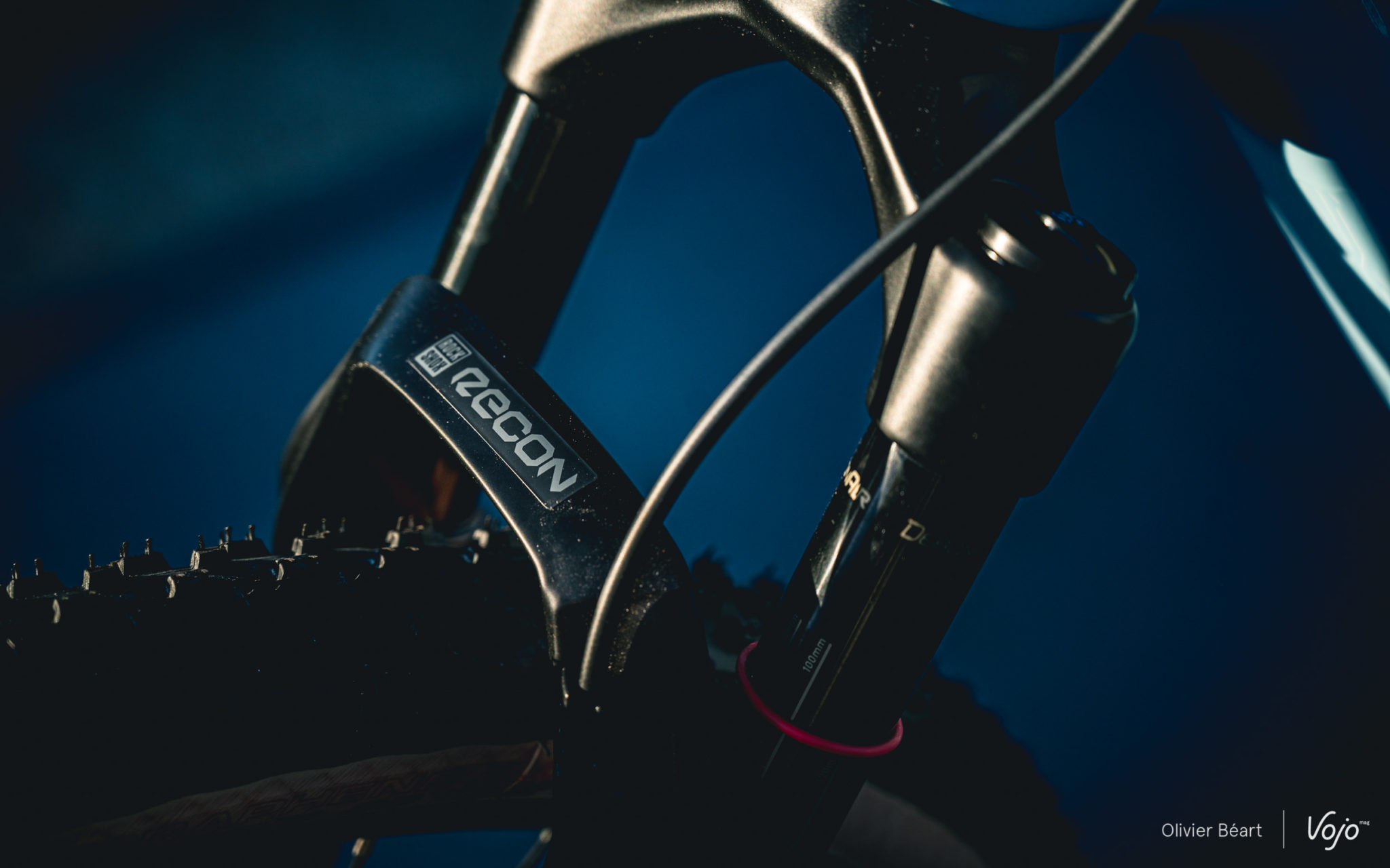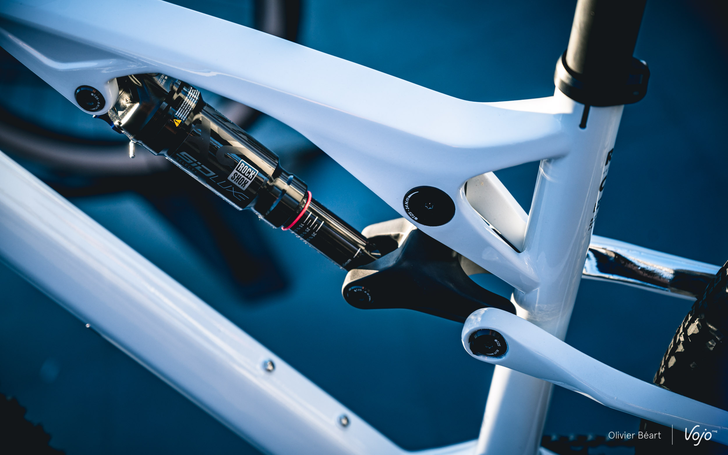 Cette évolution s’accompagne d’une biellette légèrement redessinée, ce qui modifie légèrement la courbe de la suspension. Toutefois, d’après Joseph de Poortere, ingénieur produit pour les vélos de XC, cela n’a pas d’influence notable sur le terrain. La suspension développe quant à elle toujours 120 mm de débattement, gérés par un amortisseur RockShox Sid Luxe aux réglages internes spécialement adaptés pour ce cadre.