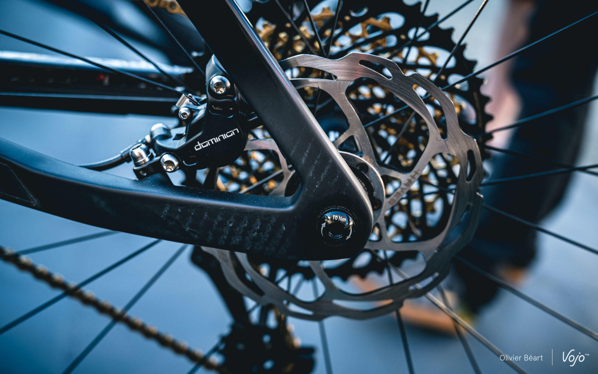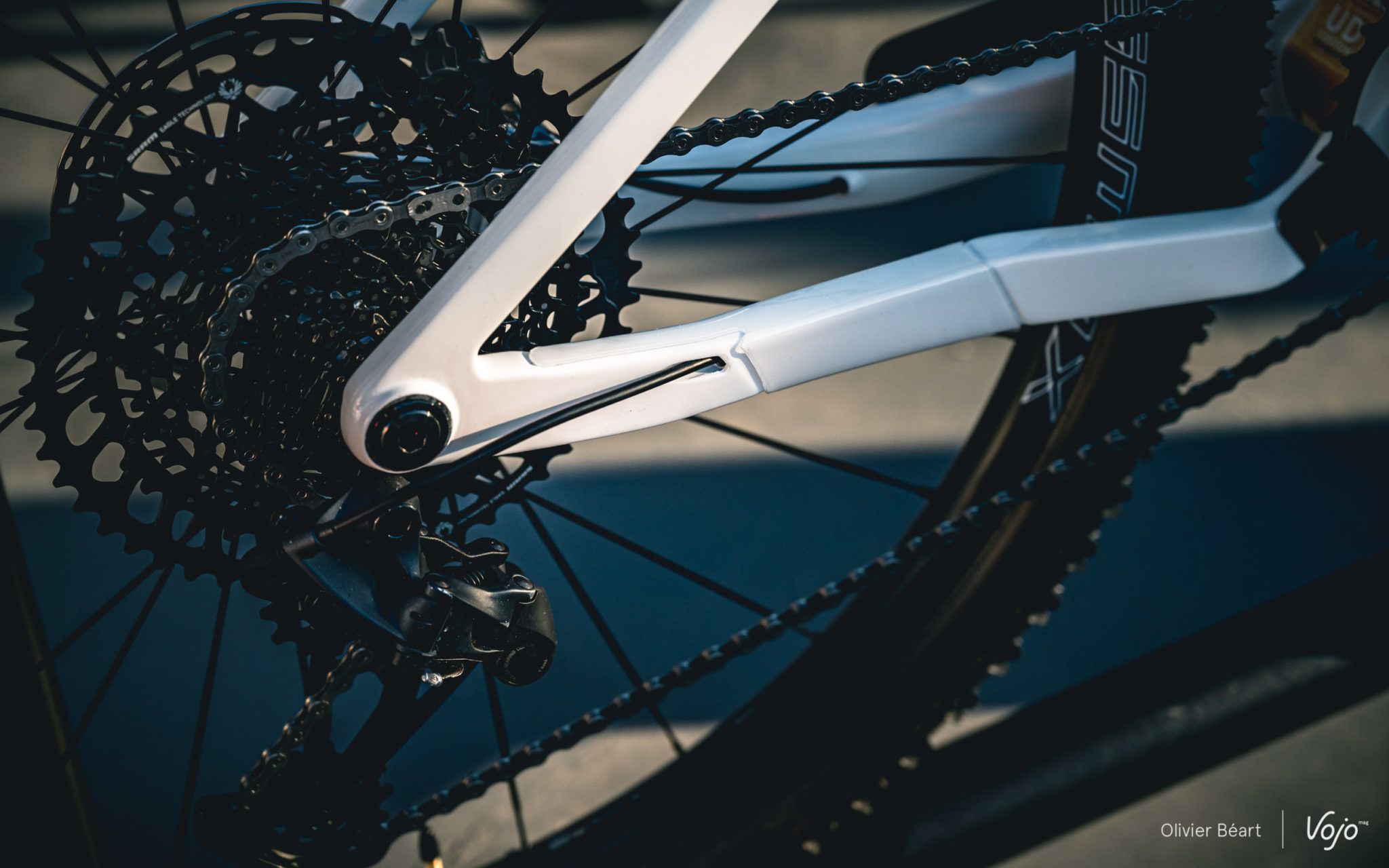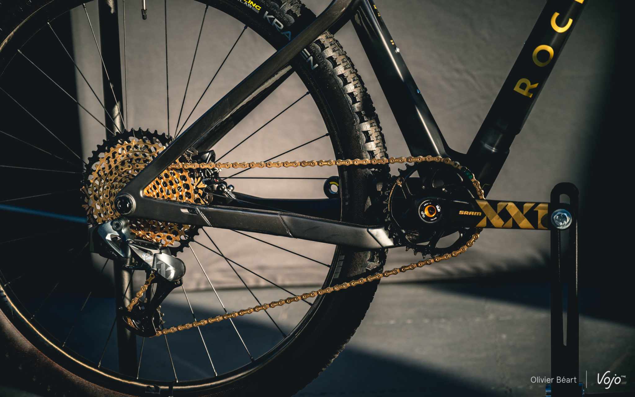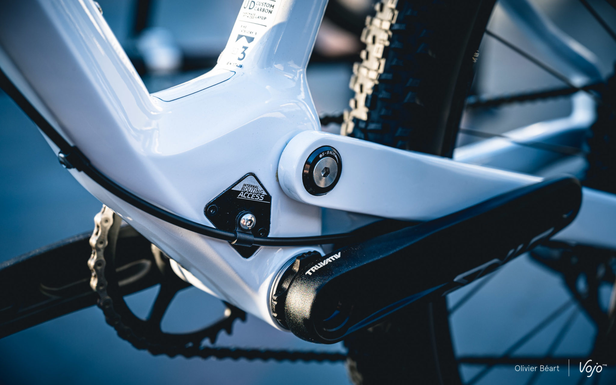 Cette évolution s’accompagne d’une biellette légèrement redessinée, ce qui modifie légèrement la courbe de la suspension. Toutefois, d’après Joseph de Poortere, ingénieur produit pour les vélos de XC, cela n’a pas d’influence notable sur le terrain. La suspension développe quant à elle toujours 120 mm de débattement, gérés par un amortisseur RockShox Sid Luxe aux réglages internes spécialement adaptés pour ce cadre.