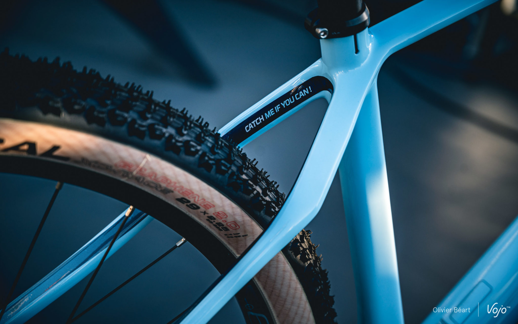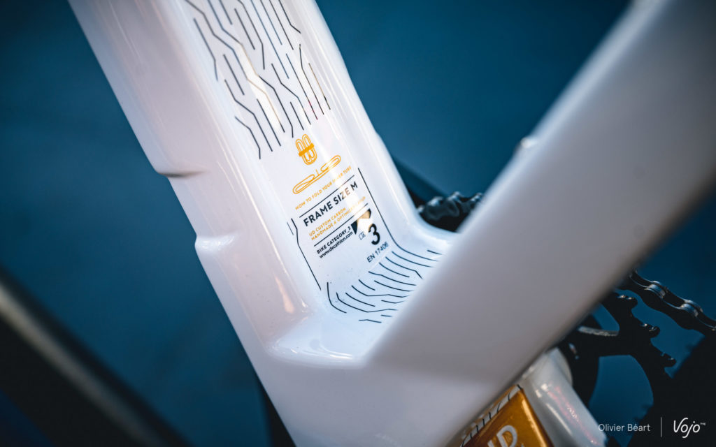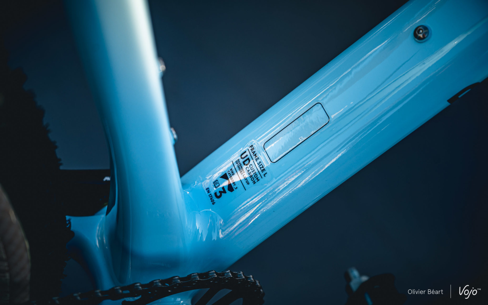 A côté de cela, le cadre dispose de quelques « astuces » intéressantes, comme un renfoncement pour un strap à outils ou à chambre à air (et quelques conseils de pliage de cette dernière juste au-dessus) ou encore des protections innovantes sur le tube supérieur ou la base côté transmission. Développées avec Effetto Mariposa, elles s’intègrent parfaitement dans la ligne du cadre et sont auto-réparantes, tant que la rayure ou l’impact n’est pas trop important.