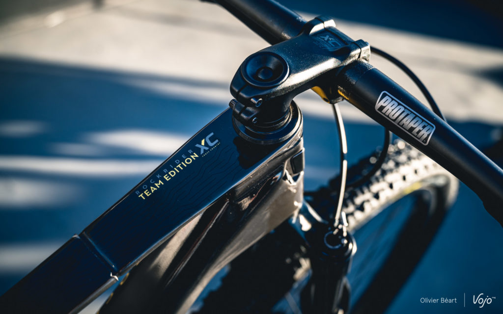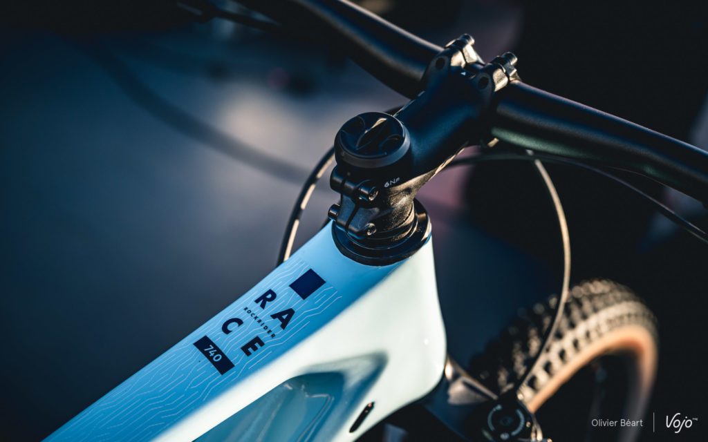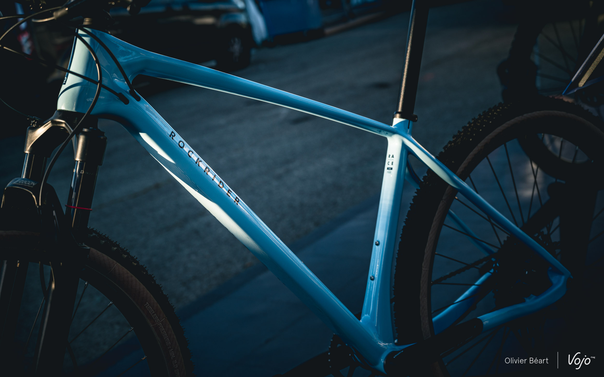 Selon Rockrider, il a été conçu pour les marathons rapides et roulants comme le Grand Raid BCVS en Suisse, ou les parcours XCO nerveux. Le cadre a été travaillé en 3 parties, pour offrir à la fois de la stabilité au niveau de la direction, une excellente rigidité latérale sur le triangle avant et une souplesse bien dosée à l’arrière pour garder du grip et éviter à l’arrière de rebondir sur tous les obstacles. Les lignes se veulent aussi plus agressives avec un décrochage plus marqué sur les haubans. A la rédaction, ce design fait moins l’unanimité que celui du Race 740 et les avis sont plus partagés, mais comme toujours, les goûts et les couleurs…