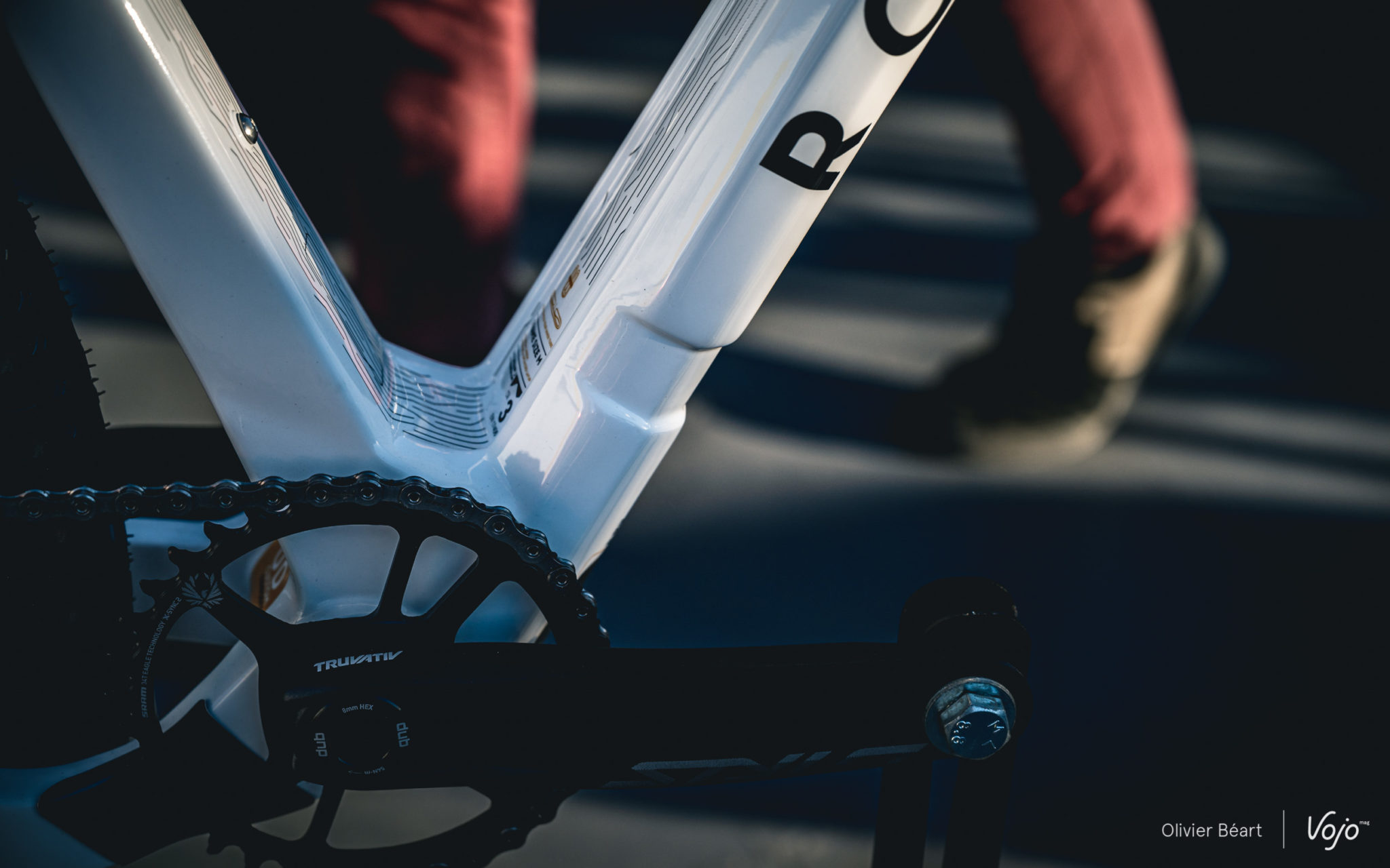 On note également une protection de l’autre côté, pour prévenir toute usure prématurée de la peinture à cause d’un éventuel frottement du talon. Dans le même objectif, le cadre est aussi protégé sur la douille de direction au niveau des entrées de gaines. Avec toutes ces protections et petits ajouts, le gain de poids est assez mesuré malgré le travail plus poussé sur le carbone : le cadre est annoncé à 1 030 g en taille M, soit à peine 200 grammes comparé au 740 qui est loin d’être léger.