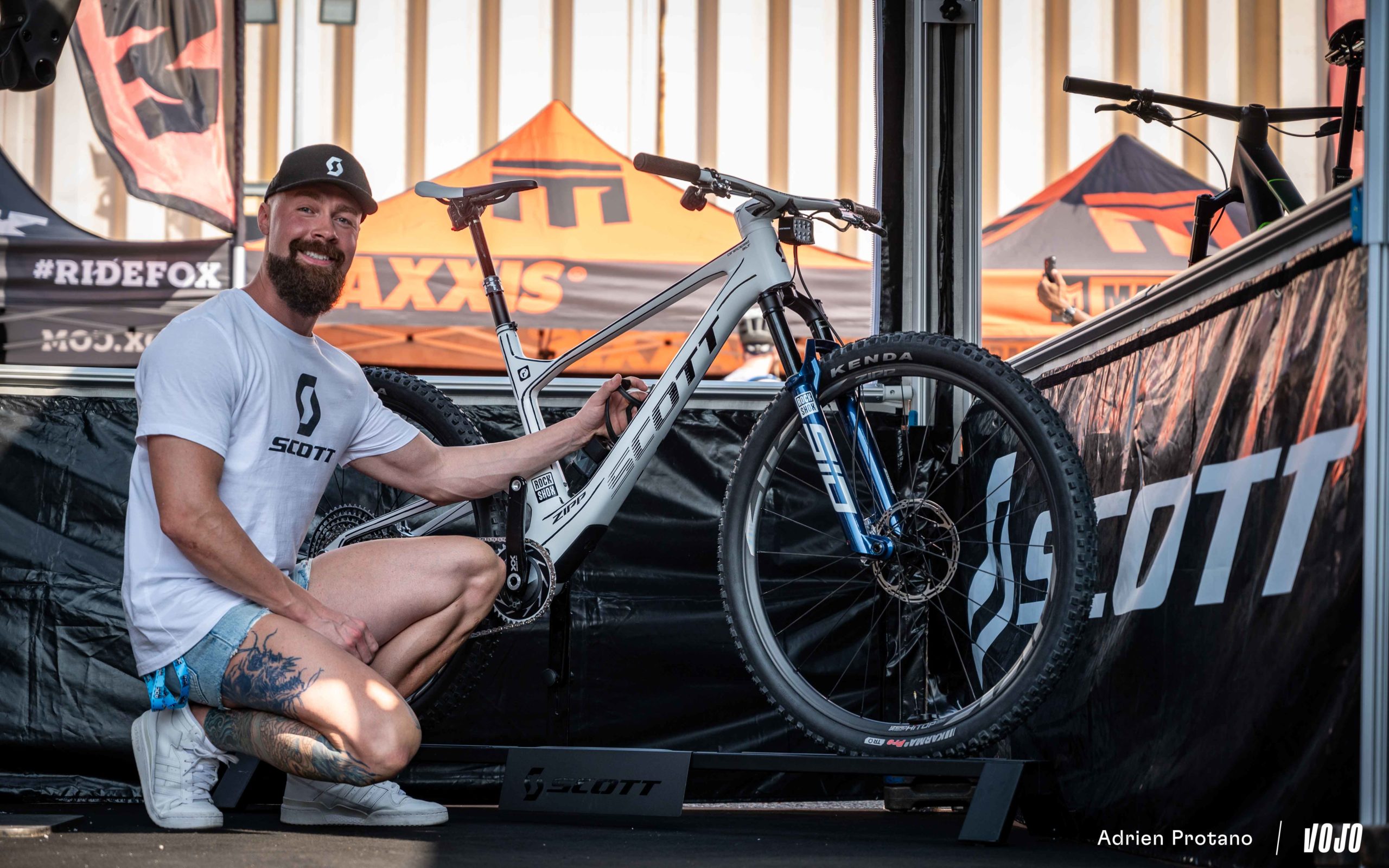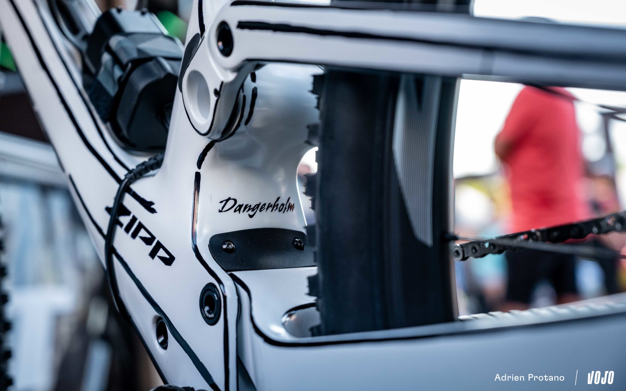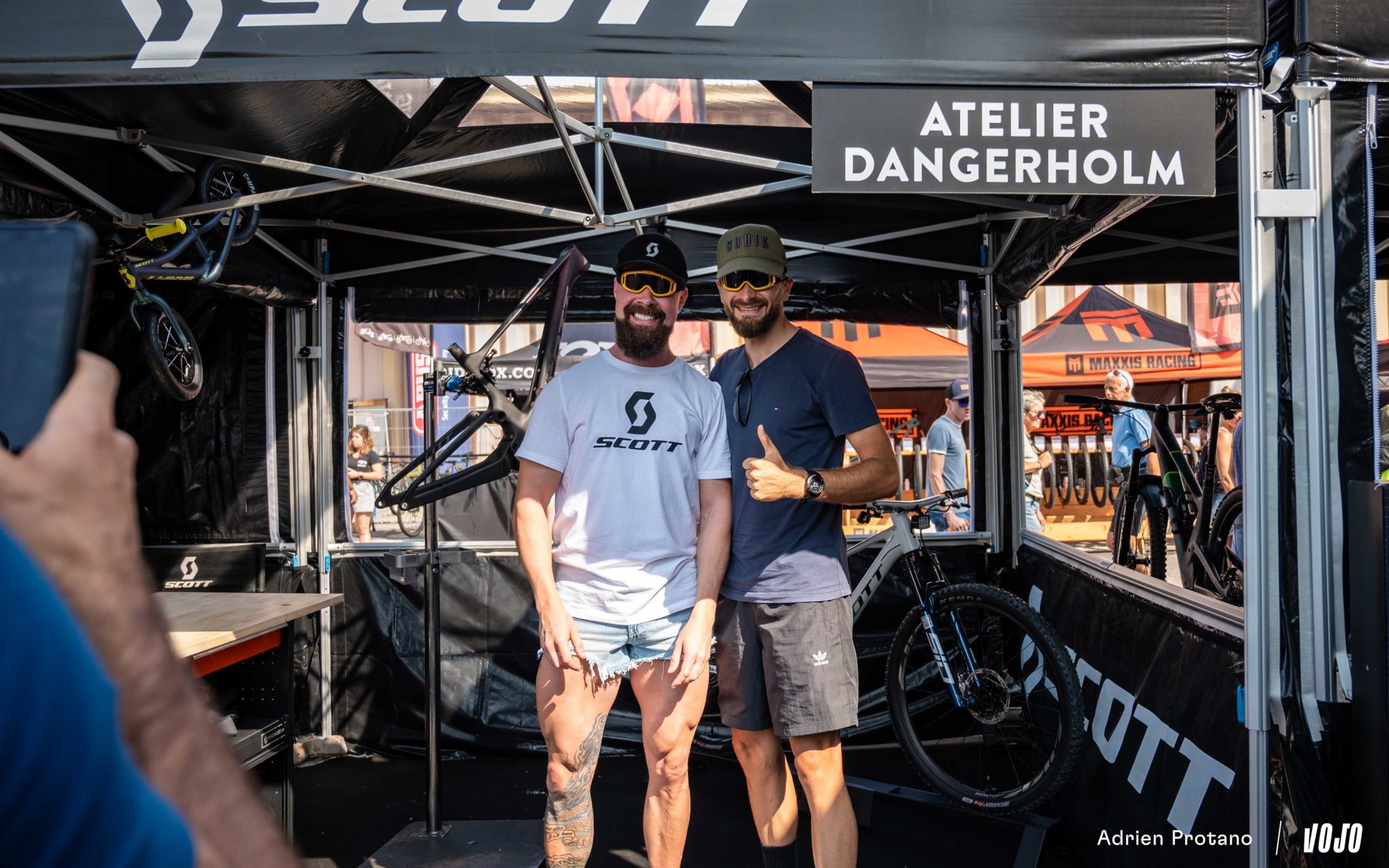 Sur le stand Scott, c’est le bien-connu Dangerholm qui a accompagné son dernier projet en date, un Scott Spark RC à l’allure 2D. « C’est vrai que j’ai l’habitude de faire des montages très exclusifs et parfois avec des pièces prototypes (NDLR. fourche Intend, transmissions Garbaruk…), mais ici l’idée était de donner un look différent à un modèle proche de celui de série » explique le spécialiste des montages exceptionnels. Au-delà du cadre personnalisé par le Norvégien, les composants sont en effet complètement disponibles pour le grand public : fourche SID dernière génération, roues Zipp 1Zero Hitop, transmission Sram AXS T-Type…