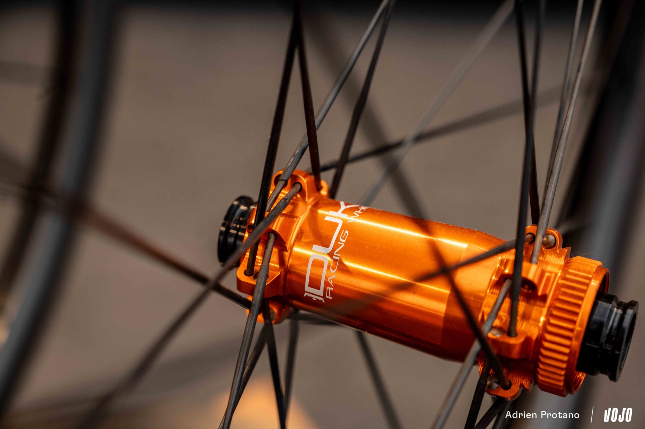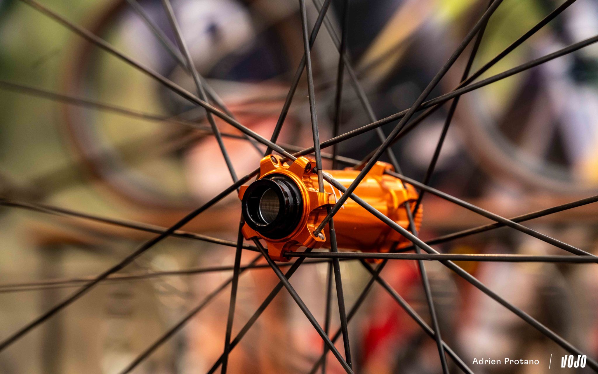 Sur le plan technique, les Deemax Enduro SL (exposées sur le Rossignol de Morgane Jonnier) sont assez différentes des deux autres dans la mesure où elles reprennent de nombreuses technologies des roues plus légères de la marque : le perçage Fore des jantes qui permet de se passer de fond de jante (mais oblige à utiliser ces écrous de rayons si particuliers), l’usinage entre les rayons ou encore le moyeu Infinity 3D (ici à 28 rayons plutôt que 24) à l’arrière.
