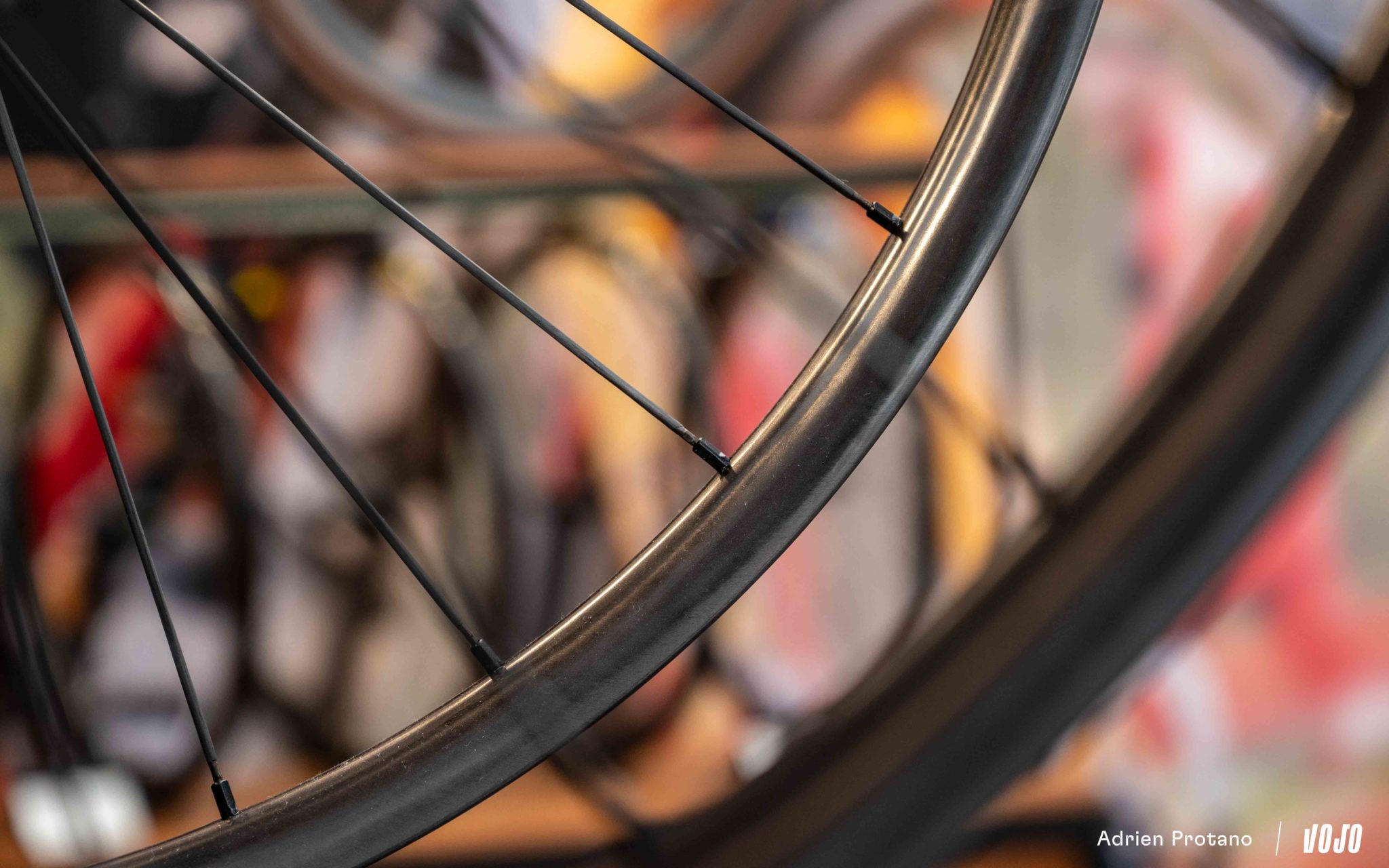 Leur particularité ? Un rayonnage à base de rayons en carbone. Chacun des rayons affiche 2,15 g sur la balance, soit près de la moitié d’un Sapim Cx Ray (5g). A l’échelle d’une roue complète à 28 rayons, cela représente un gain non-marginal de 160 g. Il faut noter que l’extrémité du rayon en lui-même est fait de titane noir.