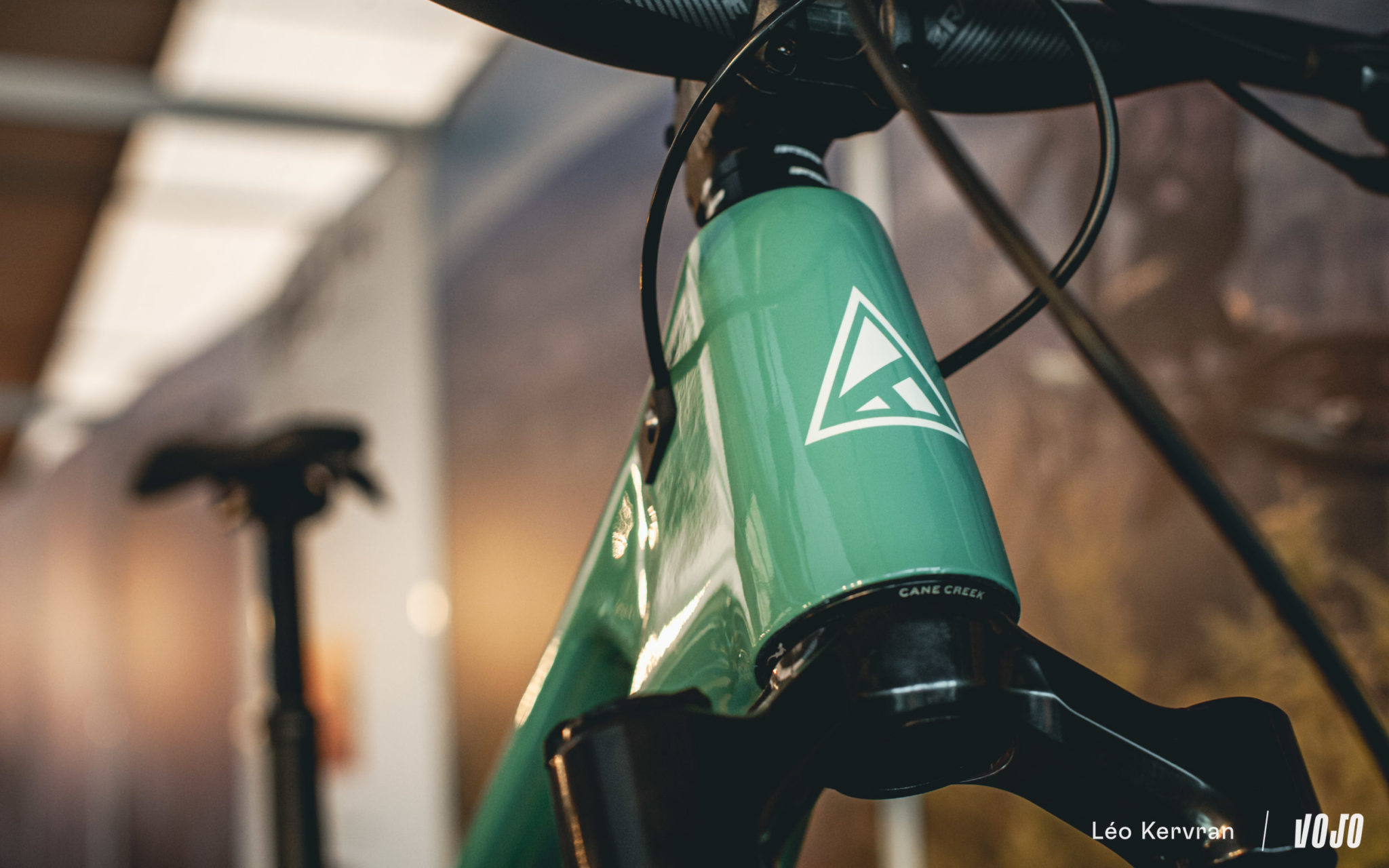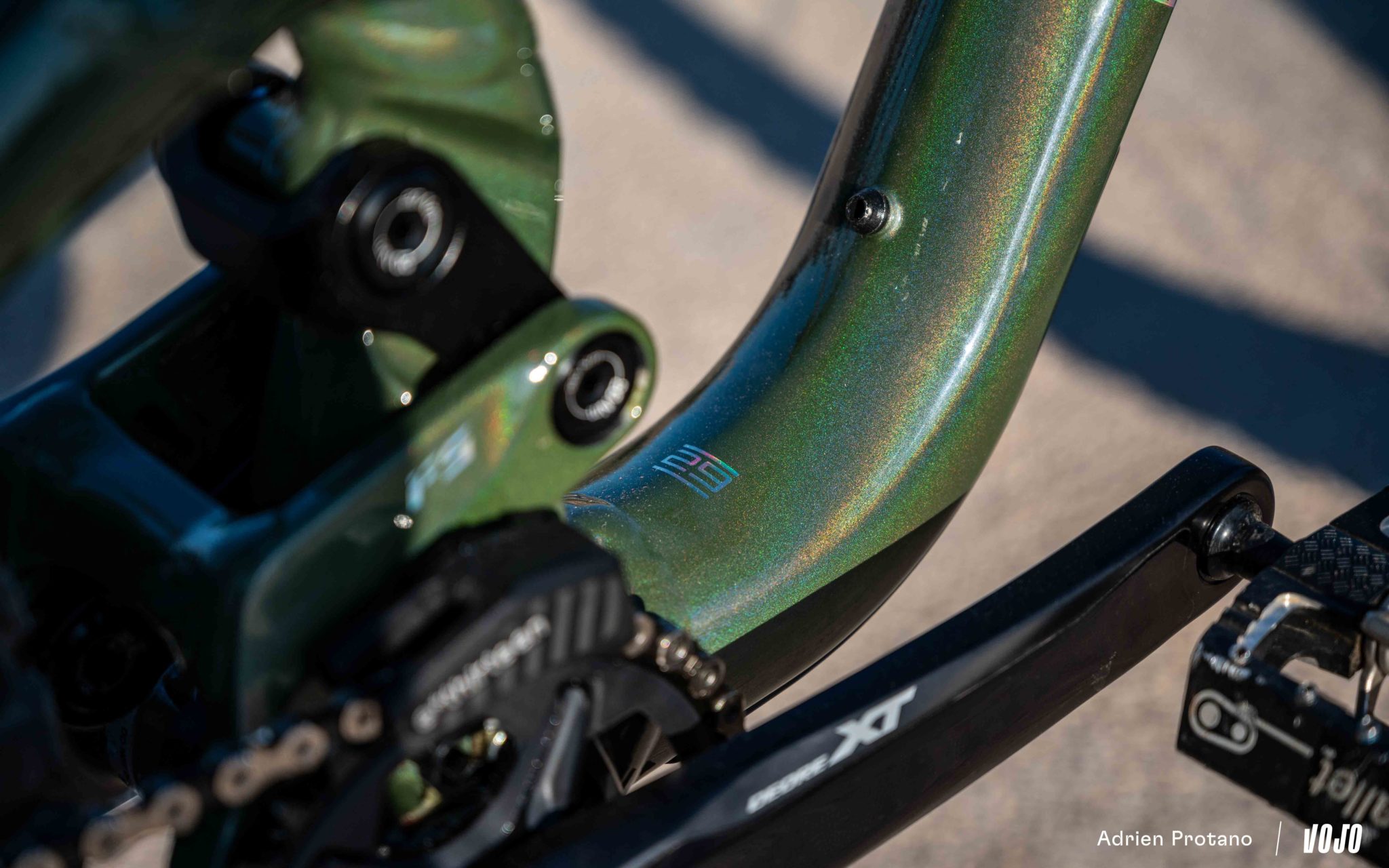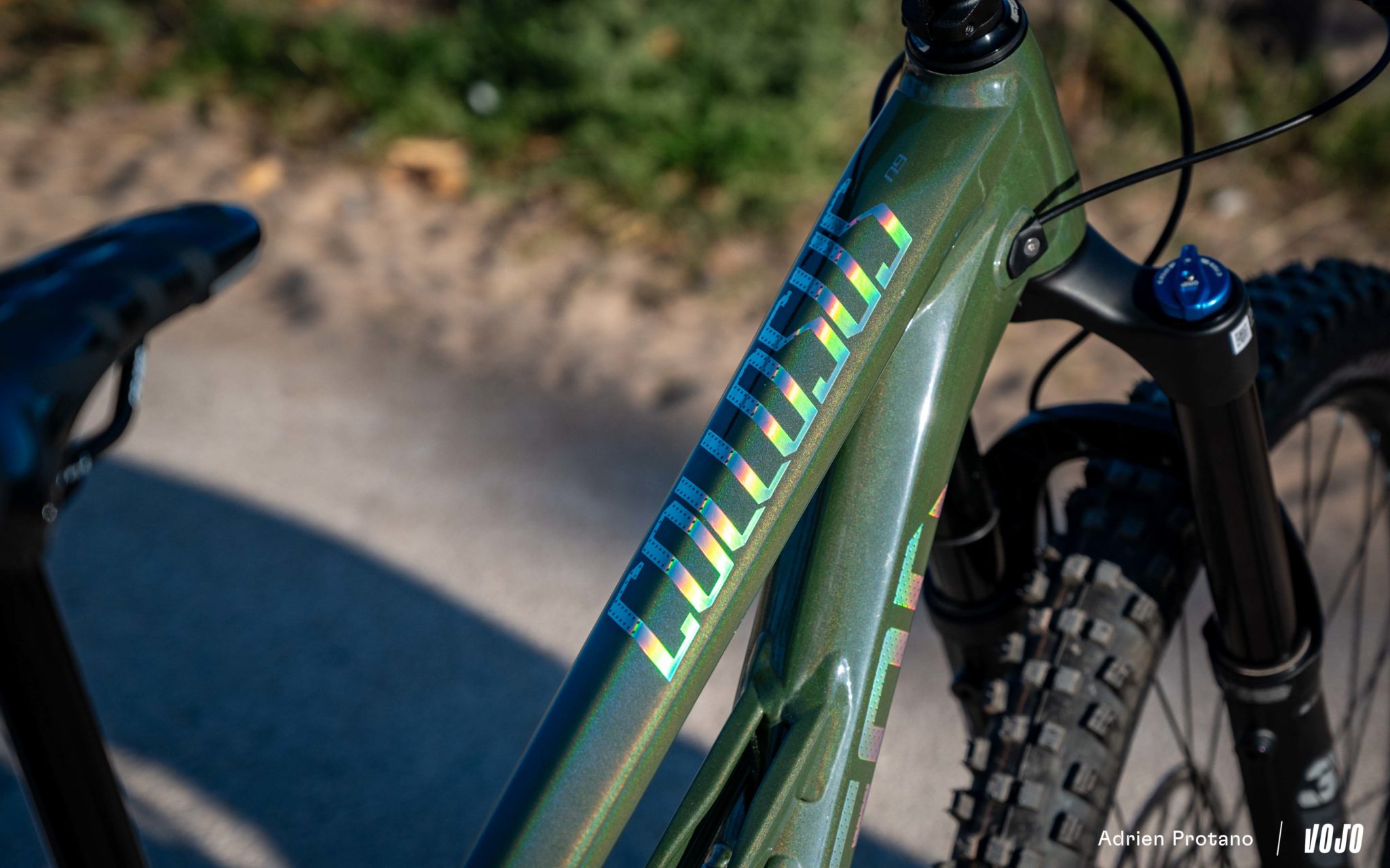 Au-delà de sa couleur offrant d’éclatants reflets, la marque a choisi de soigner les finitions, avec notamment un lettrage iridescent, de nombreuses protections sur le tube diagonal et sur les bases, ainsi qu’un logo en relief très travaillé sur la douille de direction.