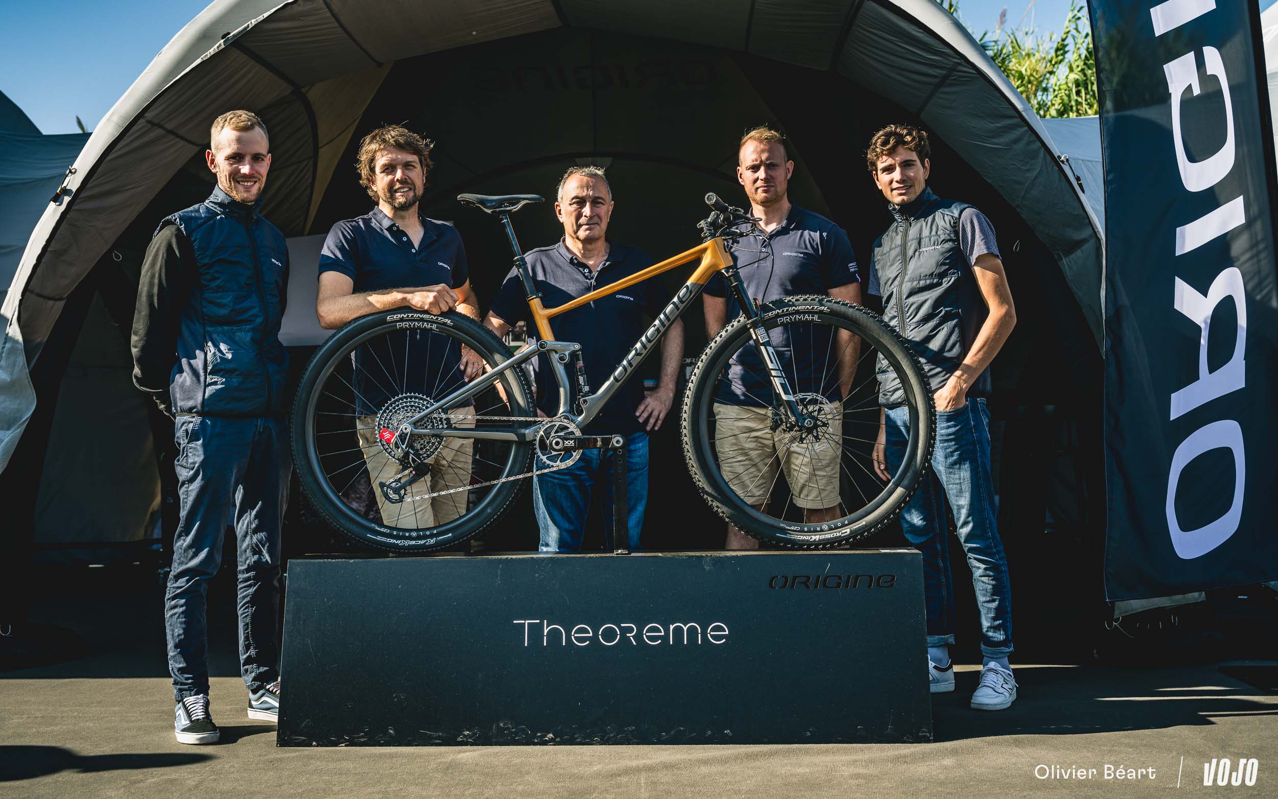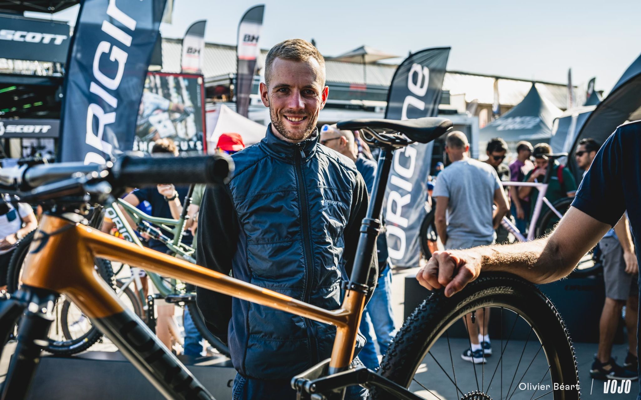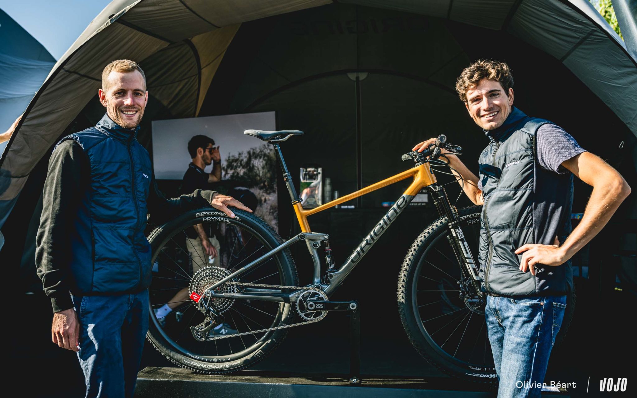 Sur le stand Origine, c’était la première sortie officielle du nouveau Théorème FS, que vous avez pu découvrir en détails, avec nos premières impressions de roulage, dans notre présentation complète. Mais c’était aussi la première sortie des nouveaux ambassadeurs VTT de la marque, Rémi Groslambert et Basile Allard, qui ont été retenus à l’issue d’une sélection menée par Origine et Vojo parmi plus de 100 candidatures !
