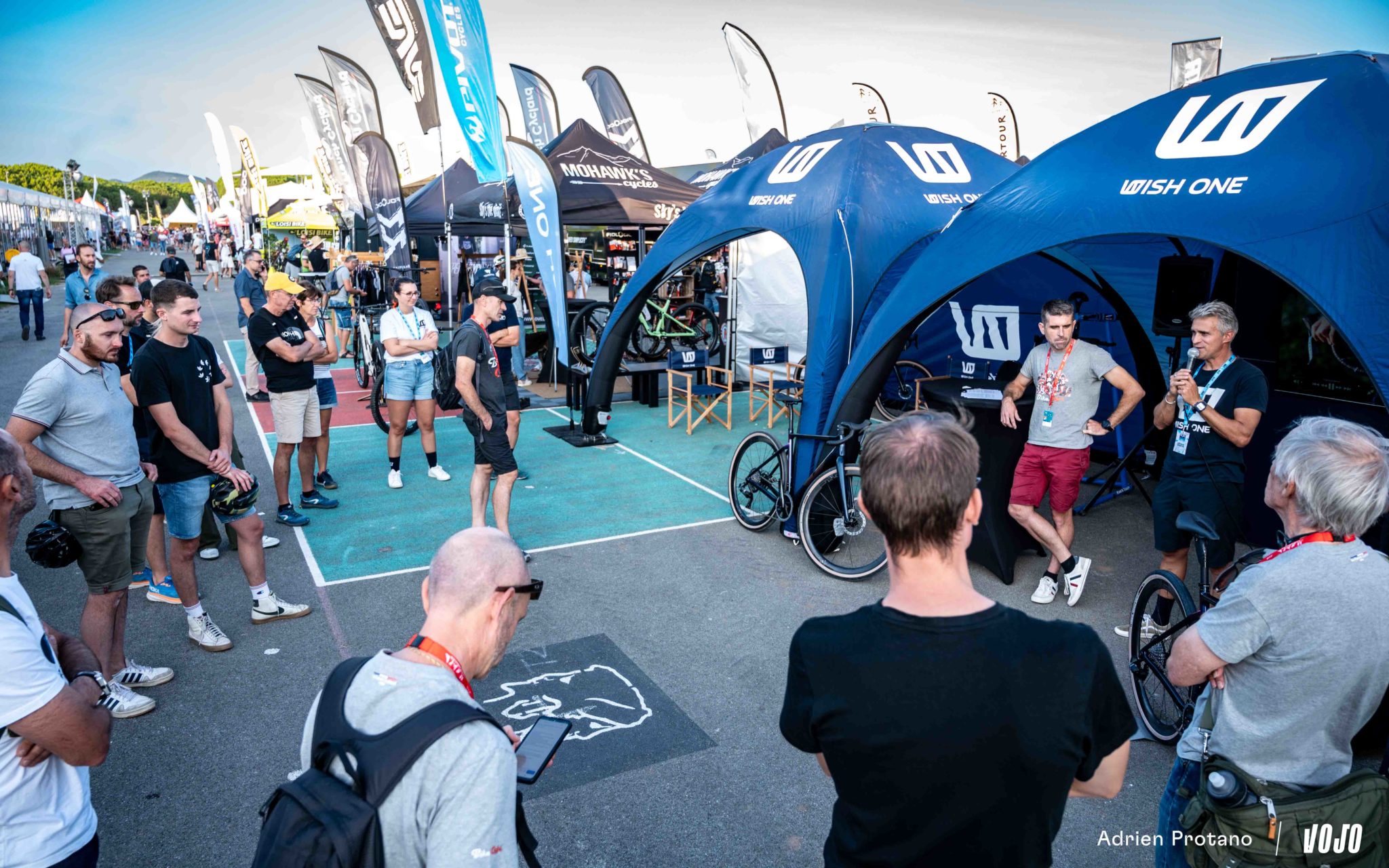 Jeudi, 18h, c’est au stand de la marque française Wish One que ça se passe ! Maxime Poisson, l’un des deux fondateurs, présente en personne le SUB, un nouveau châssis destiné au gravel.