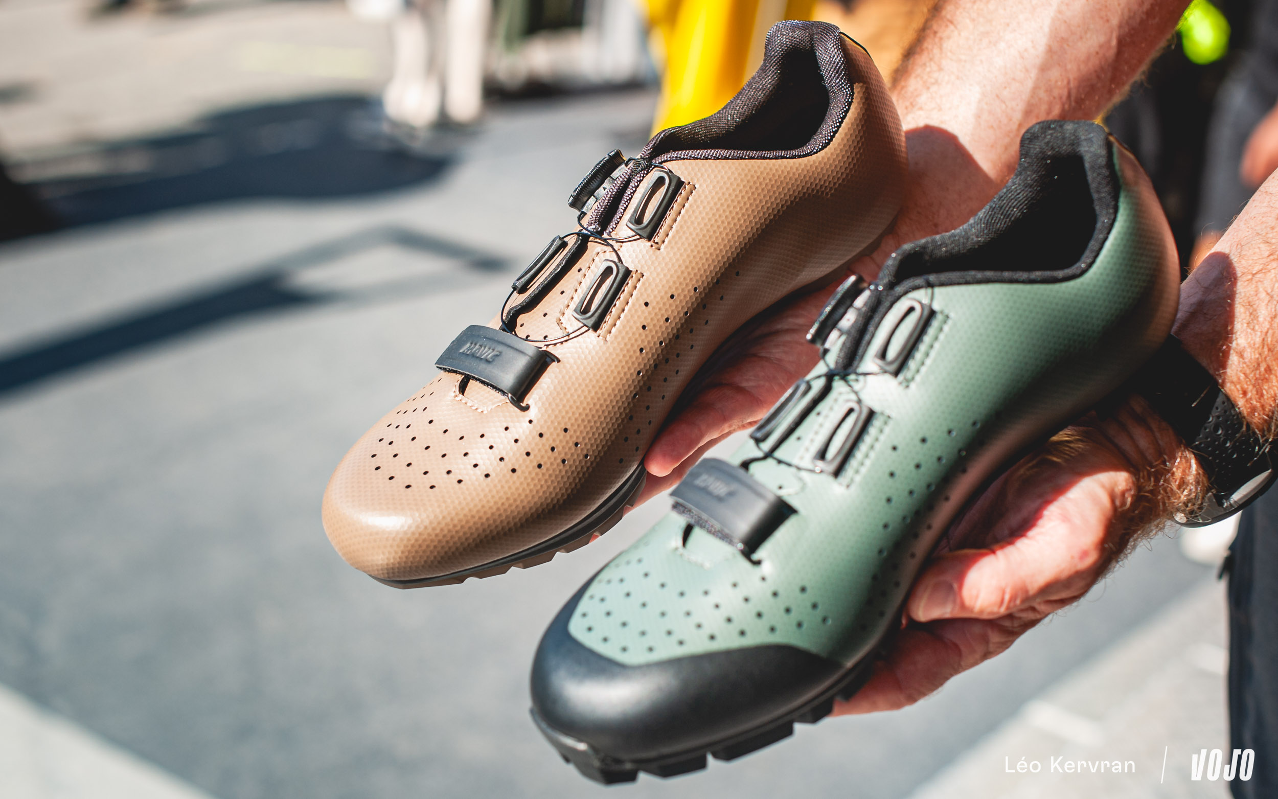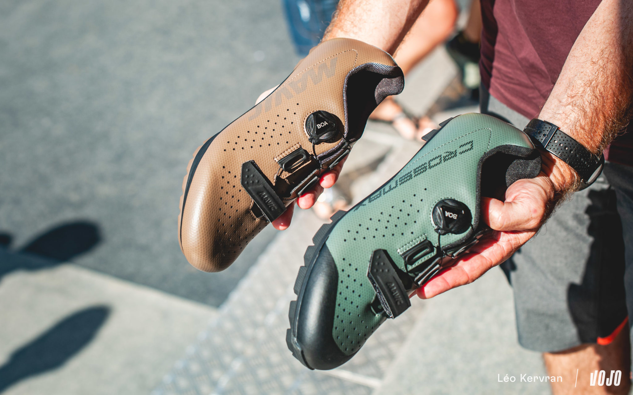 Les chaussures (en marron ci-dessus) appartiennent elles à la gamme Cosmic, une famille bien connue dans les produits « route » de Mavic. Néanmoins, ce sont bien des chaussures pensée pour le gravel, avec une fixation de cale type SPD et non à 3 points.