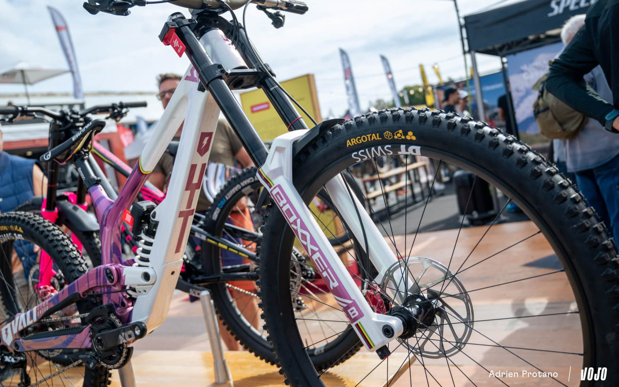 De l’autre côté du spectre, le Bullit se pare d’un coloris « éclats de peinture violet » pour le show et d’une grosse Fox Podium. On vous détaille ce matos juste ici : Test nouveauté VTTAE | Santa Cruz Bullit 2025 : l’évolution d’un monstre et Test nouveauté | Fox Podium : la révolution inversée ?