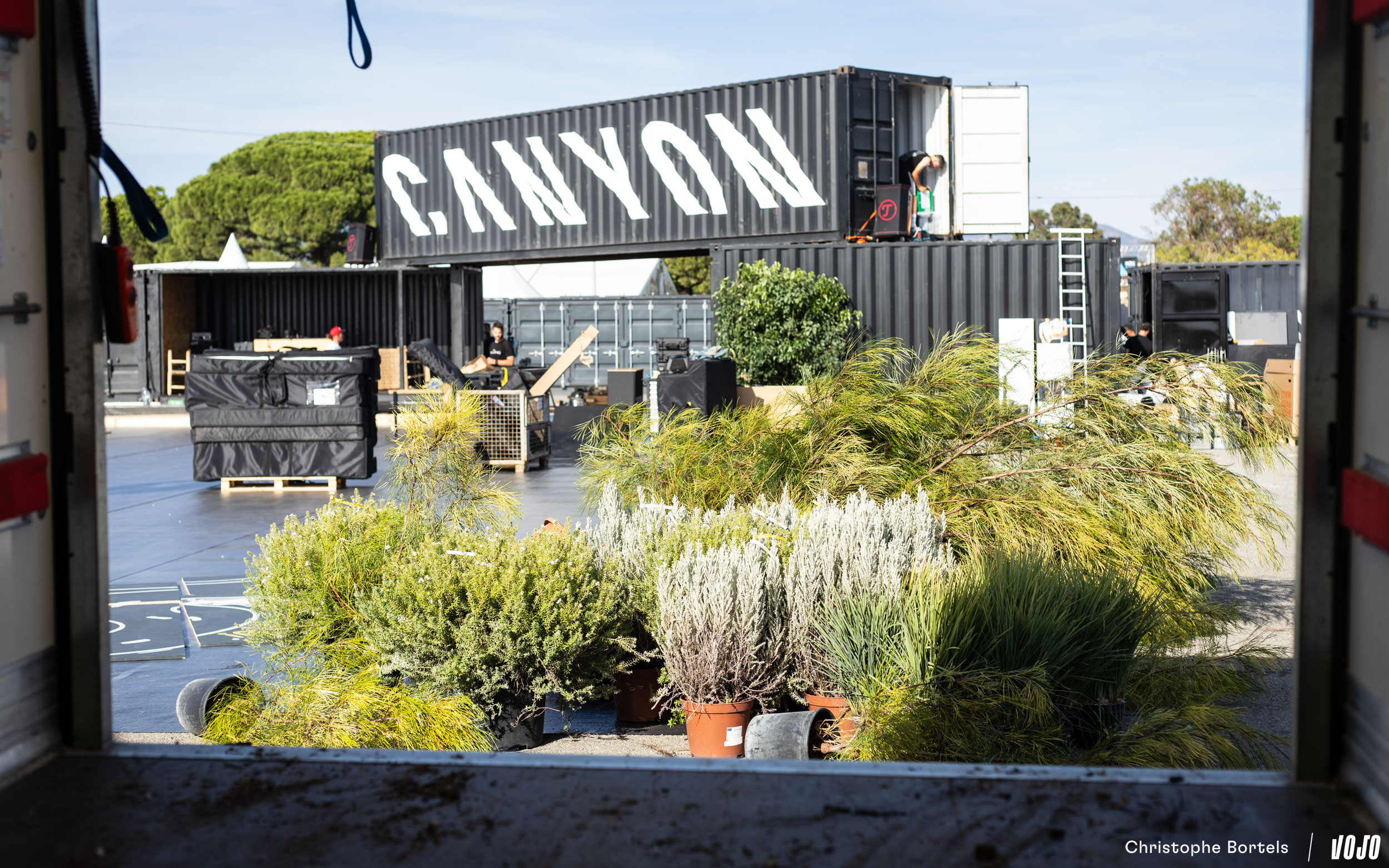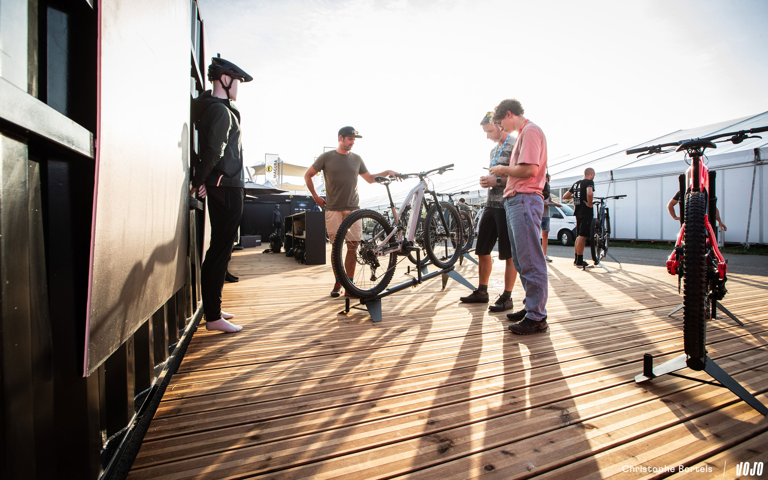 Coupe de bois, ajustement de planches, mise à niveau : à l’avant-veille de l’ouverture du salon, ça s’active sur les 900 m2 du stand de Canyon, de loin le plus grand du salon du Roc d’Azur. Pas moins de 15 personnes sont mobilisées dès le lundi et durant trois jours pour mettre en place les différentes structures qui composent l’espace d’expo du géant allemand. Et l’accent est mis sur la durabilité avec un maximum d’éléments qui peuvent être réutilisés sur d’autres évènements. Pour l’anecdote, alors qu’il aura fallu trois jours pour le monter, à la fermeture du salon le stand sera démonté en… 4 heures !