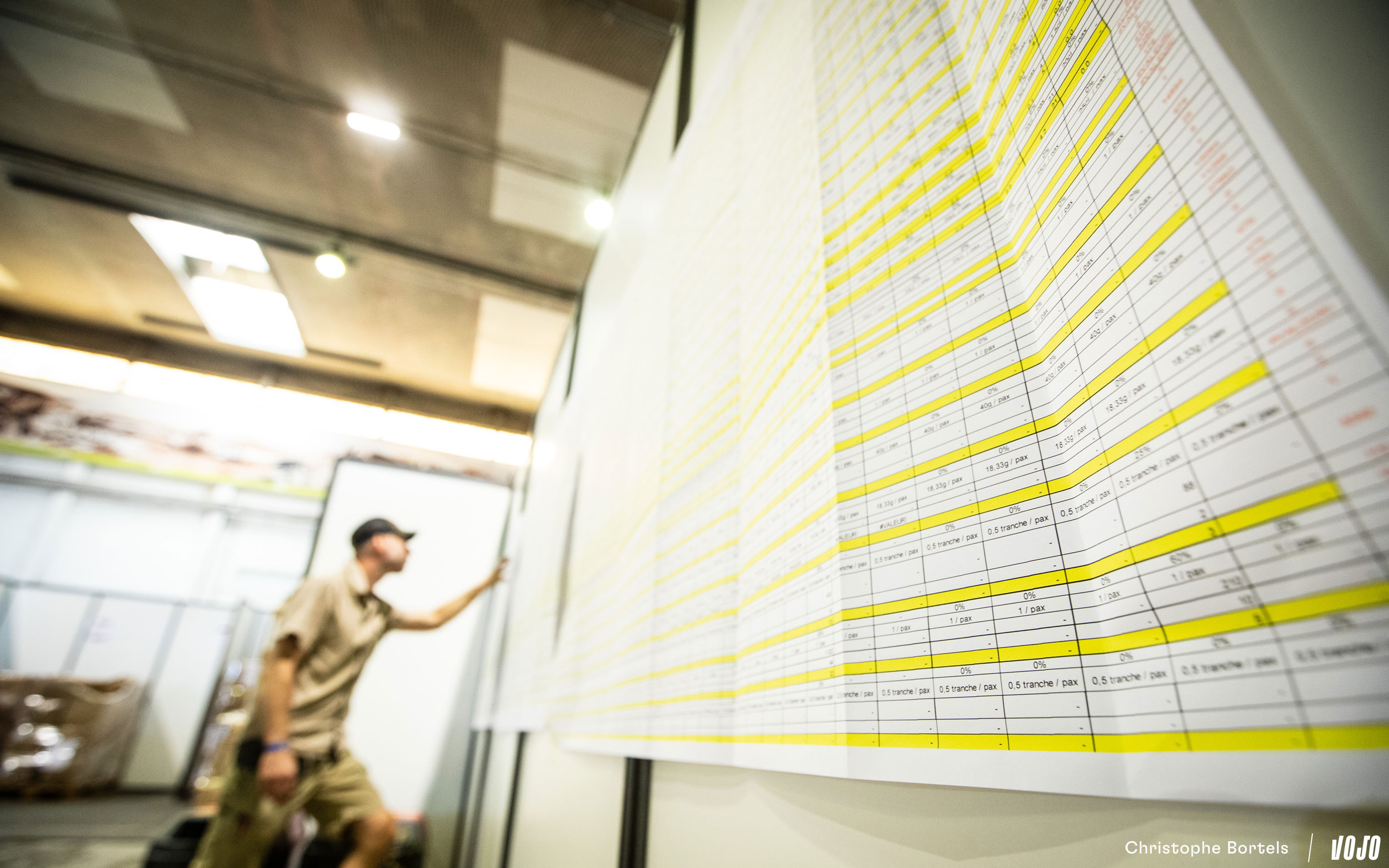 Pendant cet inventaire du stock logistique, notre regard est attiré par un immense tableau affiché au mur. Fruit d’un long processus d’analyse, il permet d’organiser les ravitaillements et de répartir les marchandises – nourriture et boissons – en fonction du nombre de participants qui sont attendus chaque jour à chaque ravitaillement. Des calculs sont ainsi réalisés pour déterminer quelle quantité de tel produit ou telle boisson doit être envoyée à tel ravitaillement.