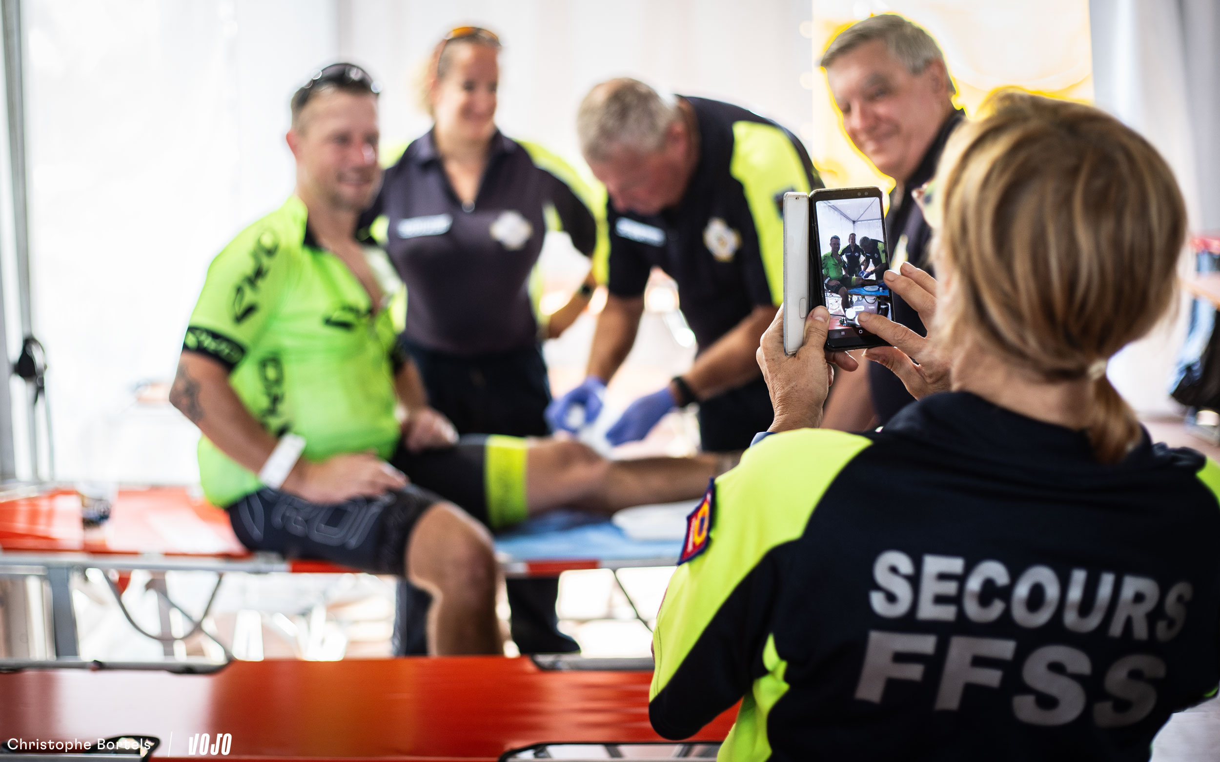 En plus de ces dispositifs disséminés sur les parcours, un poste de secours est placé stratégiquement au niveau de l’arrivée sur la Base Nature, où se terminent quasi toutes les épreuves. Ici, les pompiers et la protection civile enregistrent les blessés (jusqu’à 200 sur les plus grosses journées du Roc) puis les redirigent soit juste à côté pour les petits bobos, soit vers le poste médical avancé (PMA) en cas de blessure plus importante (suspicion de fracture de la clavicule, etc). Ce PMA est installé à côté de la caserne des pompiers, à l’entrée de la Base Nature, où l’on retrouve également le PC course, véritable coeur du dispositif où sont coordonnés en temps réel tous les services à l’oeuvre sur le Roc d’Azur.
