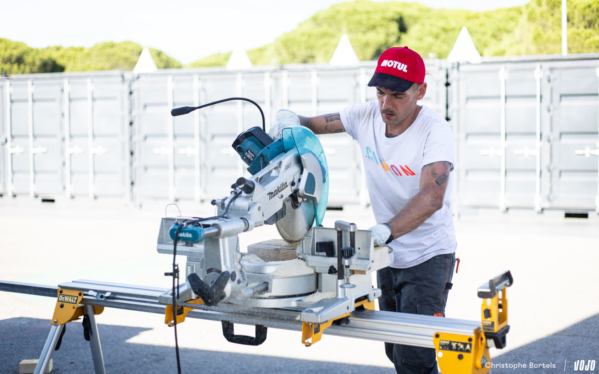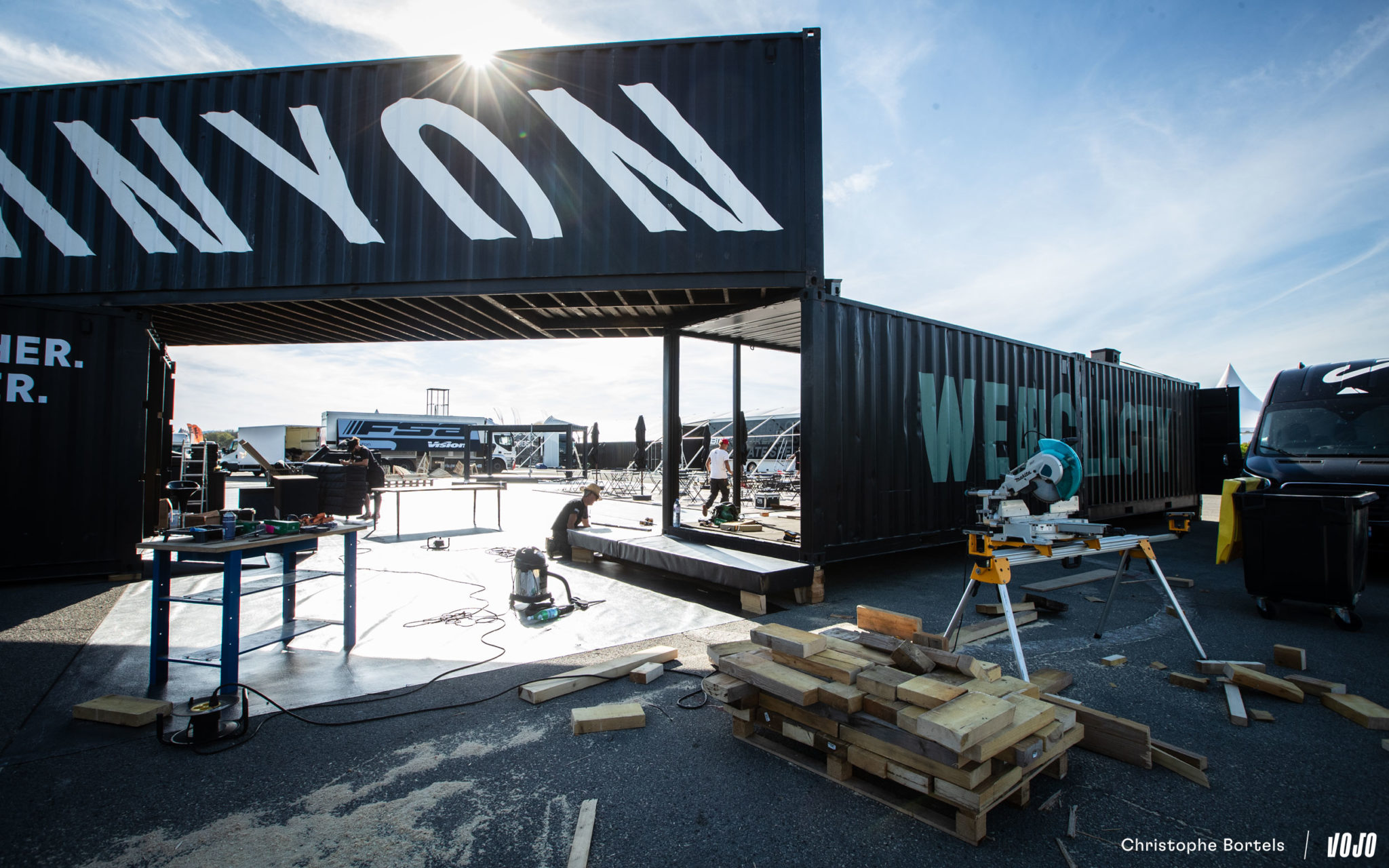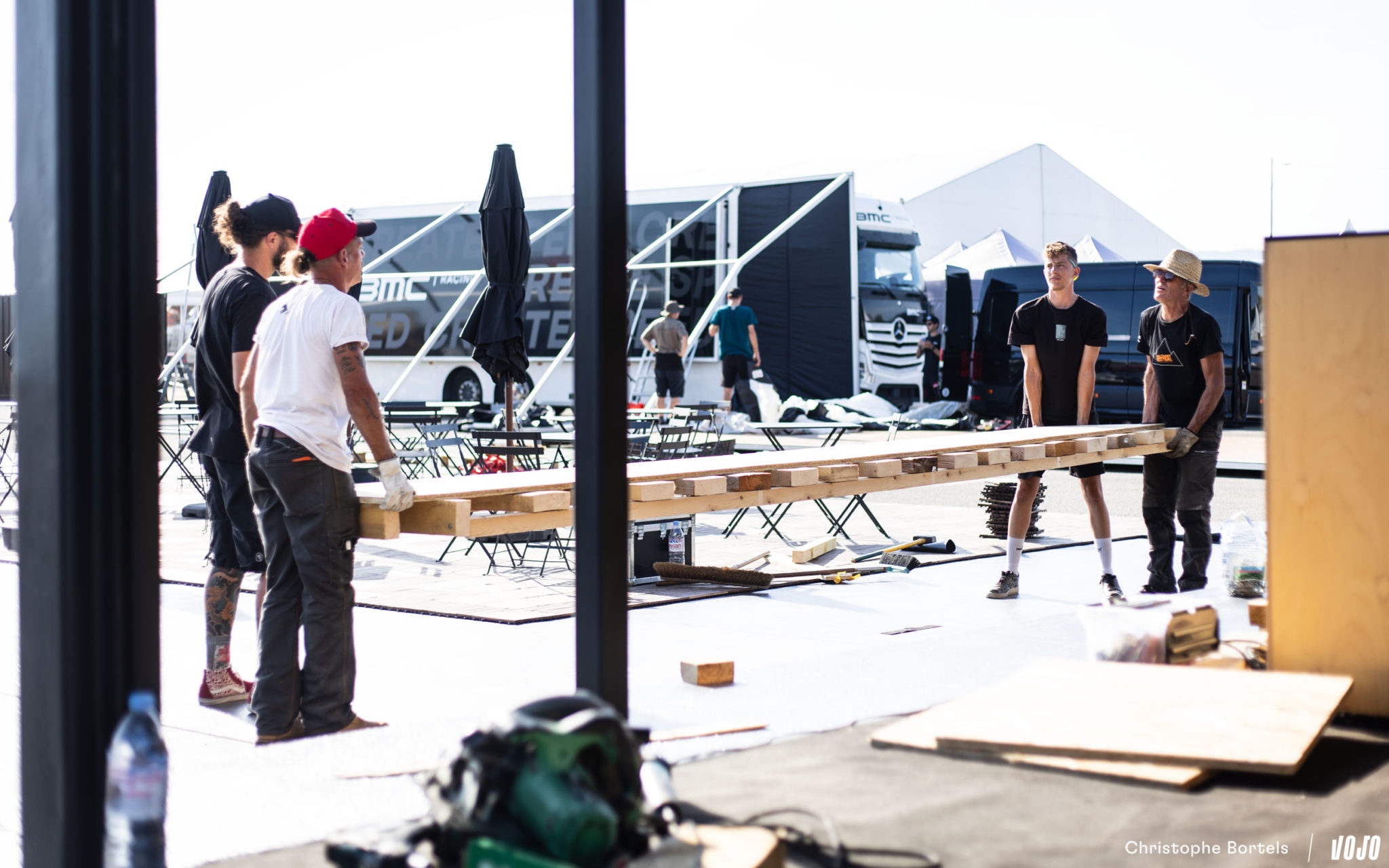 Coupe de bois, ajustement de planches, mise à niveau : à l’avant-veille de l’ouverture du salon, ça s’active sur les 900 m2 du stand de Canyon, de loin le plus grand du salon du Roc d’Azur. Pas moins de 15 personnes sont mobilisées dès le lundi et durant trois jours pour mettre en place les différentes structures qui composent l’espace d’expo du géant allemand. Et l’accent est mis sur la durabilité avec un maximum d’éléments qui peuvent être réutilisés sur d’autres évènements. Pour l’anecdote, alors qu’il aura fallu trois jours pour le monter, à la fermeture du salon le stand sera démonté en… 4 heures !