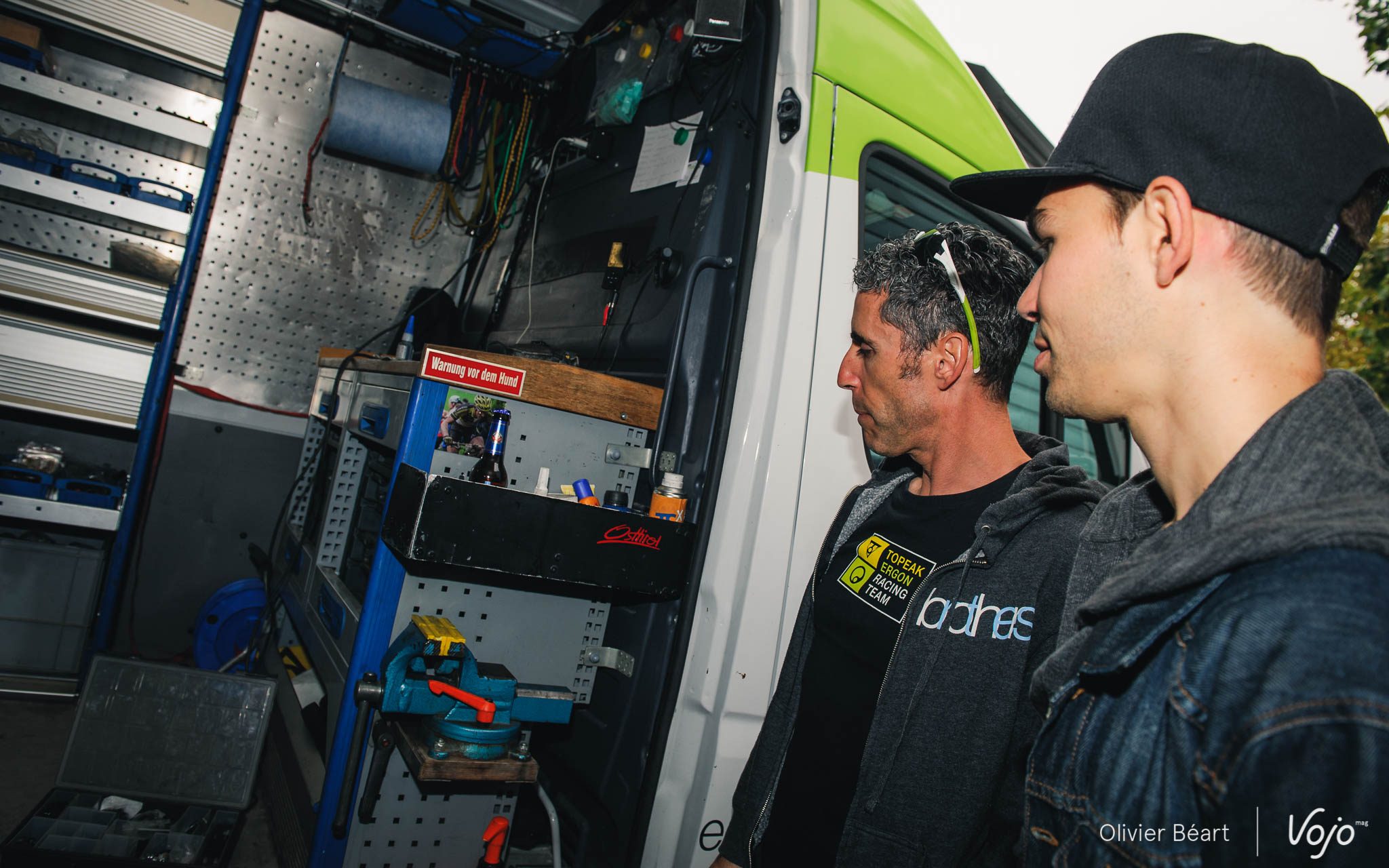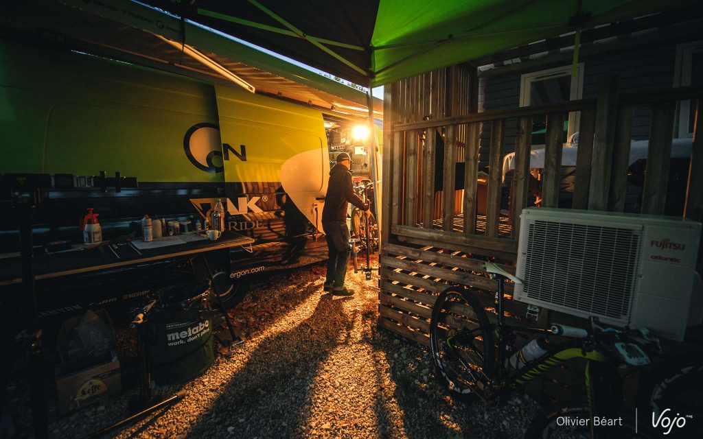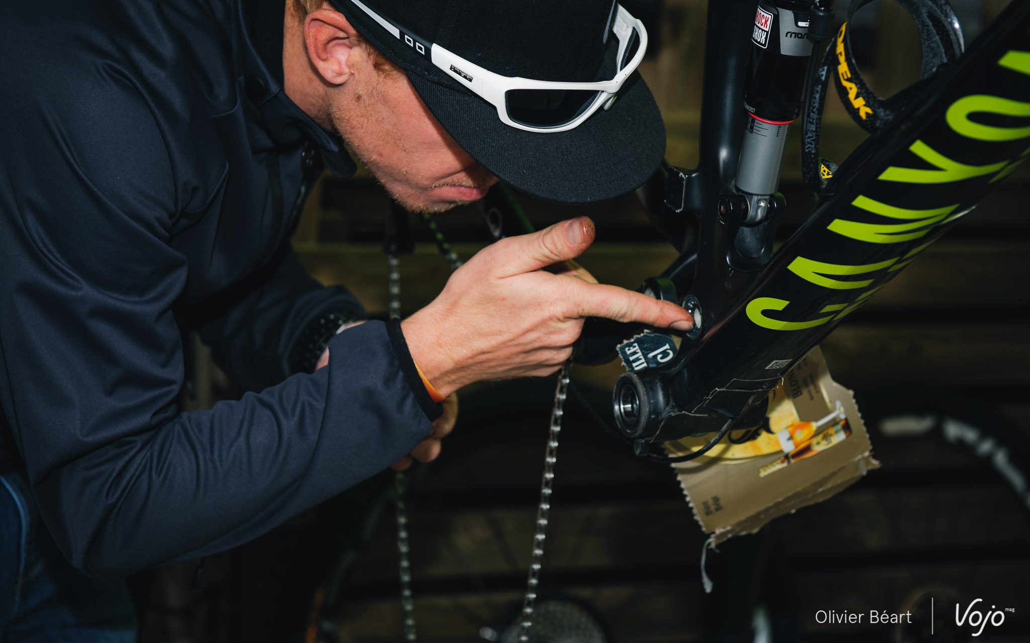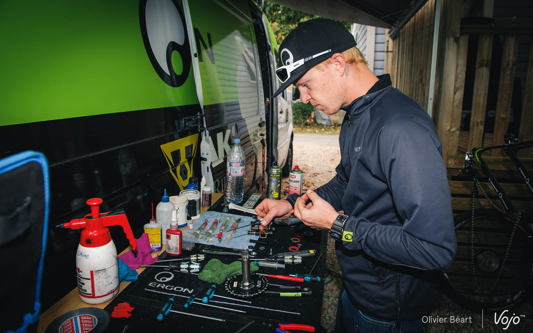 De son côté, le mécano du team démonte entièrement les vélos pour s’assurer que tout est en ordre.