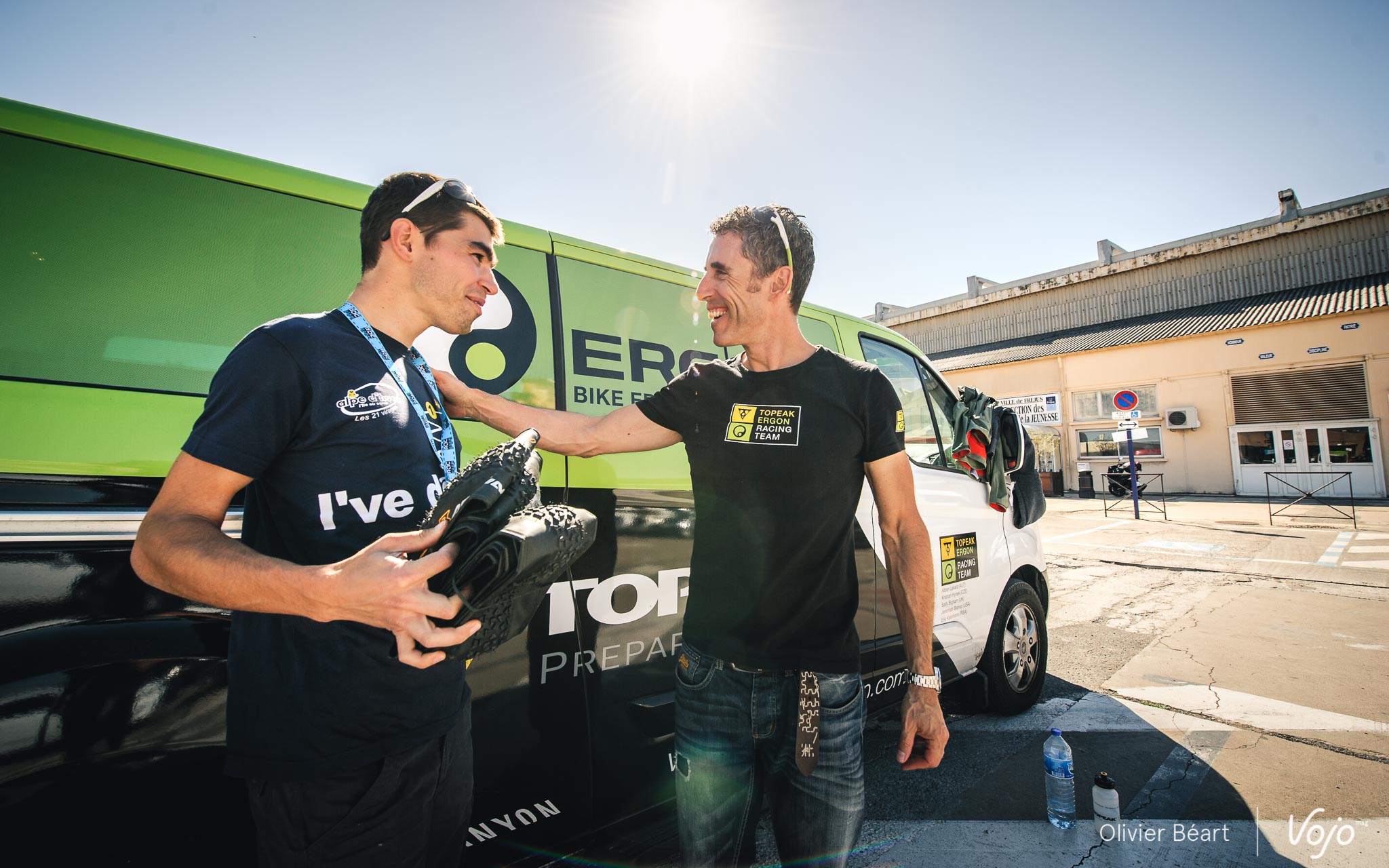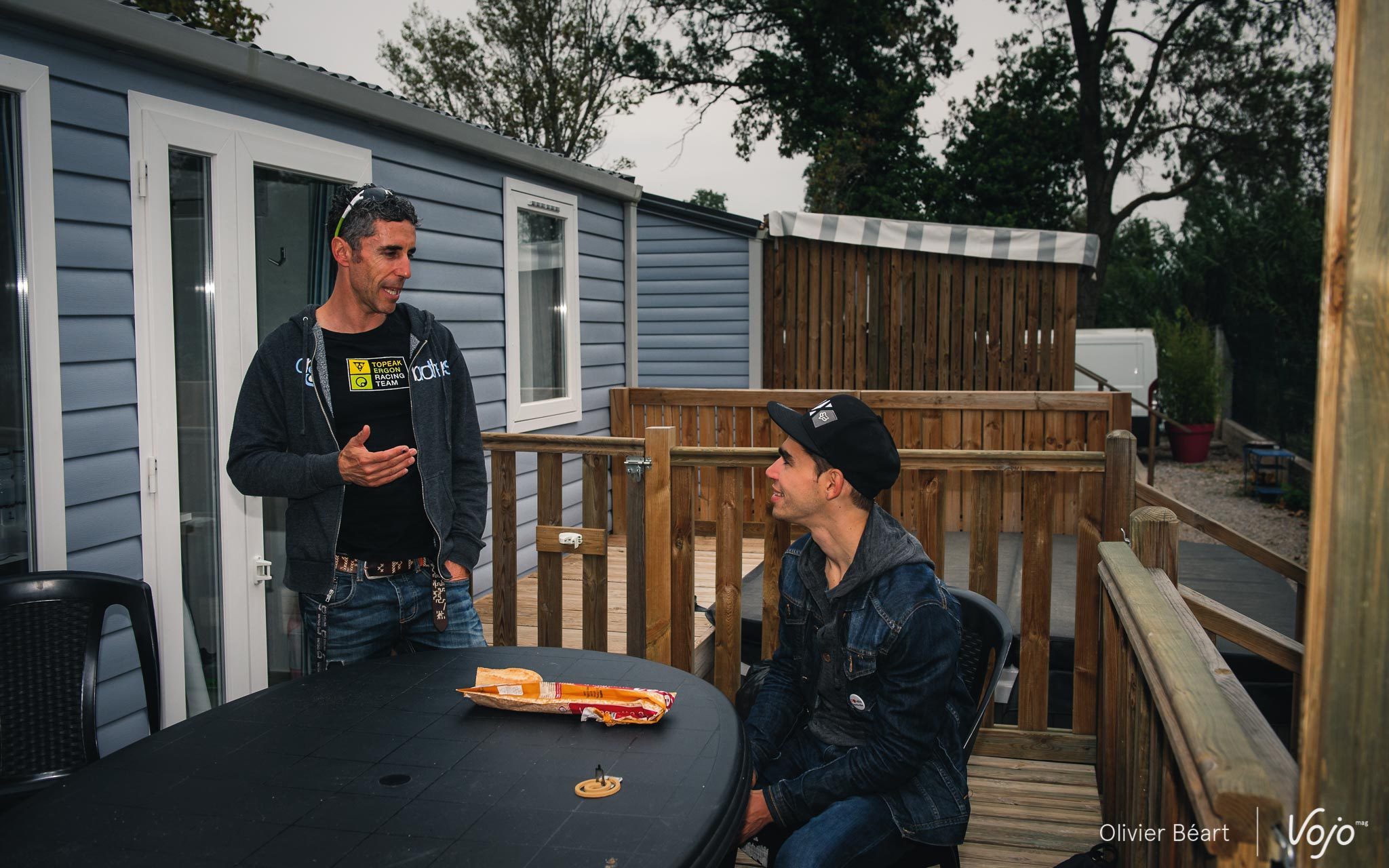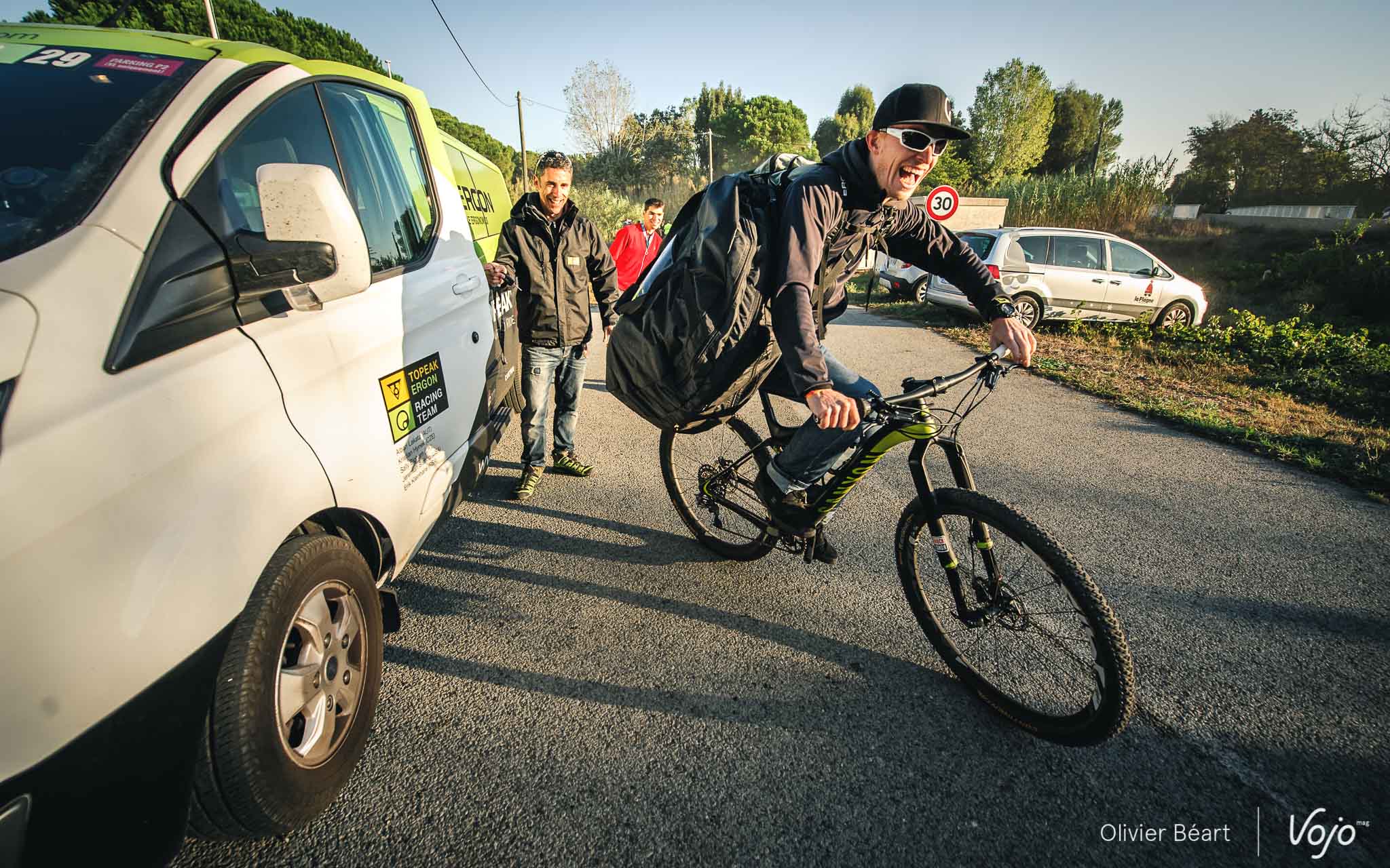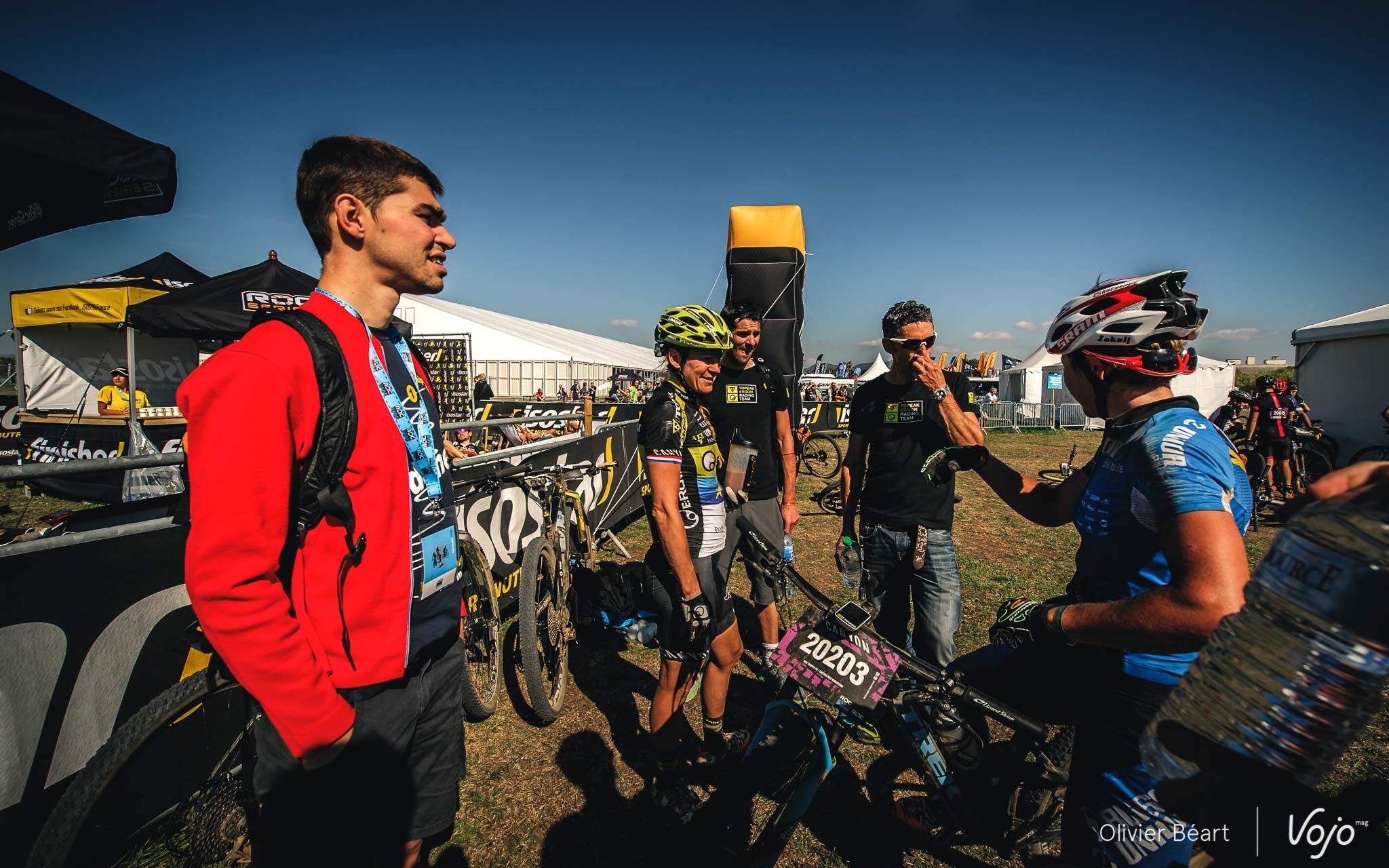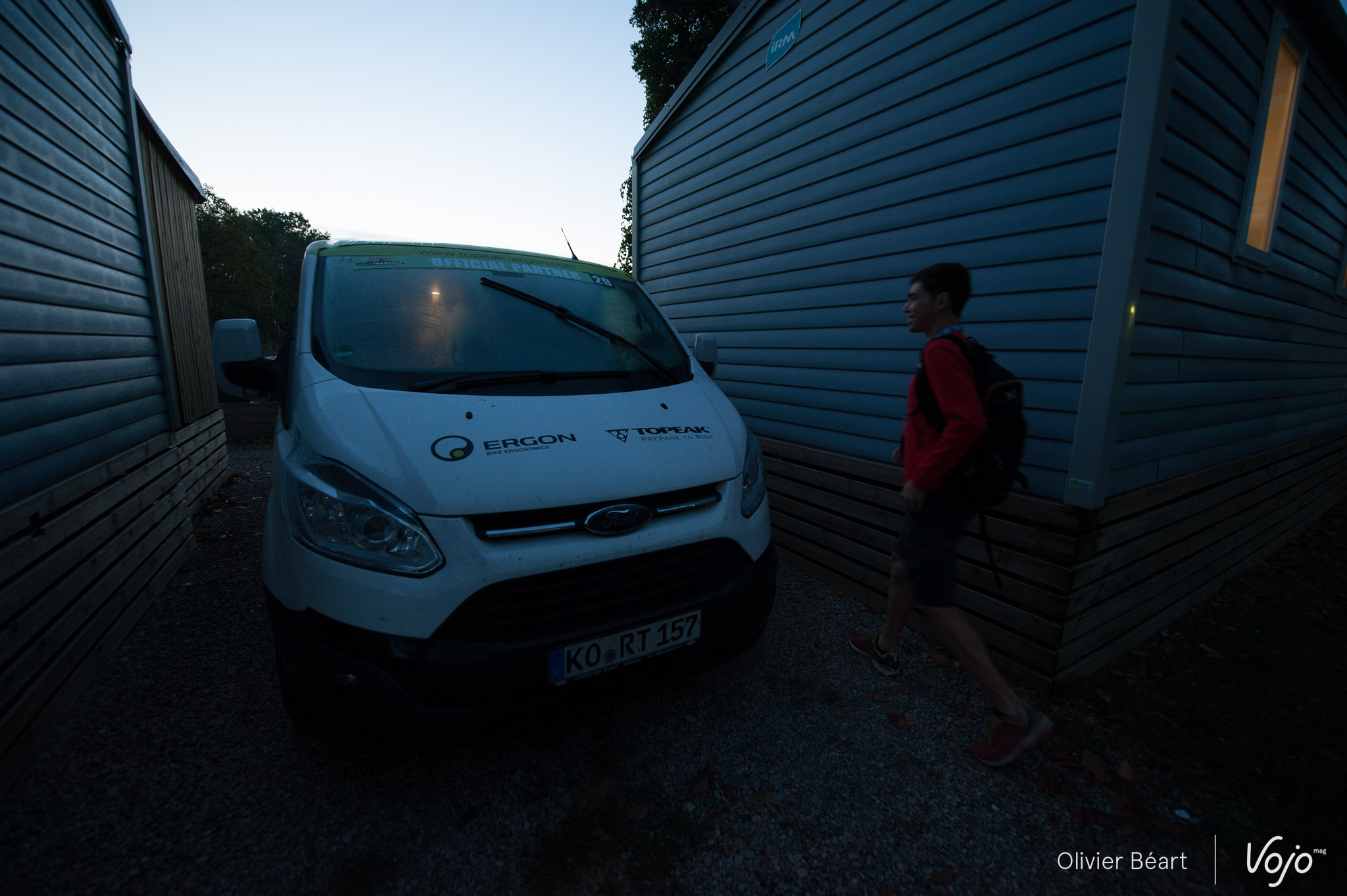 Benjamin est lecteur de Vojo et fan de marathon. Deux qualité qui lui ont permis, après nous avoir remis une fort belle candidature illustrée de photos humoristiques, d’être l’heureux invité du team Topeak-Ergon pour suivre le Roc Marathon d’une façon un peu particulière, en étant purement et simplement incorporé au staff le temps d’un week-end ! La veille de la course, nous faisons connaissance avec l’heureux élu, qui est présenté illico au manager de l’équipe, Dave (au centre de l’image principale), en train de prendre un petit café sur le stand Canyon.