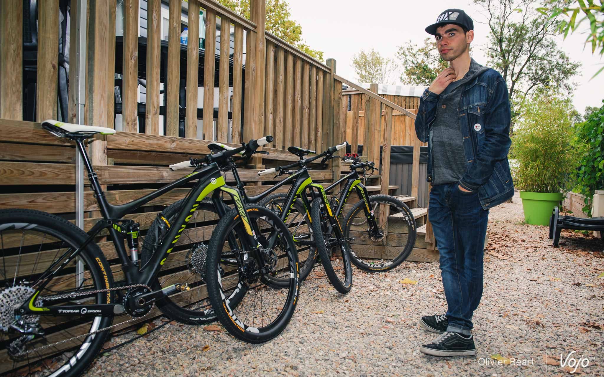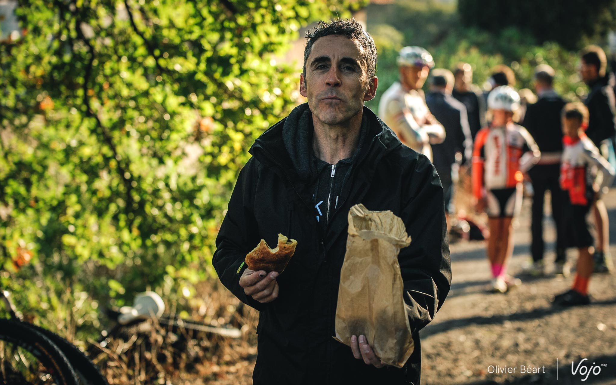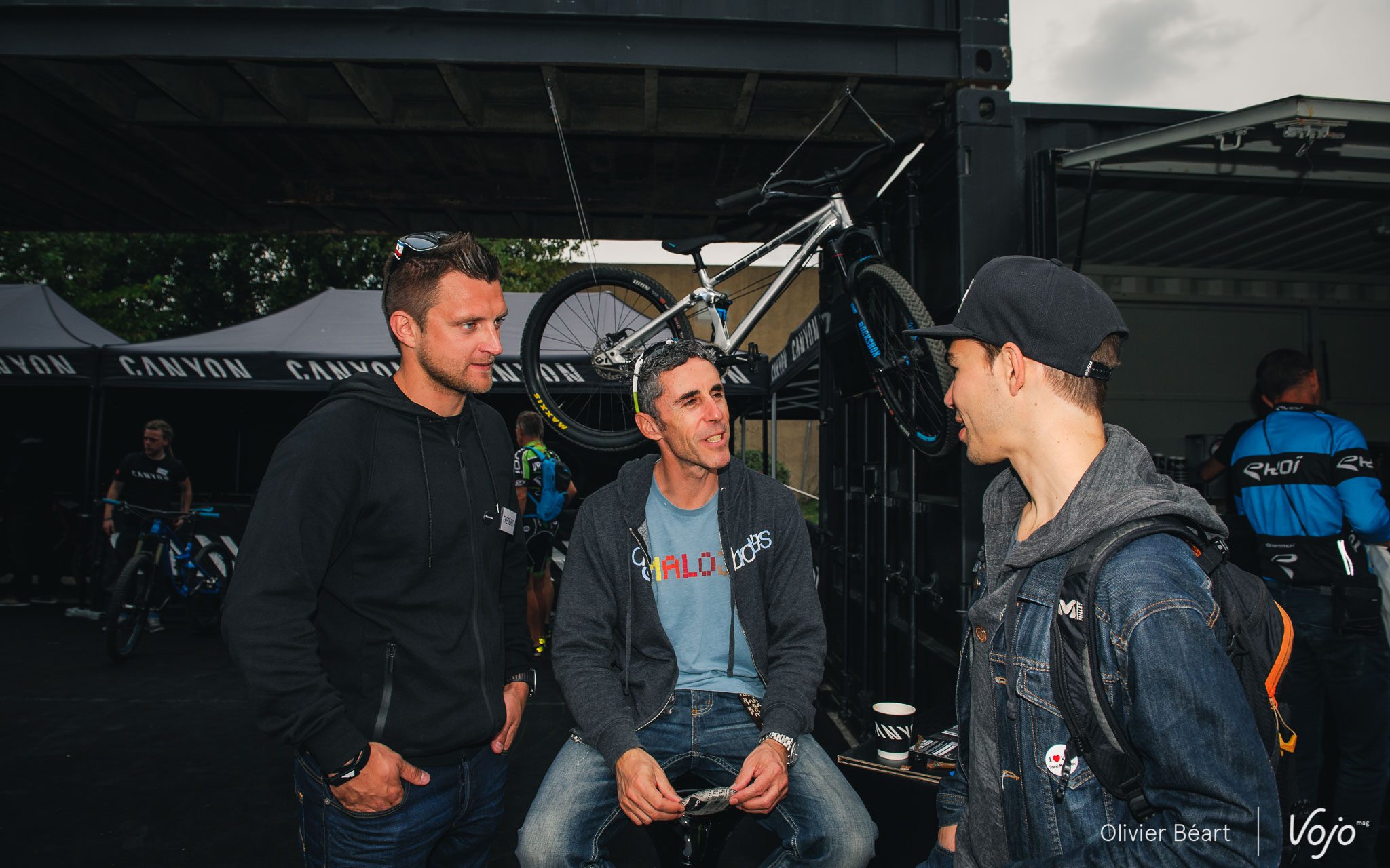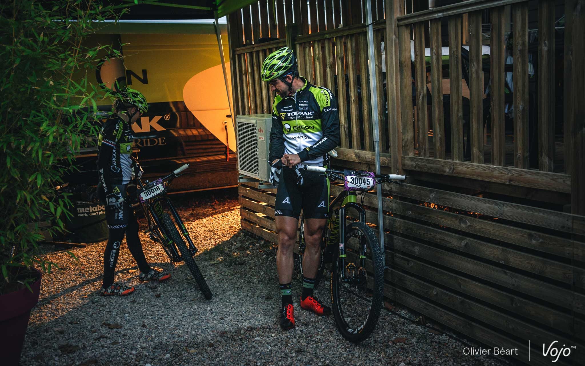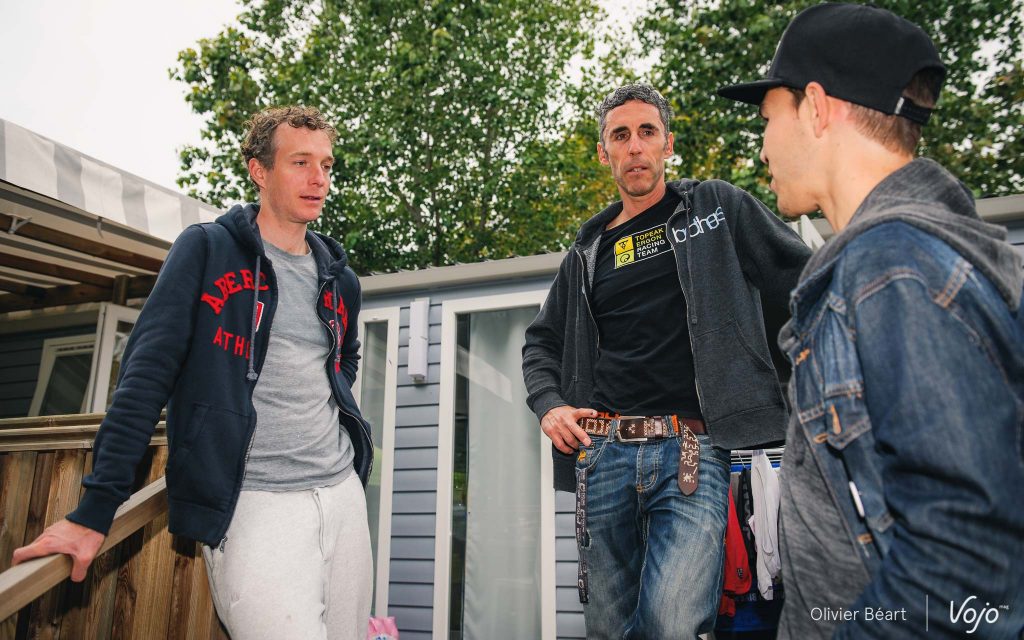 Benjamin est lecteur de Vojo et fan de marathon. Deux qualité qui lui ont permis, après nous avoir remis une fort belle candidature illustrée de photos humoristiques, d’être l’heureux invité du team Topeak-Ergon pour suivre le Roc Marathon d’une façon un peu particulière, en étant purement et simplement incorporé au staff le temps d’un week-end ! La veille de la course, nous faisons connaissance avec l’heureux élu, qui est présenté illico au manager de l’équipe, Dave (au centre de l’image principale), en train de prendre un petit café sur le stand Canyon.