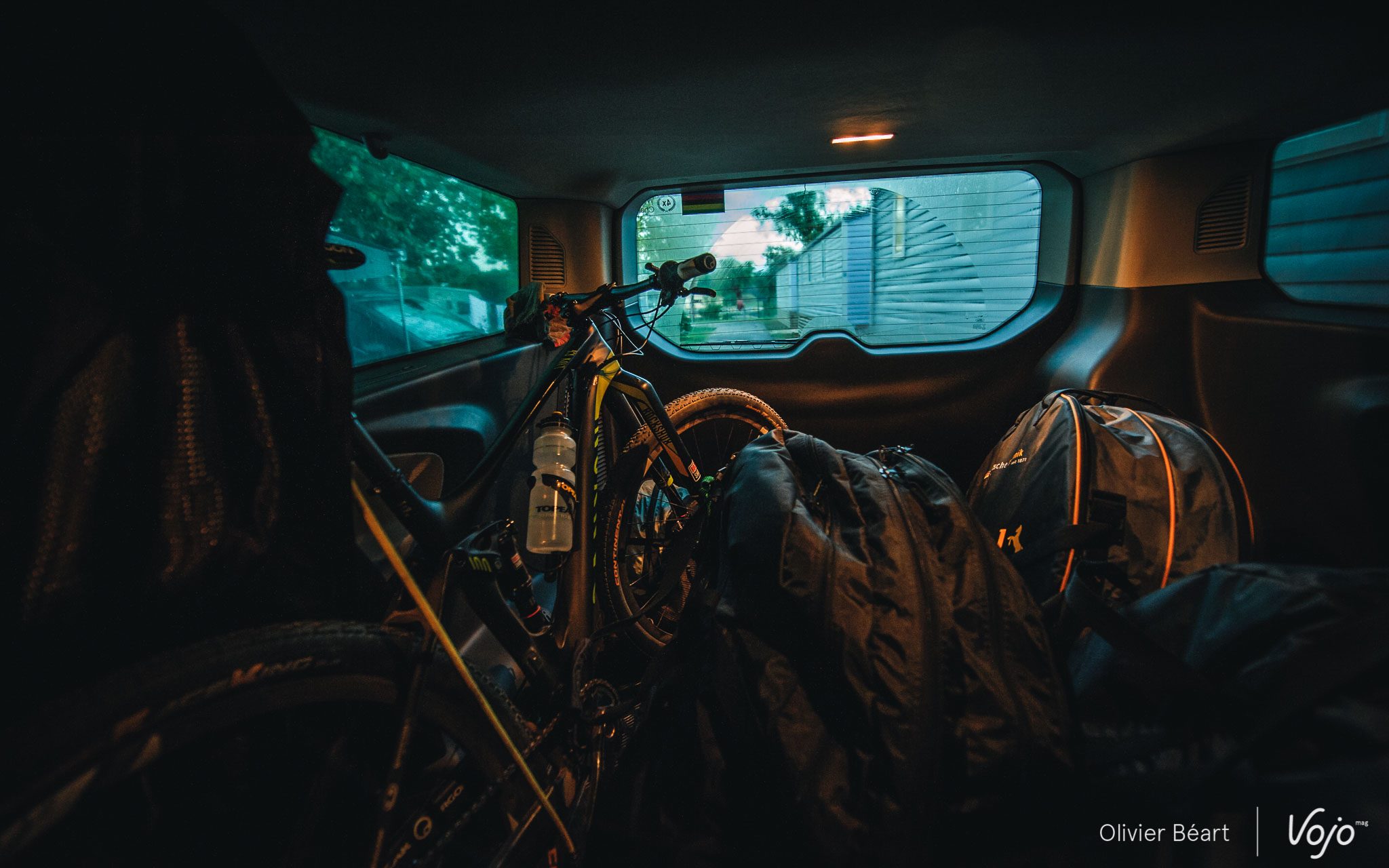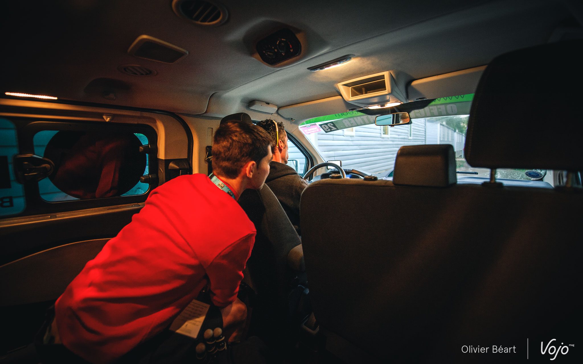 De son côté, Benjamin prend place dans la voiture de l’équipe avec Dave et le mécanicien. Dans le coffre, c’est plein à craquer de matériel. Côté bande son, c’est Black Sabbath et Motorhead en provenance directe du téléphone de Dave. Yeah !