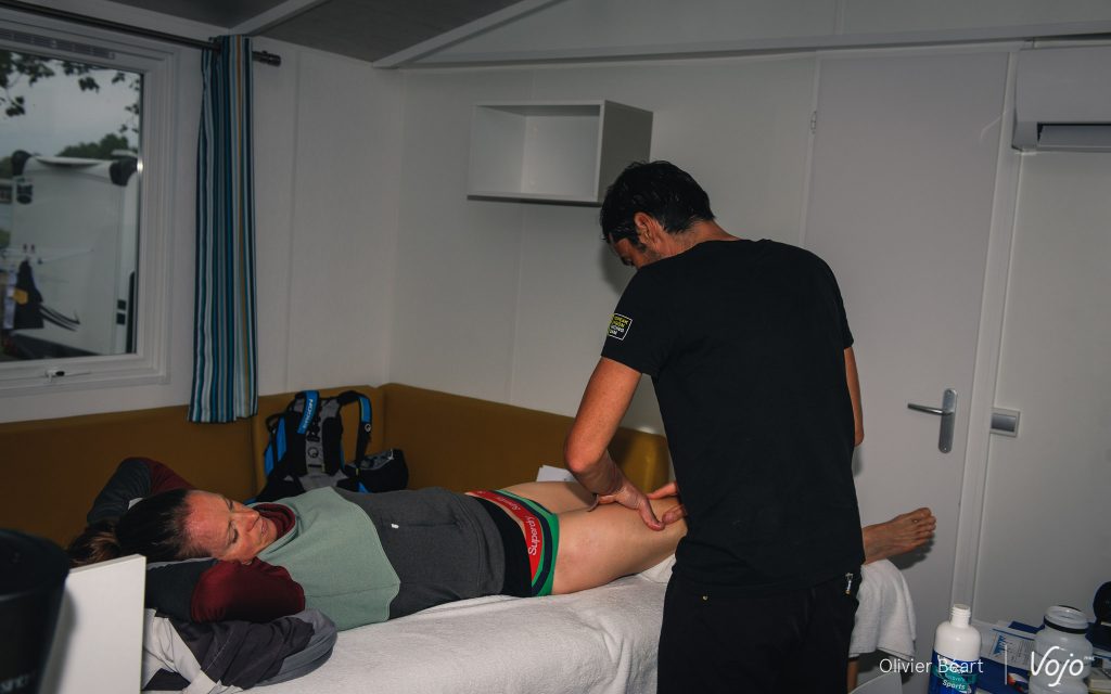 Pendant ce temps, Sally Bigham est au massage, Alban Lakata se repose et Christian Hynek, très détendu, passe un long moment à discuter avec Benjamin qui lui pose un paquet de questions sur son alimentation avant, pendant et après la course.