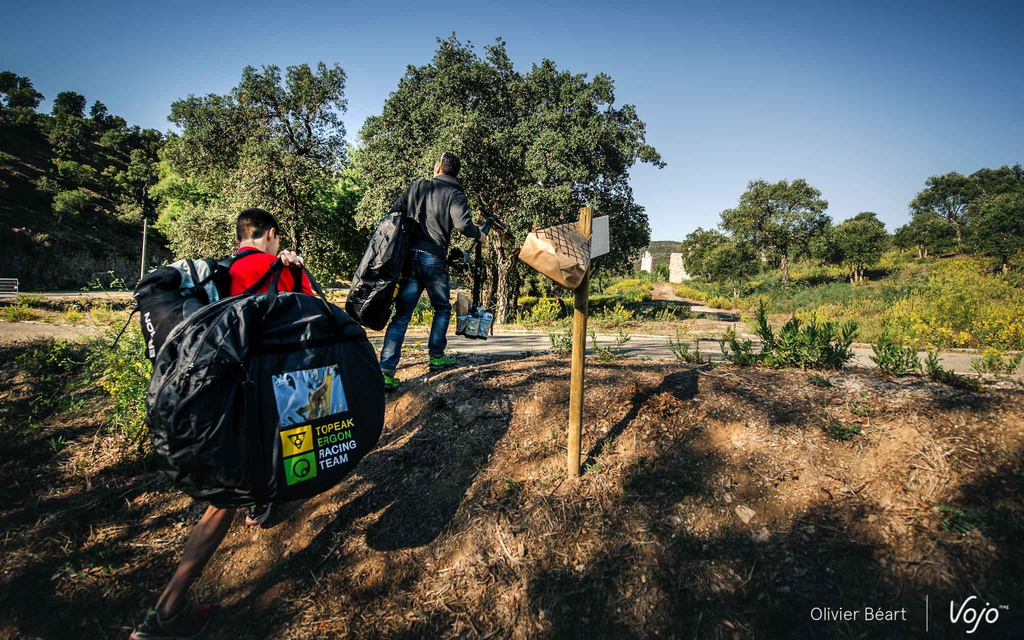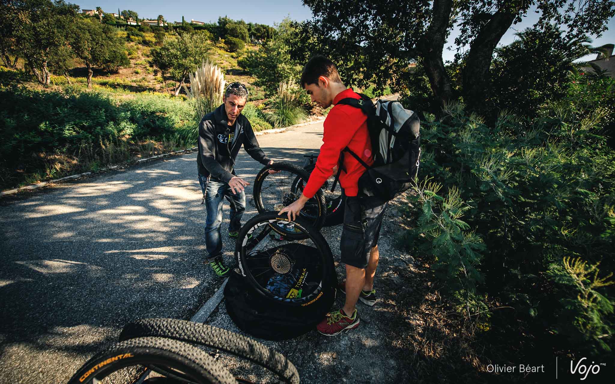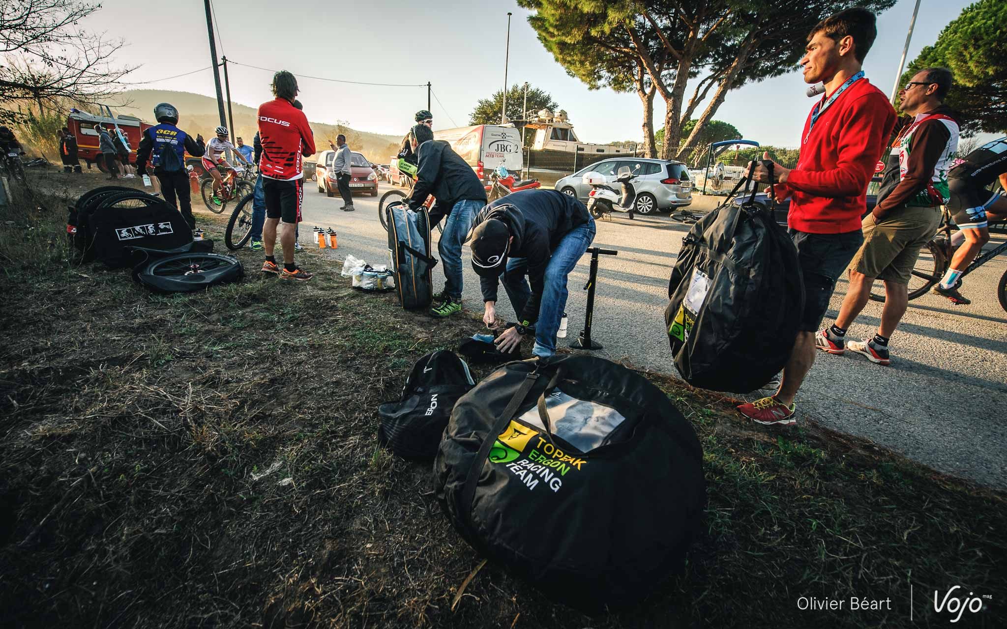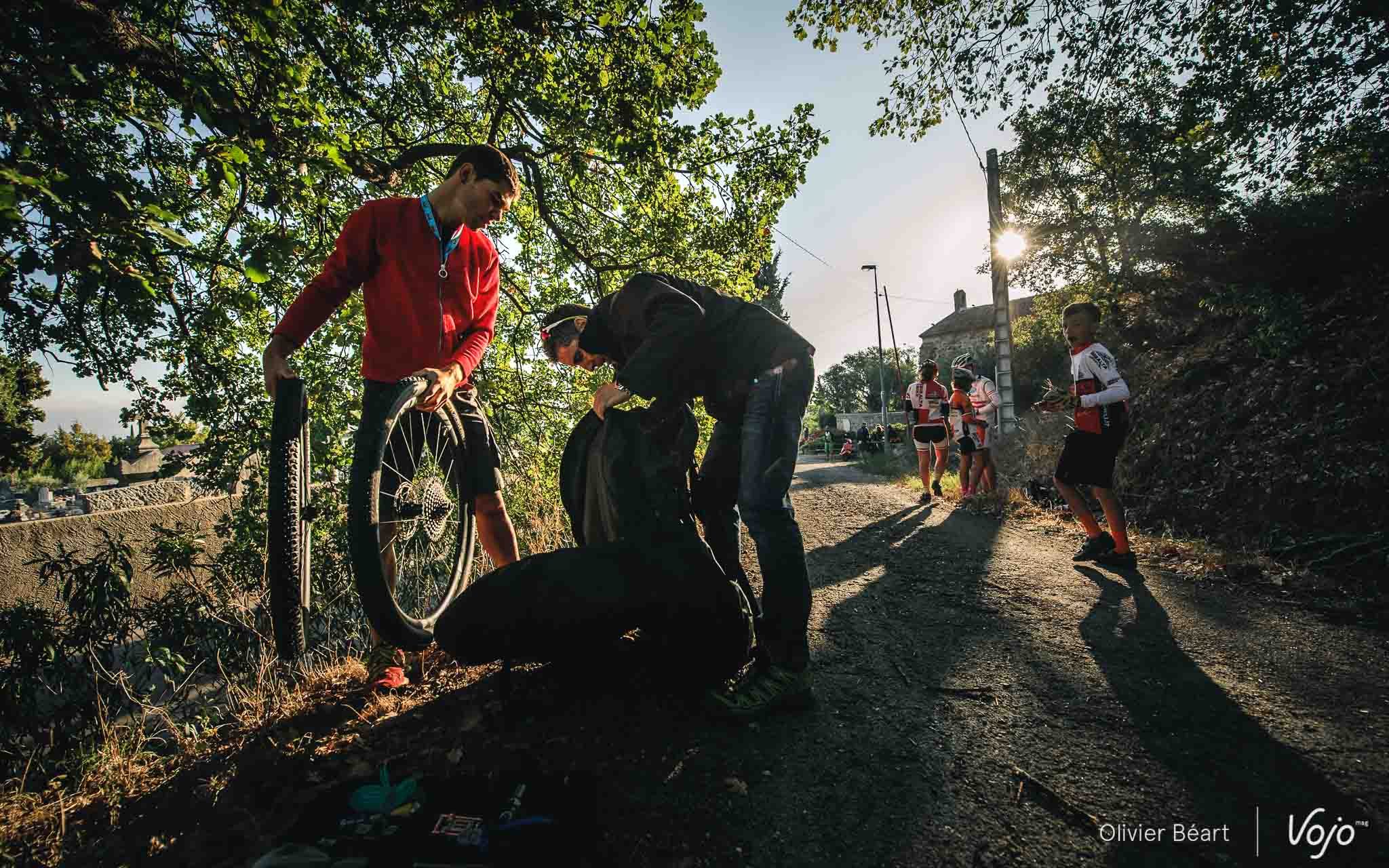 Alors que les coureurs viennent de prendre le départ, Benjamin est déjà mis à contribution pour porter les sacs et mettre en place la première zone d’assistance. Il s’intéresse de près aux jantes et aux pneus utilisés. « Tout le monde roule en carbone dans le team ? Et vos gommes là, ce sont les mêmes que dans le commerce ? «