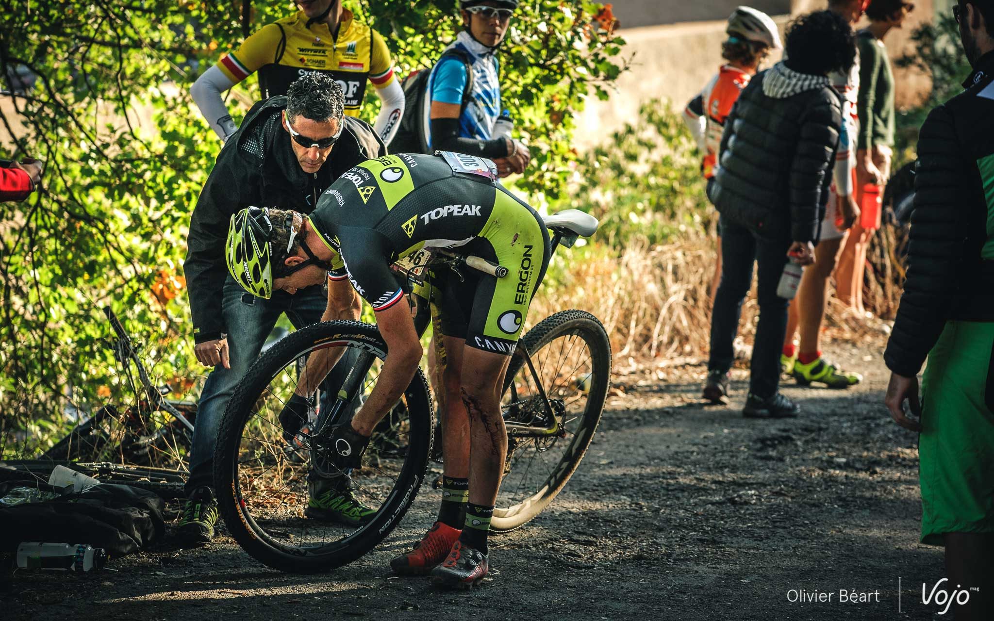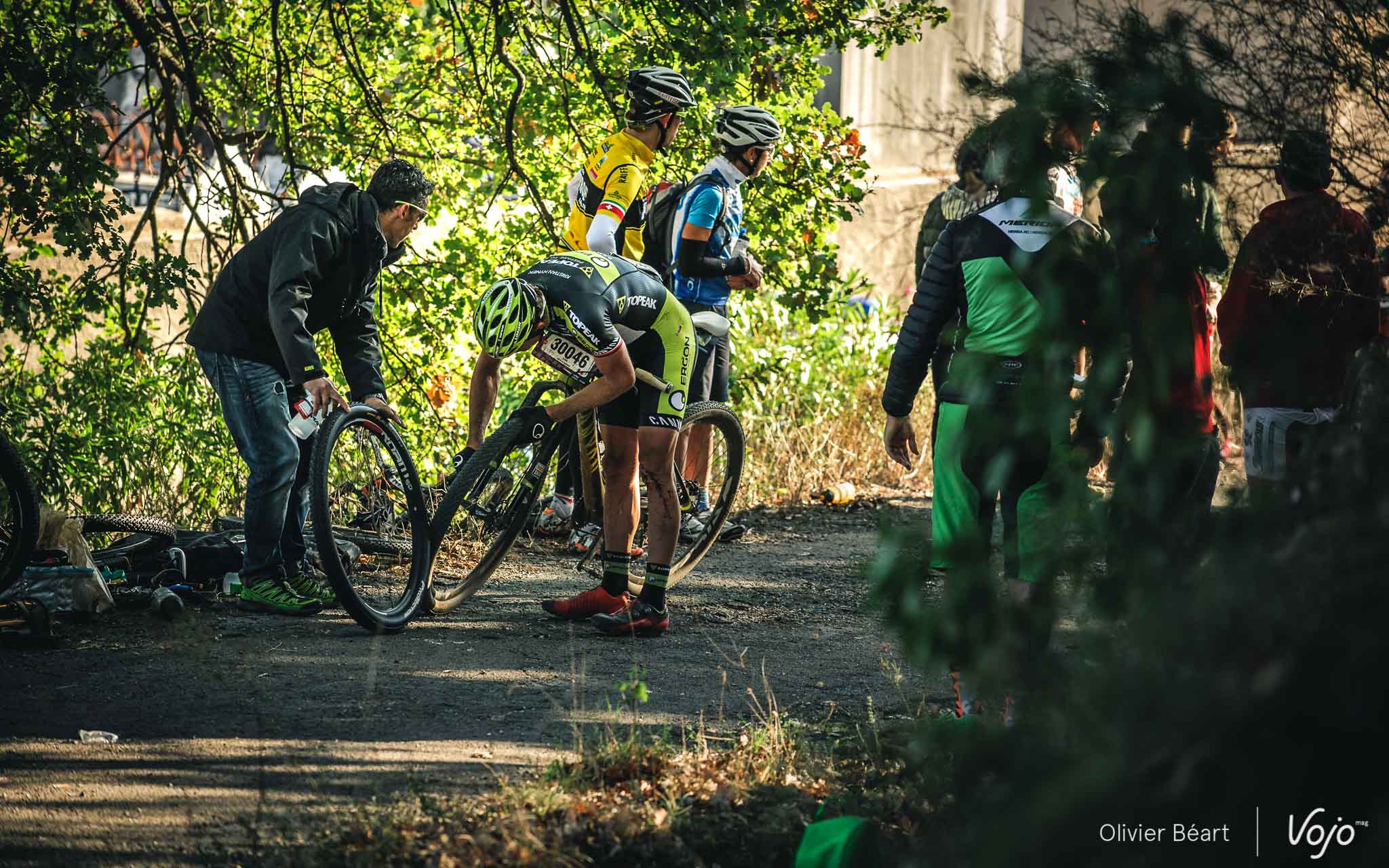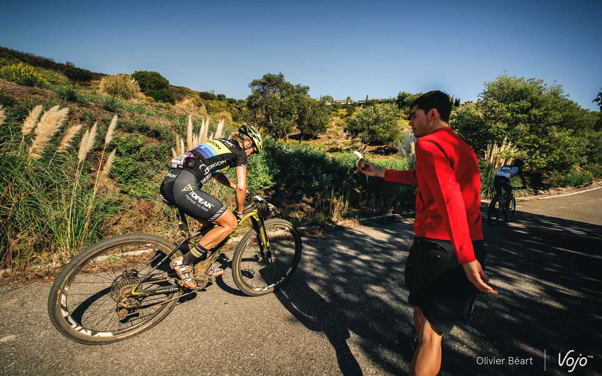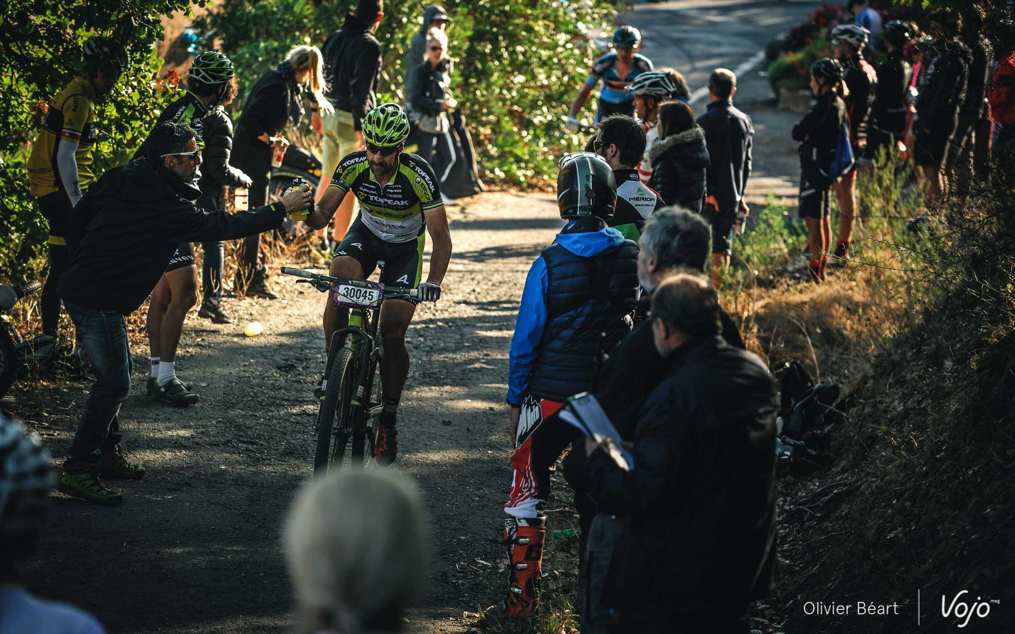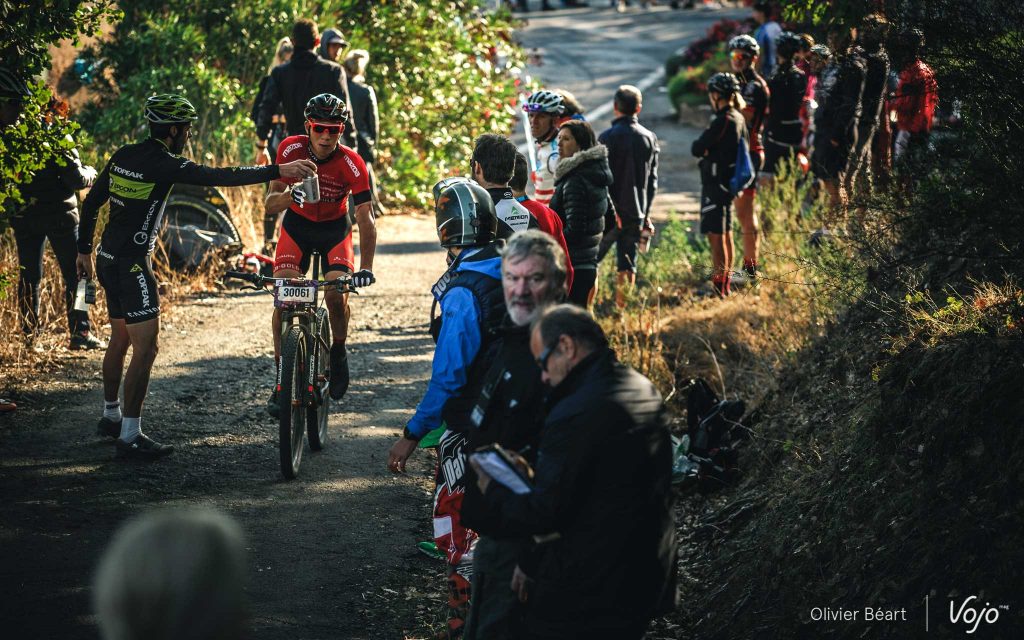 Pendant ce temps-là, la tête de la course, la vraie, arrive. Julien Trarieux est en tête avec Carabin et Medvevev, mais Alban Lakata n’est pas loin. Signe de la bonne ambiance qui règne en marathon, on découvre que l’équipe Topeak-Ergon assure aussi les ravitaillements pour les concurrents de chez Centurion-Vaude. « C’est vital de s’entre-aider. On est rivaux sur la piste mais pas en-dehors, et une course ne doit pas se gagner sur ce genre de chose ».