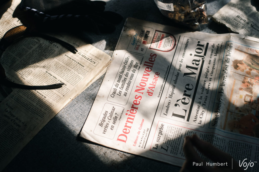 C’est le mois d’Avril qui a été choisi par Débi et Bérengère pour retrouver leurs racines. Petite expédition qu’elles baptisent elles-même « Roots & Roots », notre tour débute sur les hauteurs de Colmar et notre premier stop ravitaillement s’organise dans une cabane à mi-hauteur. Hasard ou coïncidence, des journaux laissés sur places pour allumer un feu nous ramènent 27 années en arrière, jour pour jour, le 11 Avril 1992. L’actualité change assez peu : les britanniques sont indécis, on réfléchit à la préservation des sentiers sur les crêtes vosgiennes, le massif du Mont Sainte-Odile est au coeur des débats et sera notre étape du troisième jour.