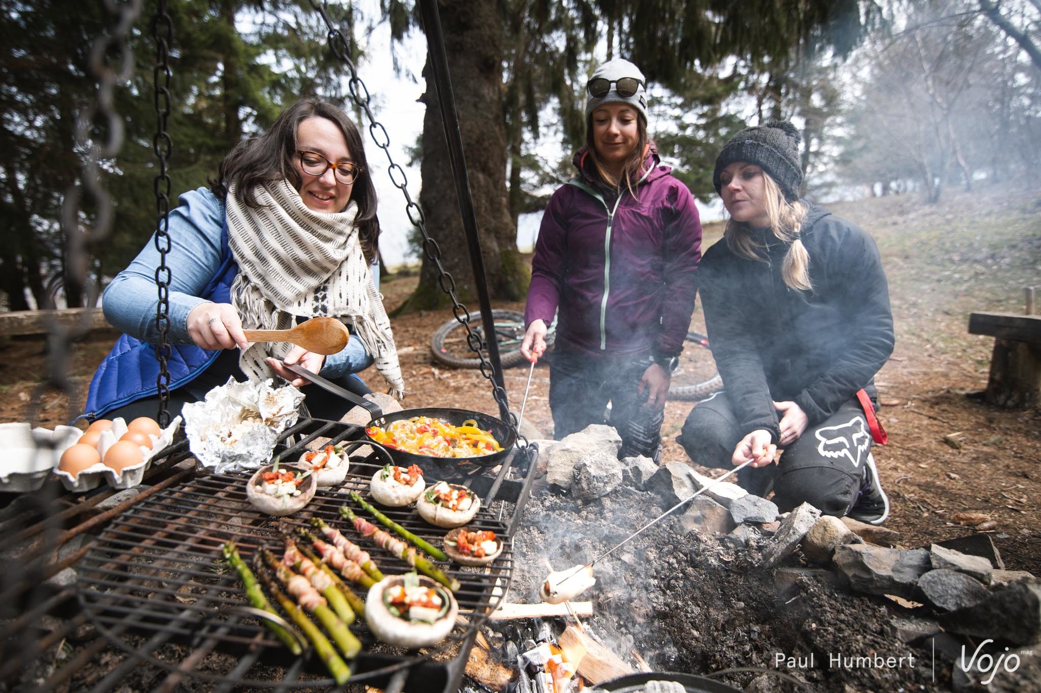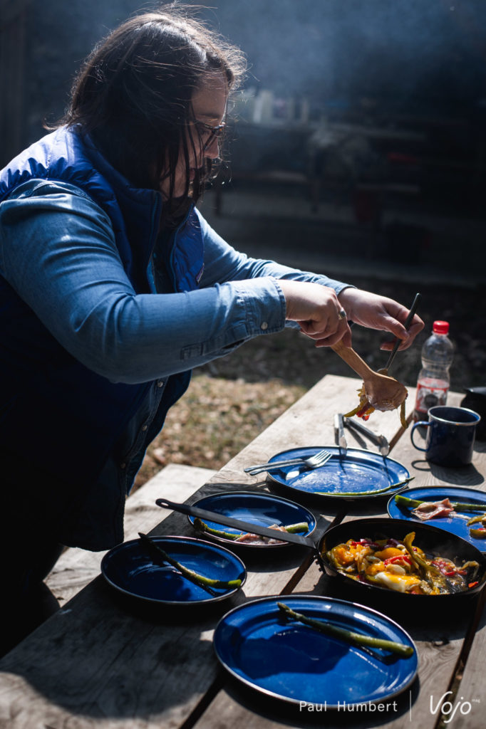 Parfait pour une pause dans la vallée de Munster. Direction le sommet des montagnes pour retrouver le brasier, et si nous avions oublié notre tente, les estomacs criaient tout de même famine ! Comme les clients que Jeen accueille habituellement, Bérengère et Débi mettent, littéralement, la main à la pâte pour confectionner leurs hot-dogs, avant de farcir des champignons, de faire « popper » leur pop-corn et de s’attabler devant un curry et des légumes mijotés au feu de bois.