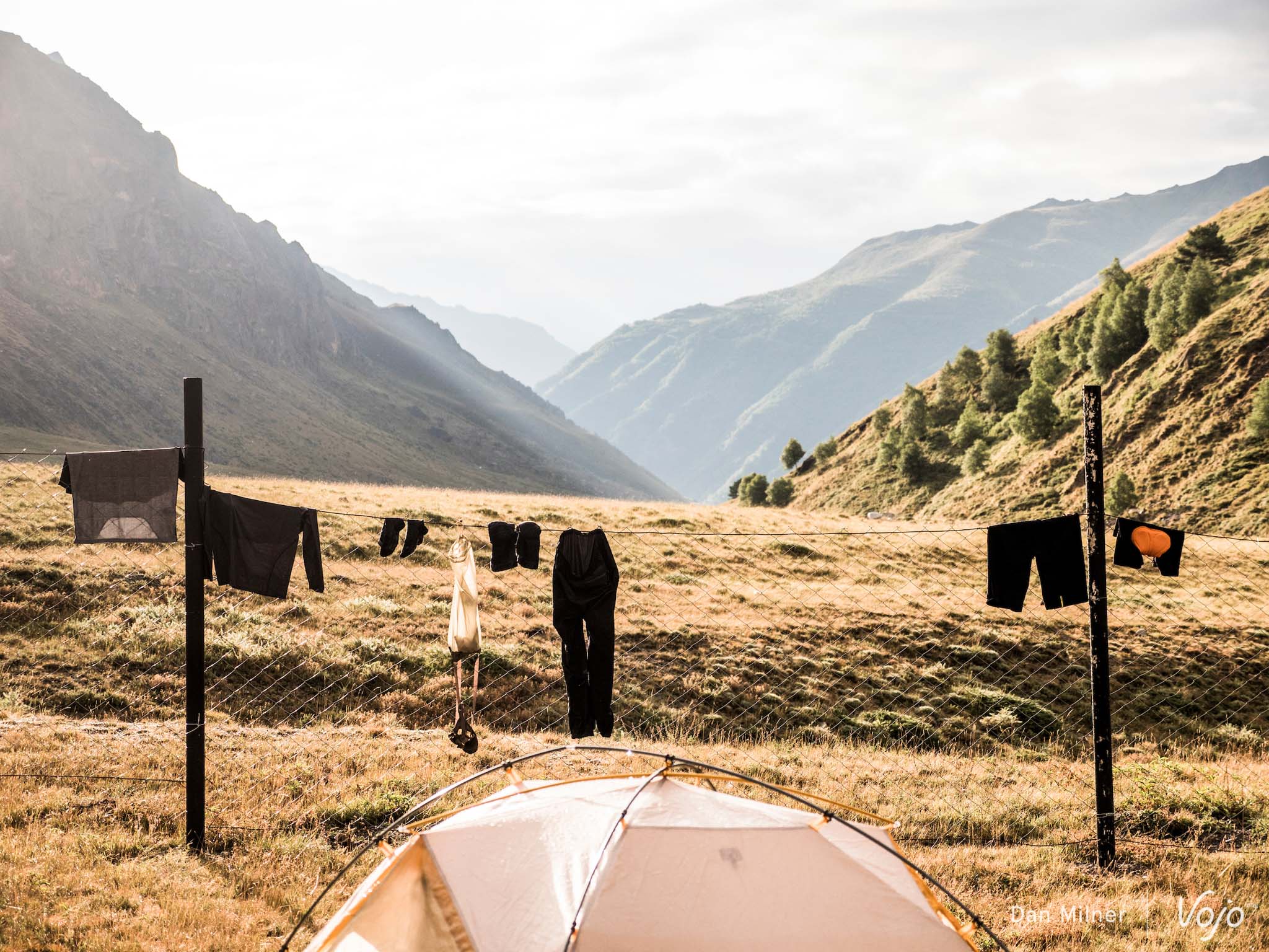 Dan : Notre première journée était probablement la plus dure des six, avec près de 2000 mètres de dénivelé positif en lieu et place des 1200 programmés. On a terminé la dernière descente dans le noir et sous une grosse pluie, loin de toute trace connue, à se briser les chevilles sur un terrain peu accueillant. On a finalement dû rebrousser chemin pour traverser le pont qui nous séparait du camp et de notre équipe de soutien. C’était une fin de journée particulièrement difficile et quand on s’est assis, affamés, on s’est vraiment demandé ce qu’on faisait là. Le lendemain matin, on s’est réveillés au soleil, ce qui nous a permis de sécher notre équipement sur la clôture qui bordait notre camp. C’est ce qui nous a permis de repartir. Le soleil a la faculté incroyable de réveiller et de motiver les esprits.