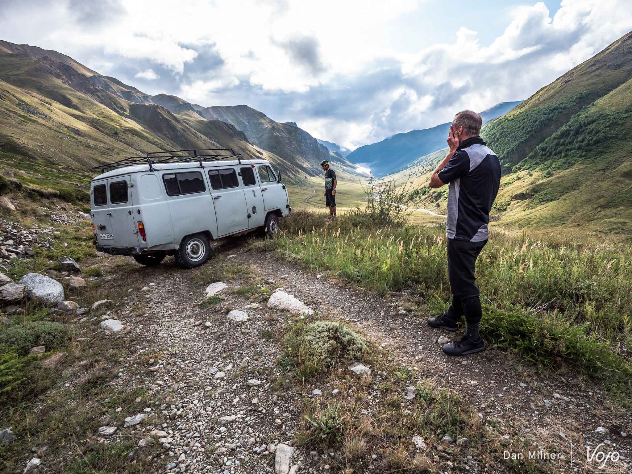 Fred : Cette photo pourrait être prise dans mon Alsace natale, et c’est ce qui la rend si particulière. Nous sommes à la frontière géorgienne, des soldats embusqués ont emmené une partie de l’équipe pour un contrôle minutieux à leur camp de base, camouflé dans la forêt. Des tourelles chargées de snipers veillent sur nos faits et gestes, alors que Dan et moi jouons avec les rayons de soleil de la fin de journée. Demain, nous franchirons le plus gros glacier de notre périple, et « si ça veut rire », on sera de retour à Terksol en soirée.