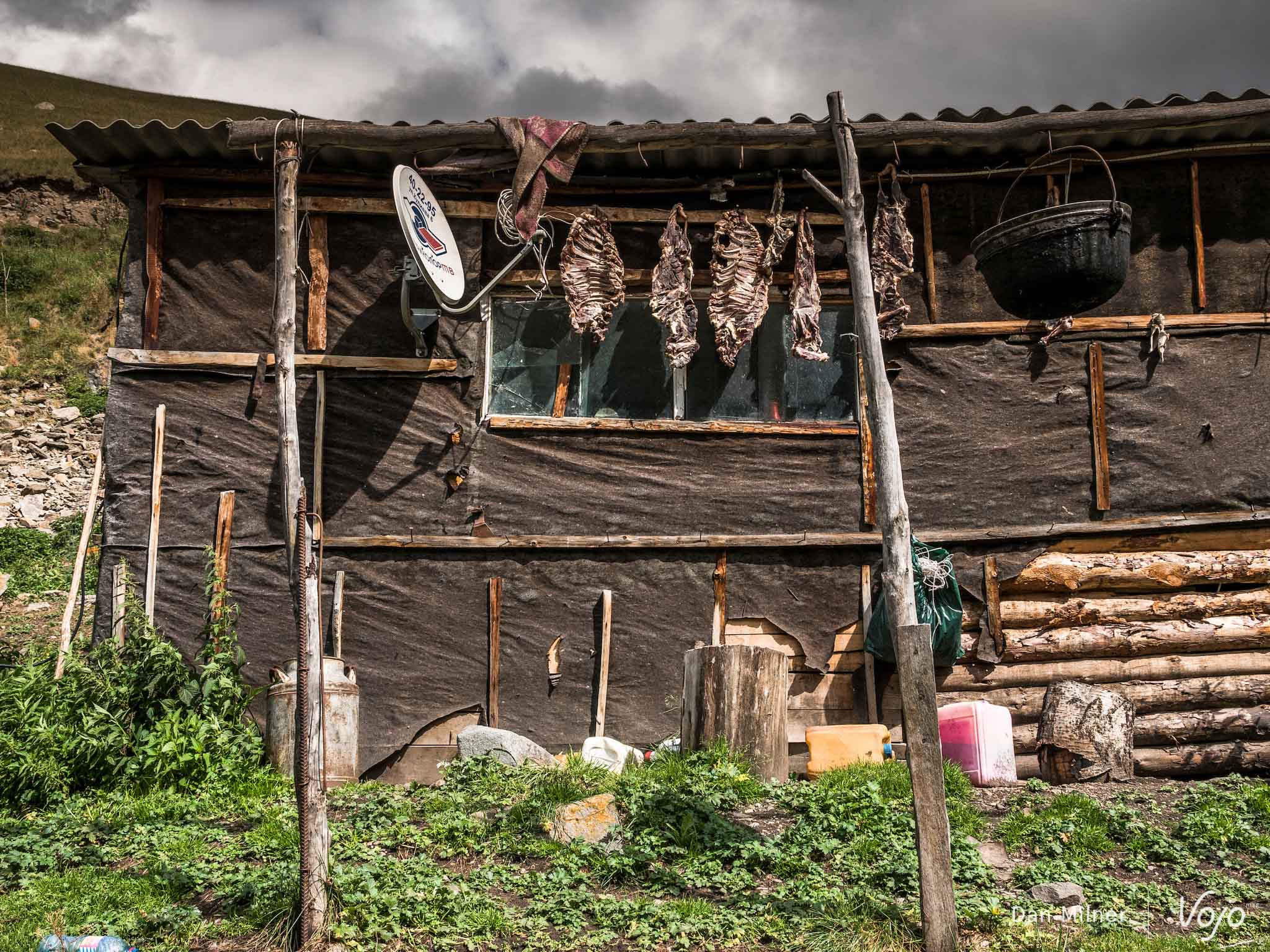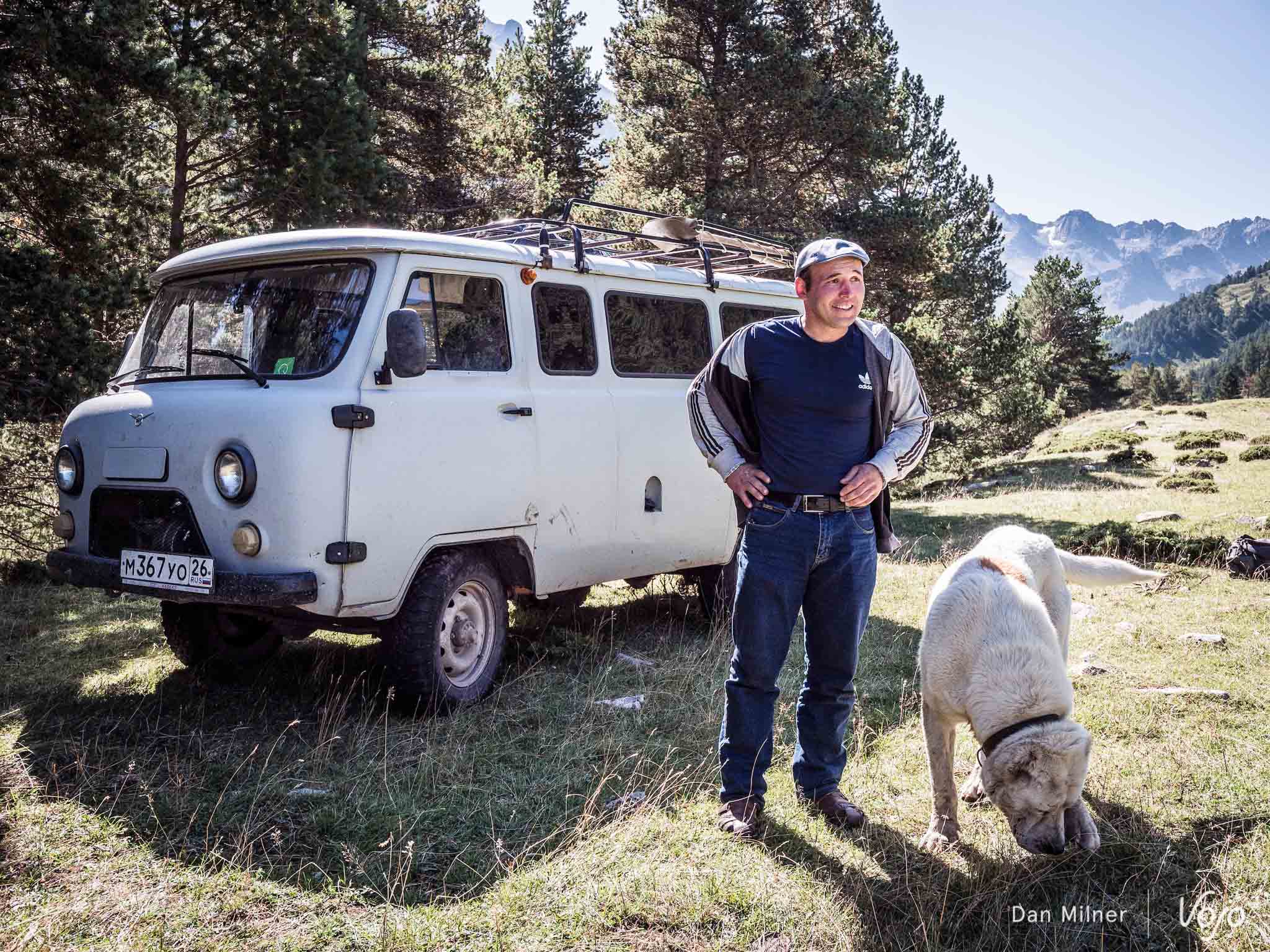 Dan : Comme pour chacun des « Seven Summits » répartis dans le monde, des milliers de personnes affluent chaque année, mais les vallées et les paysages sont presque vides. De temps à autre, on longe des habitations, comme ces petits abris de bergers gardant des moutons. La combinaison de ces carcasses de mouton séchant à l’air à côté d’une parabole symbolise toute la « Russie » pour moi.