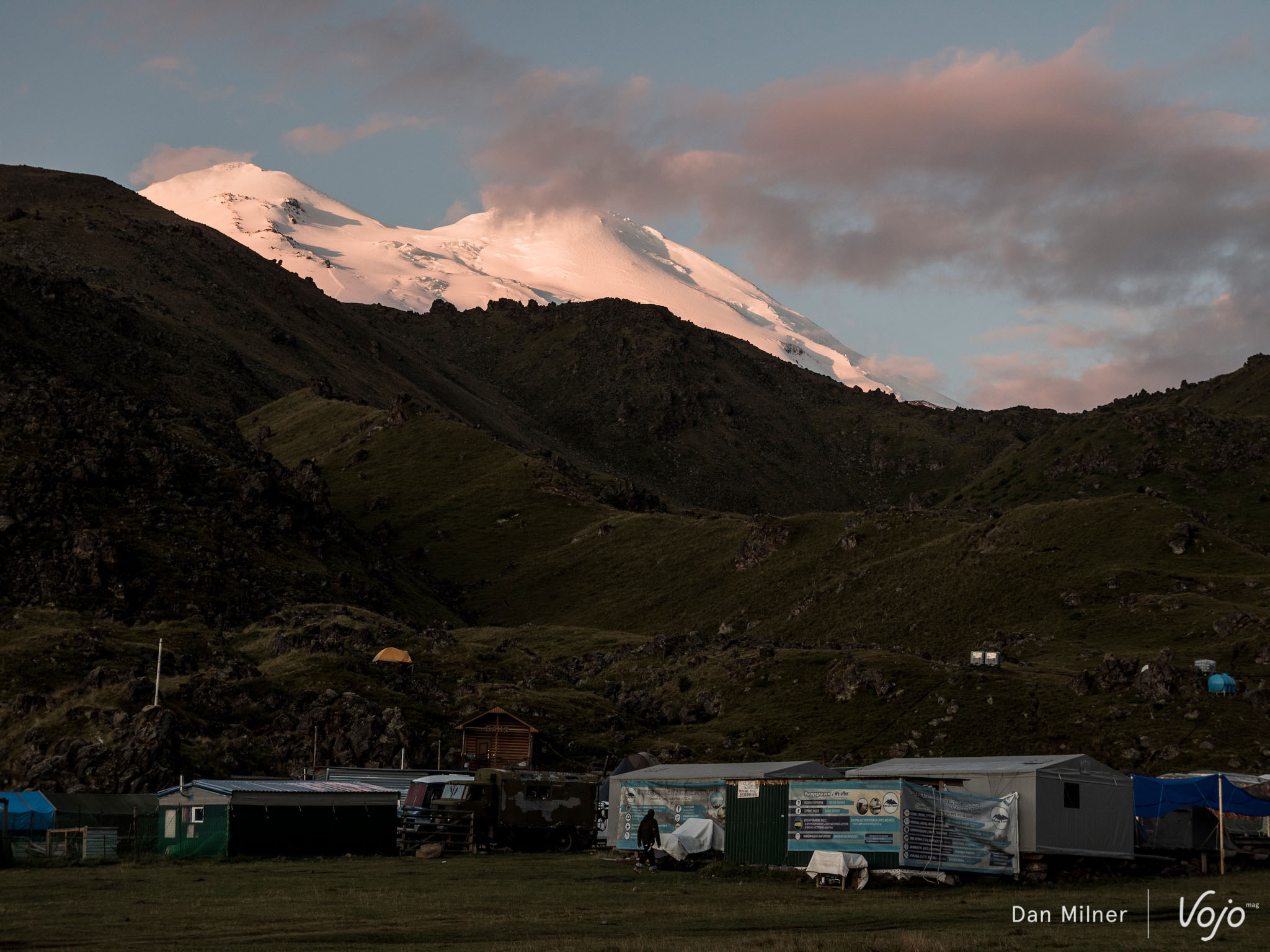 Dan : Le camp de base Nord de l’Elbrouz est le point de départ d’une montée plus longue et difficile que son versant Sud. Il nous a abrités pour notre seconde nuit mais, comme pour la majorité des choses en Russie, on ne sait jamais trop à quoi s’attendre avant d’arriver. En approchant, on pouvait entendre de la techno crachée depuis des haut-parleurs, comme si on était en pleine rave. Nous avons réalisé que ce camp était un étrange mélange d’alpinistes tentant de se reposer avant leur ascension de plusieurs jours, et ceux célébrant leur arrivée après leur escalade du sommet. C’est très russe.