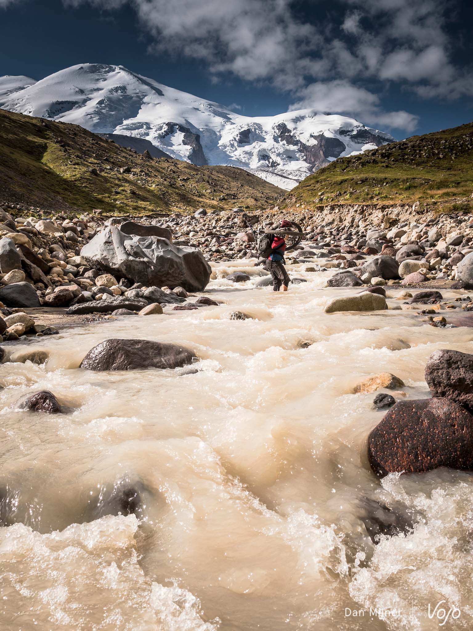 Dan : Ce ne sont pas les cols d’altitude qui nous ont causé le plus de souci ou d’angoisse pendant ce tour de l’Elbrouz, mais les rivières. Nous avons passé des heure à plancher sur des cartes rudimentaires pour décider de l’endroit le plus propice pour traverser si il n’y avait pas de pont. Ce jour-là, en partant du camp de base de l’Elbrouz, nous avons même transporté une corde de 30m de long pour nous assurer pendant la traverser de la rivière. Ce cours d’eau, fourni par les glaciers et la neige en amont, est connu pour gonfler rapidement avec la chaleur pendant la journée. Svetlana n’a pas manqué de nous raconter les histoires d’alpinistes et de marcheurs emportés… Nous avons pris le départ tôt pour traverser. Seuls nos genoux se sont retrouvés immergés et, heureusement, nous n’avons pas eu à utiliser notre corde.