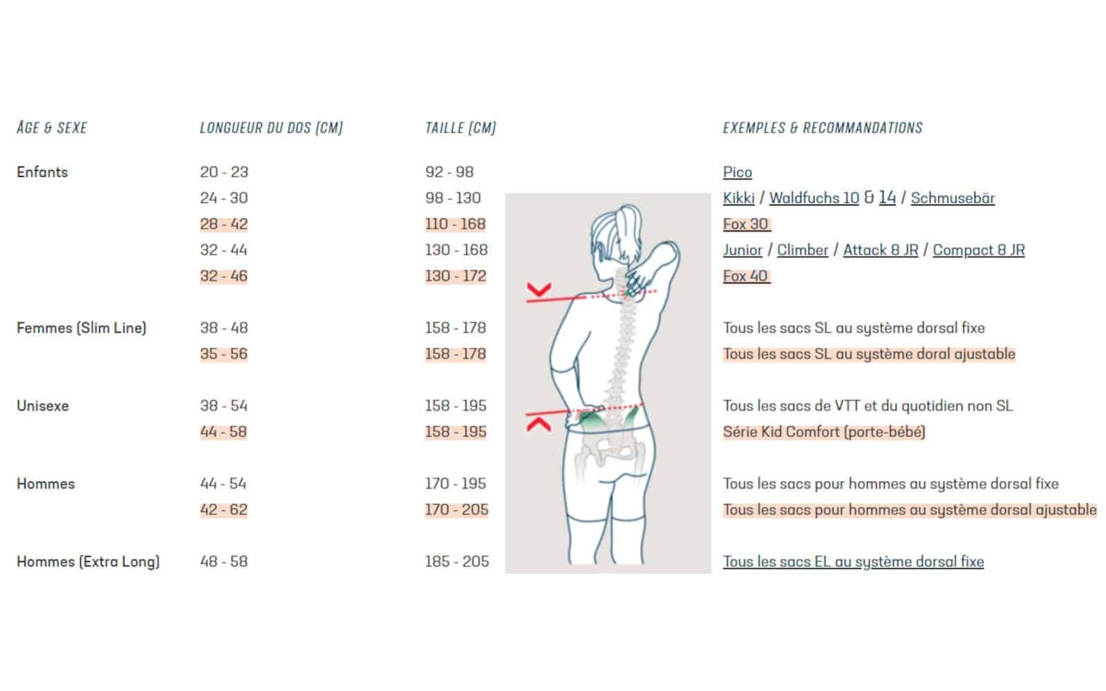 En effet, les modèles de 22 et 28 litres sont des modèles SL, conçus pour des longueurs de dos plus courtes, avec une recommandation de 38 à 48 cm. Le modèle de 32 litres est un modèle EL, adapté aux longueurs de dos plus longues, avec une recommandation de 48 à 58 cm. Pour les modèles « classiques », la longueur de dos recommandée est de 44 à 54 cm, ce qui correspond généralement à une taille corporelle de 1,70 m à 1,95 m.