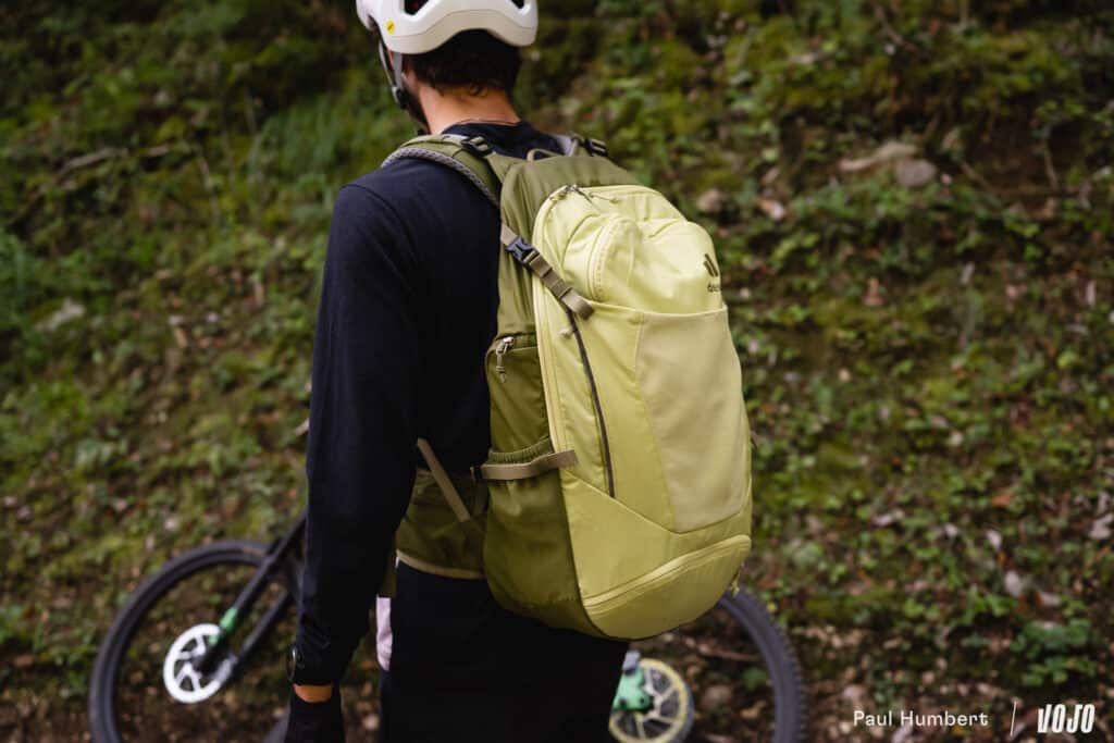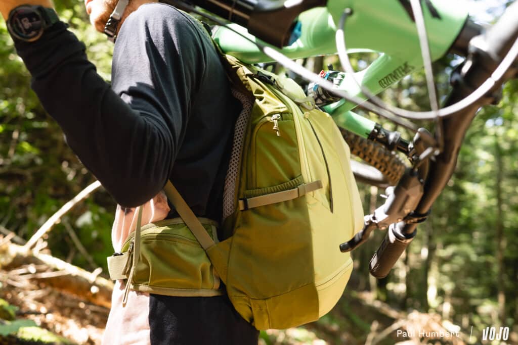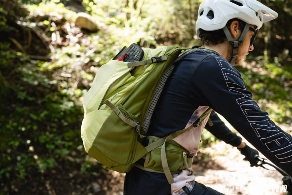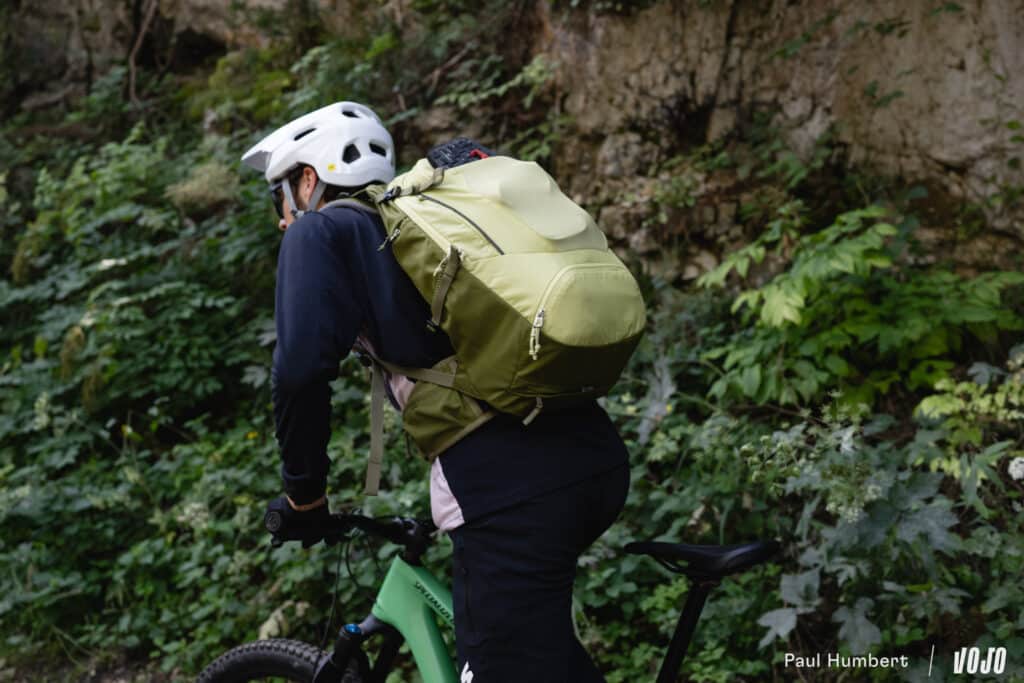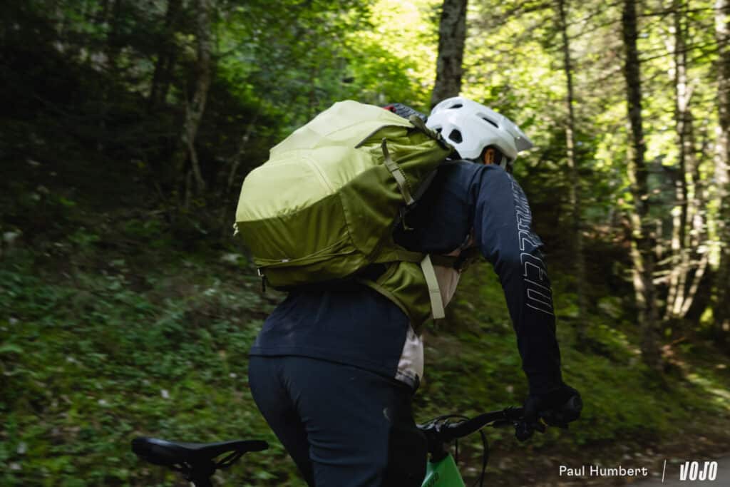 Après un petit-déjeuner copieux, on met le sac sur le dos, on monte sur le vélo, puis on commence par ajuster l’ergonomie du sac (car, oui, votre position debout n’est pas la même que sur le vélo). Et le moins que l’on puisse dire, c’est que le Trans Alpine 24 offre tout ce qu’il faut pour un bon ajustement.