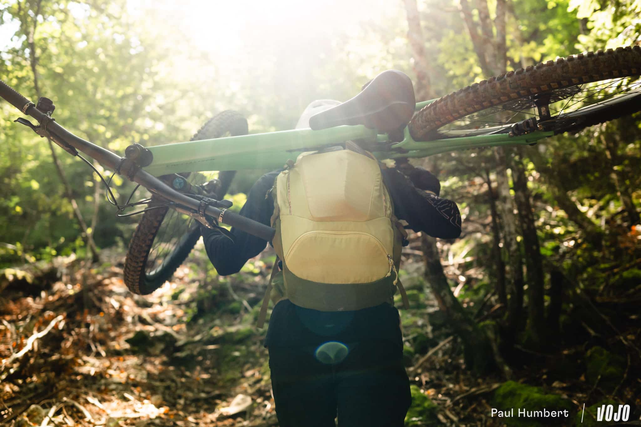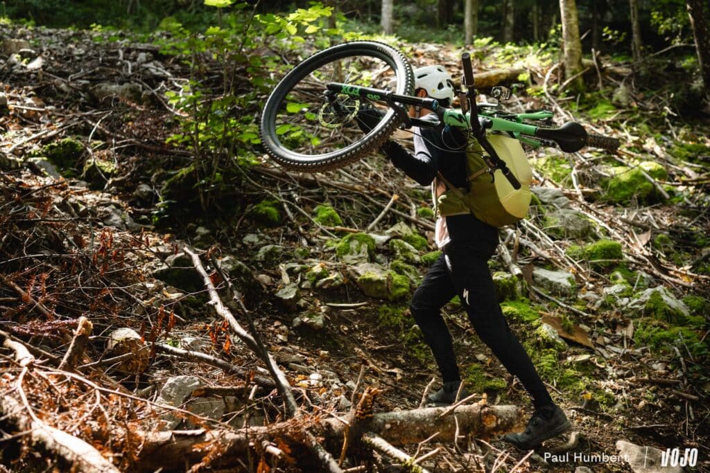 Posé sur le sommet du sac et sur le départ des (généreuses) bretelles, le vélo est stable et le moment devient bien plus supportable ! Sans dire que cela devient une partie de plaisir, avec ses différents éléments, le Trans Alpine 24 est totalement compatible et capable de vous aider dans ces (durs) moments de portage.