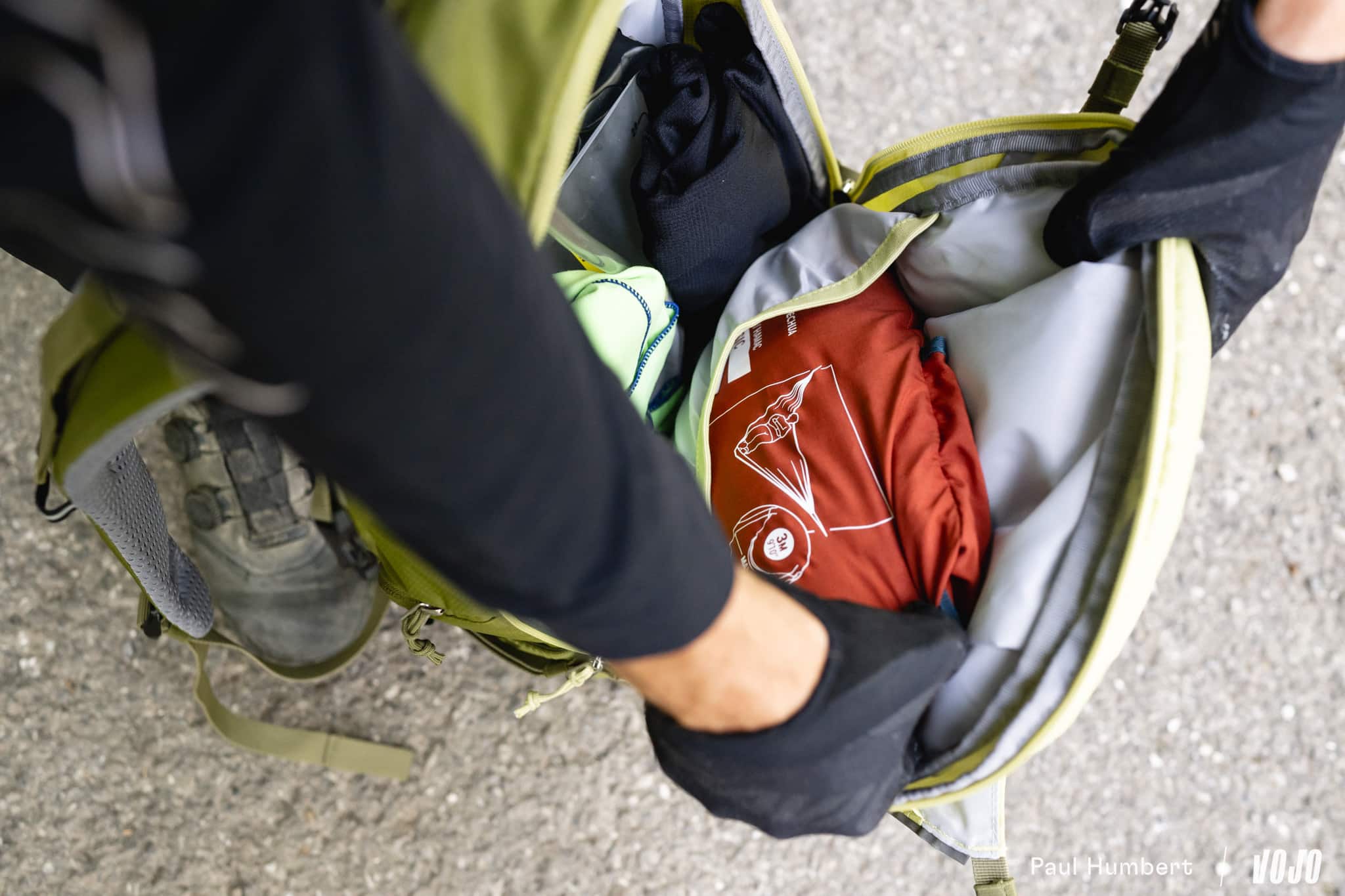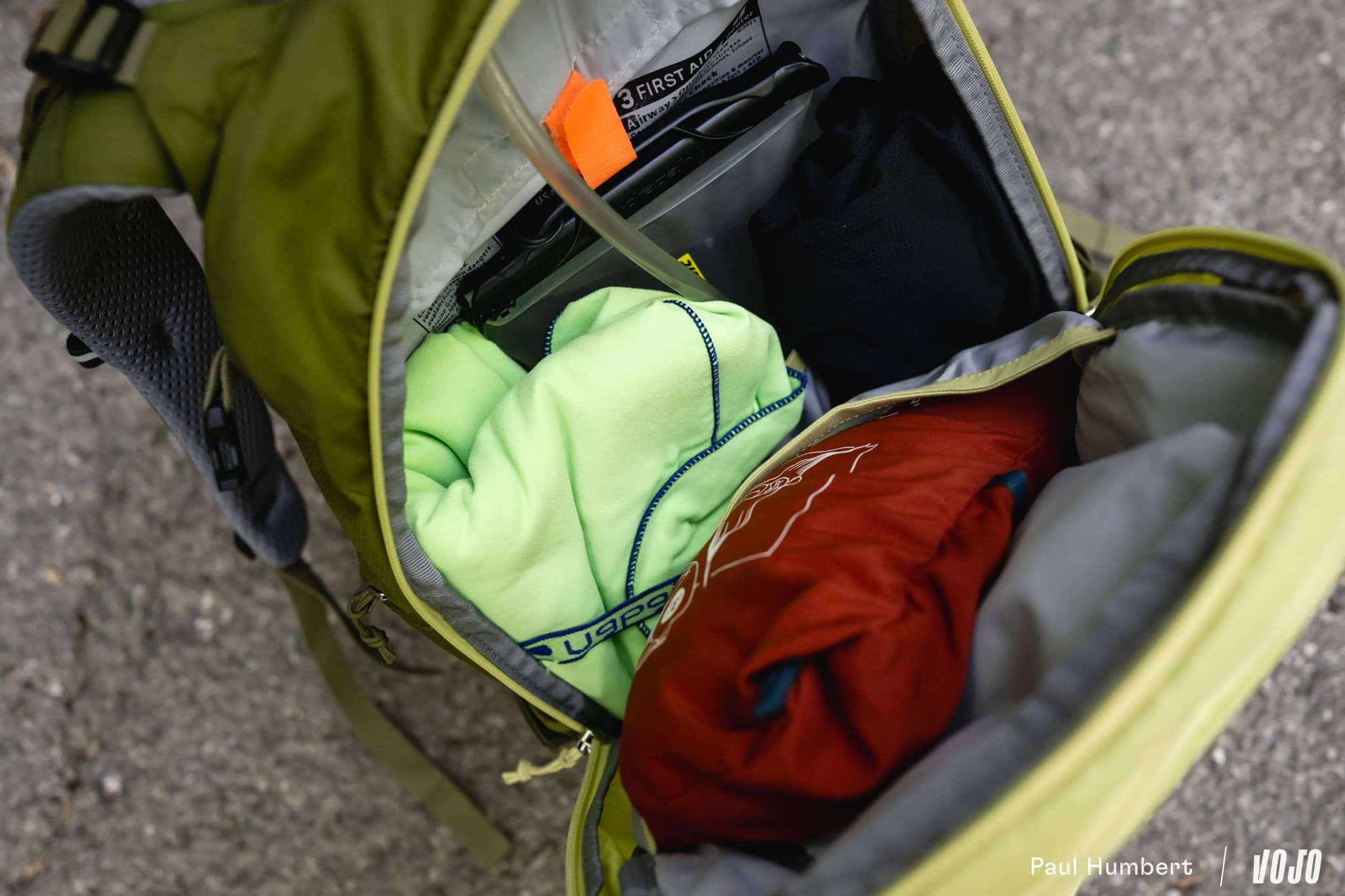 Trêve de plaisanterie, le plus important en cette période de canicule (38 °C de prévus sur le thermomètre pour les deux prochains jours), c’est l’eau, et le bidon de 650 ml ne fera clairement pas l’affaire tout seul. On équipe alors le Trans Alpine 24 d’une poche à eau de deux litres (il peut même en accueillir jusqu’à trois, mais nous n’en avions pas sous la main). Le sac est bouclé, place au départ !