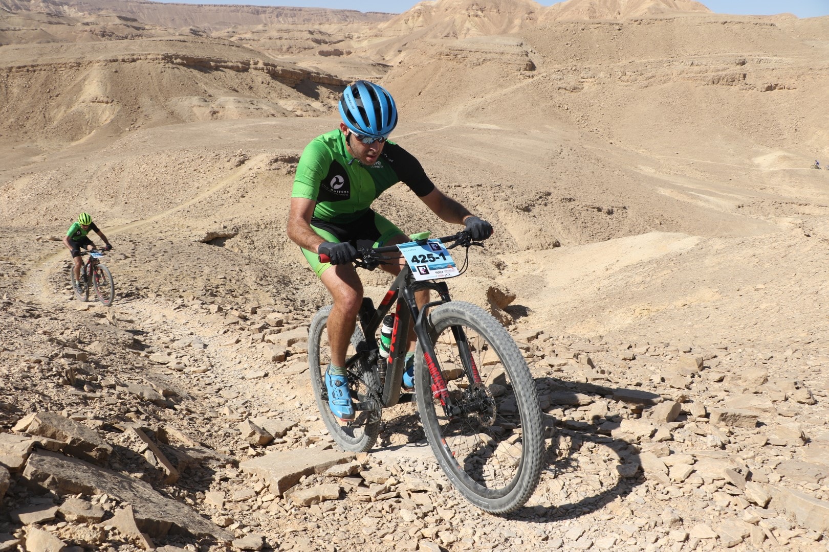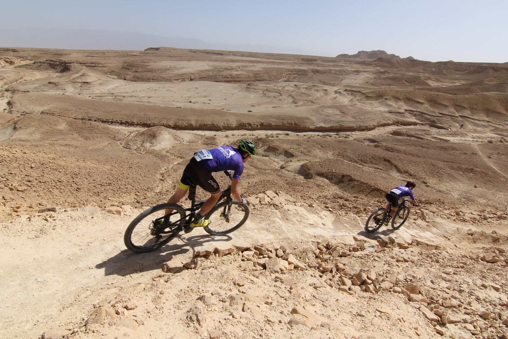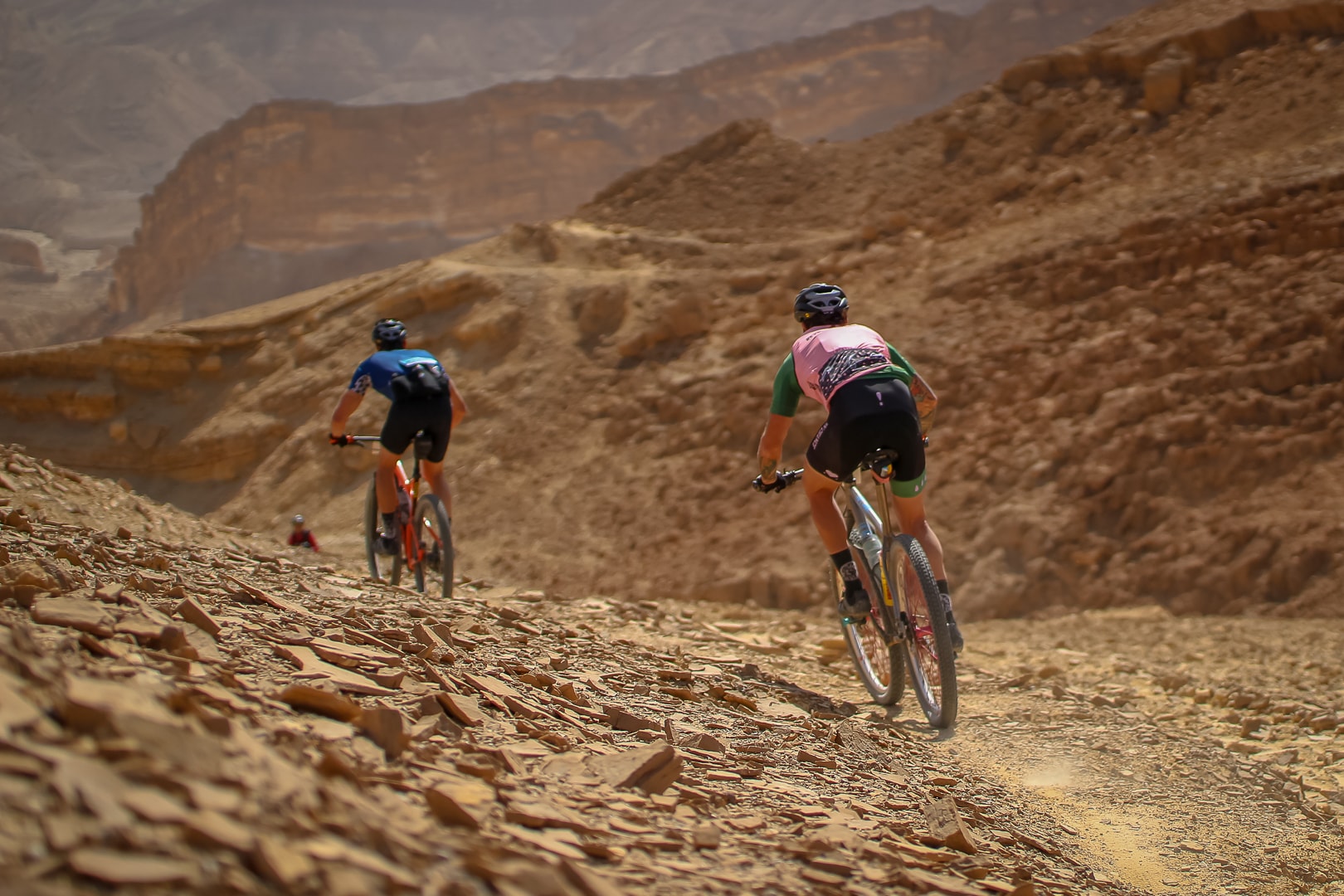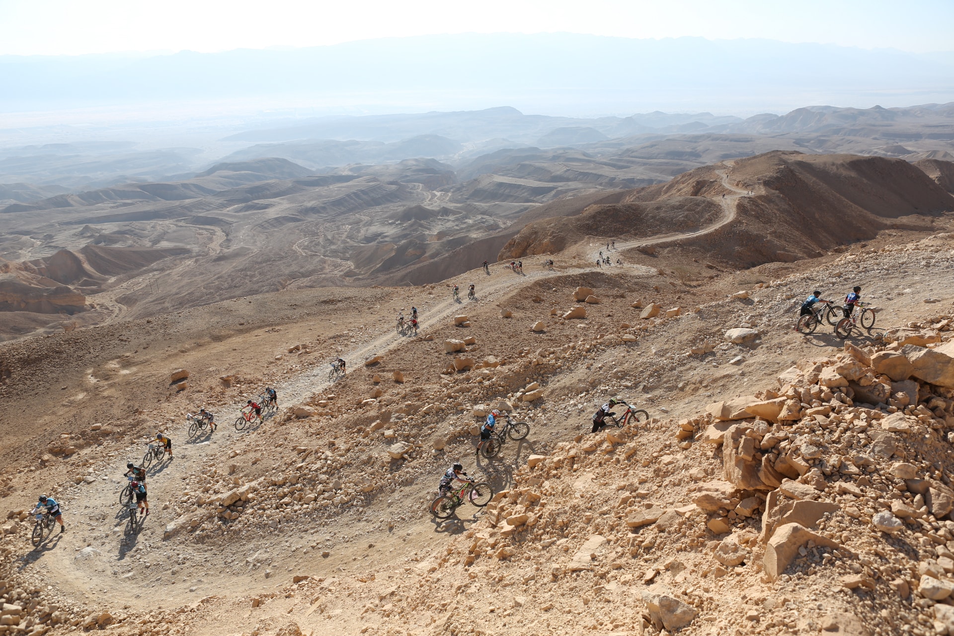 C’est avec beaucoup d’enthousiasme que nous abordons la première étape type marathon, qui laisse davantage place à la découverte de nouveaux sentiers, de nouvelles couleurs, de nouveaux points de vue. Après huit kilomètres plus roulants et rapides que la veille, l’ensemble des coureurs prennent de l’altitude pour atteindre le plateau Maale Shaharut et sa vue imprenable sur la vallée désertique. La montée devient de plus en plus raide, nous obligeant à descendre du vélo en son final.