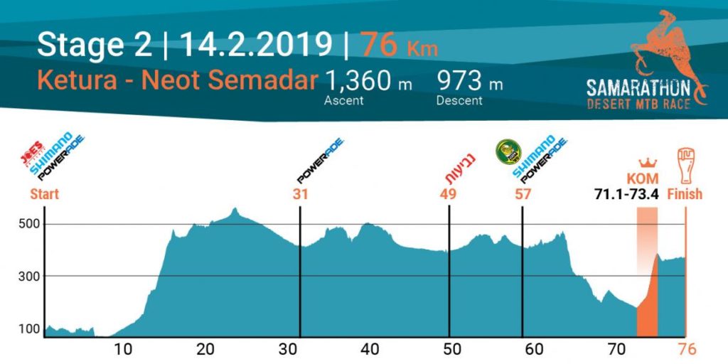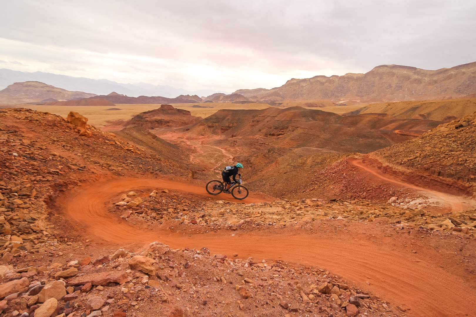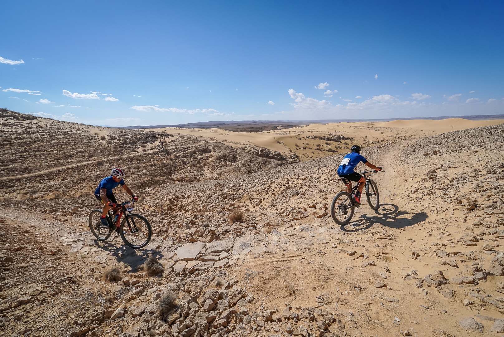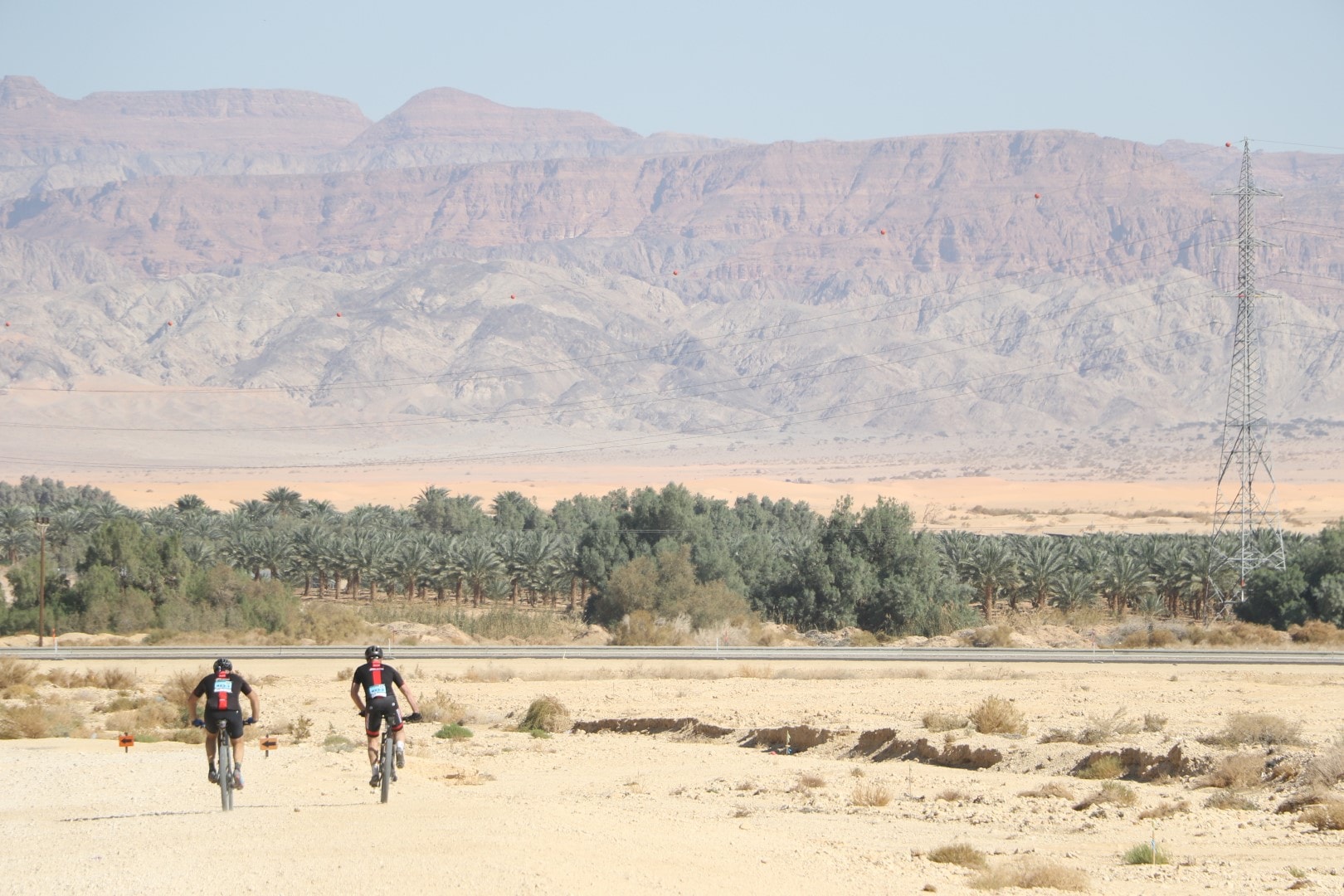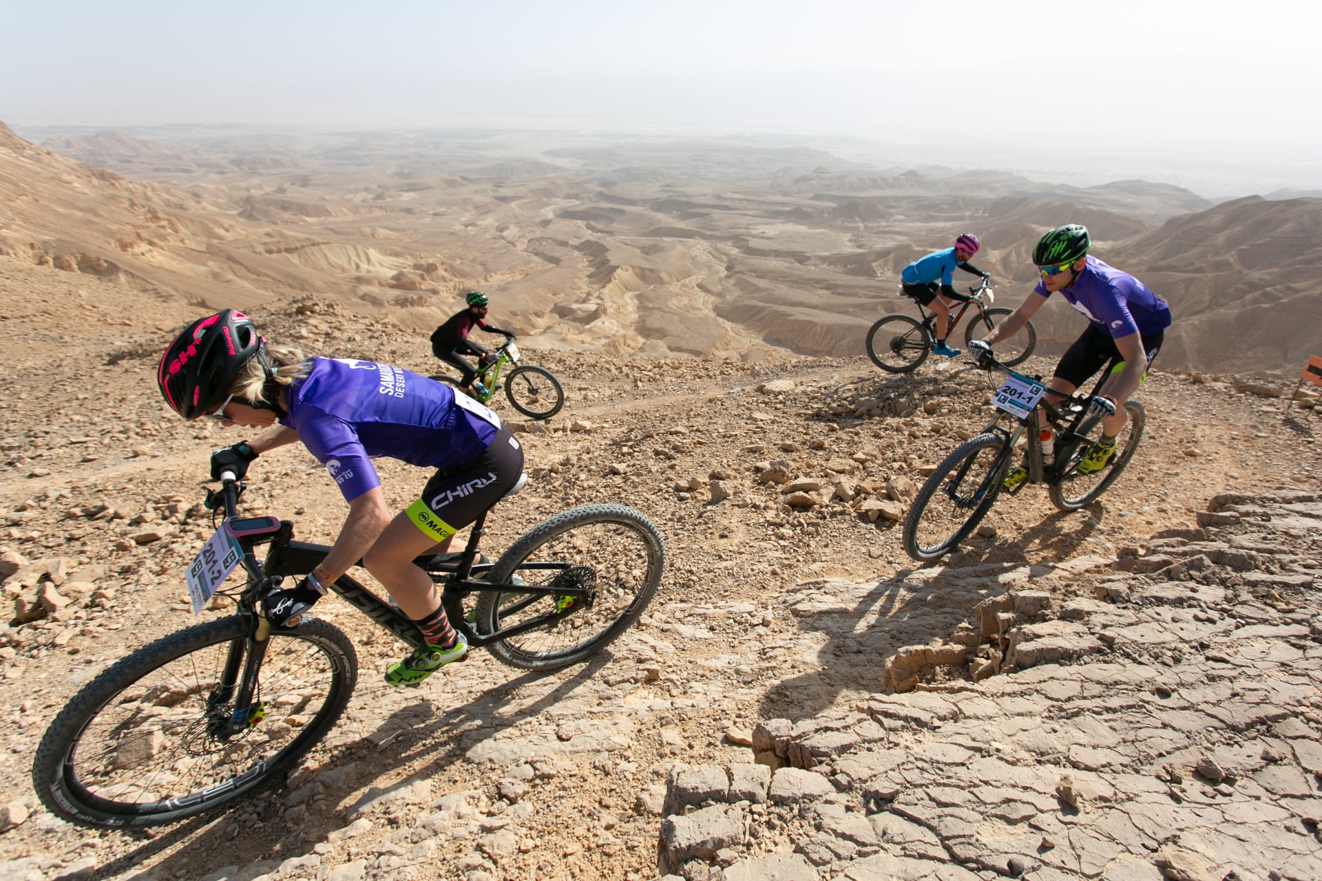 C’est avec beaucoup d’enthousiasme que nous abordons la première étape type marathon, qui laisse davantage place à la découverte de nouveaux sentiers, de nouvelles couleurs, de nouveaux points de vue. Après huit kilomètres plus roulants et rapides que la veille, l’ensemble des coureurs prennent de l’altitude pour atteindre le plateau Maale Shaharut et sa vue imprenable sur la vallée désertique. La montée devient de plus en plus raide, nous obligeant à descendre du vélo en son final.