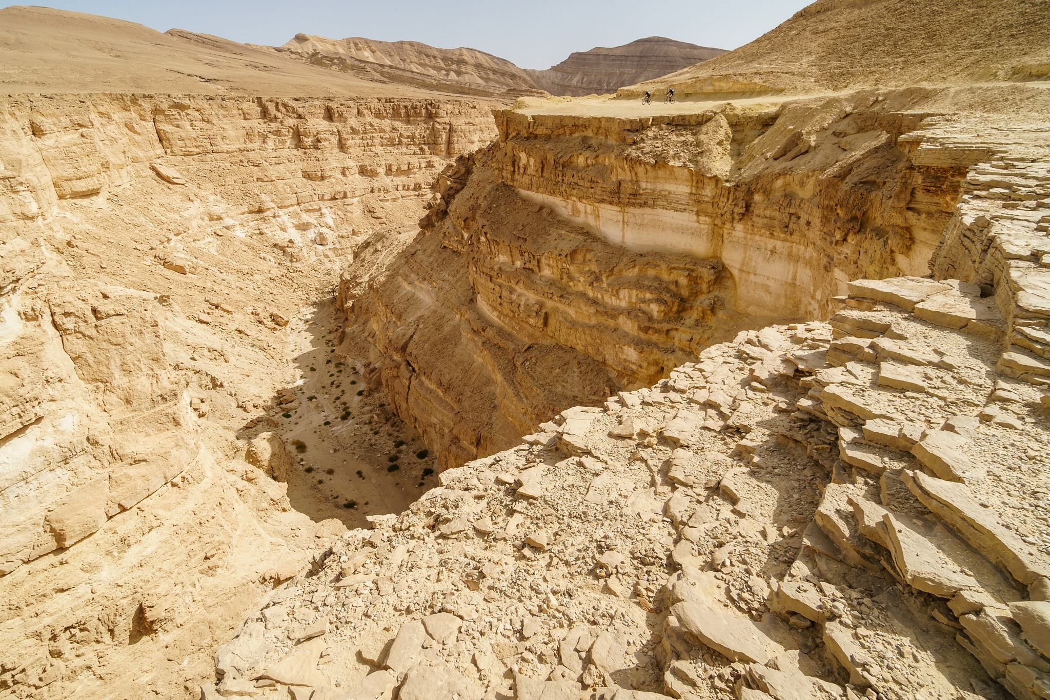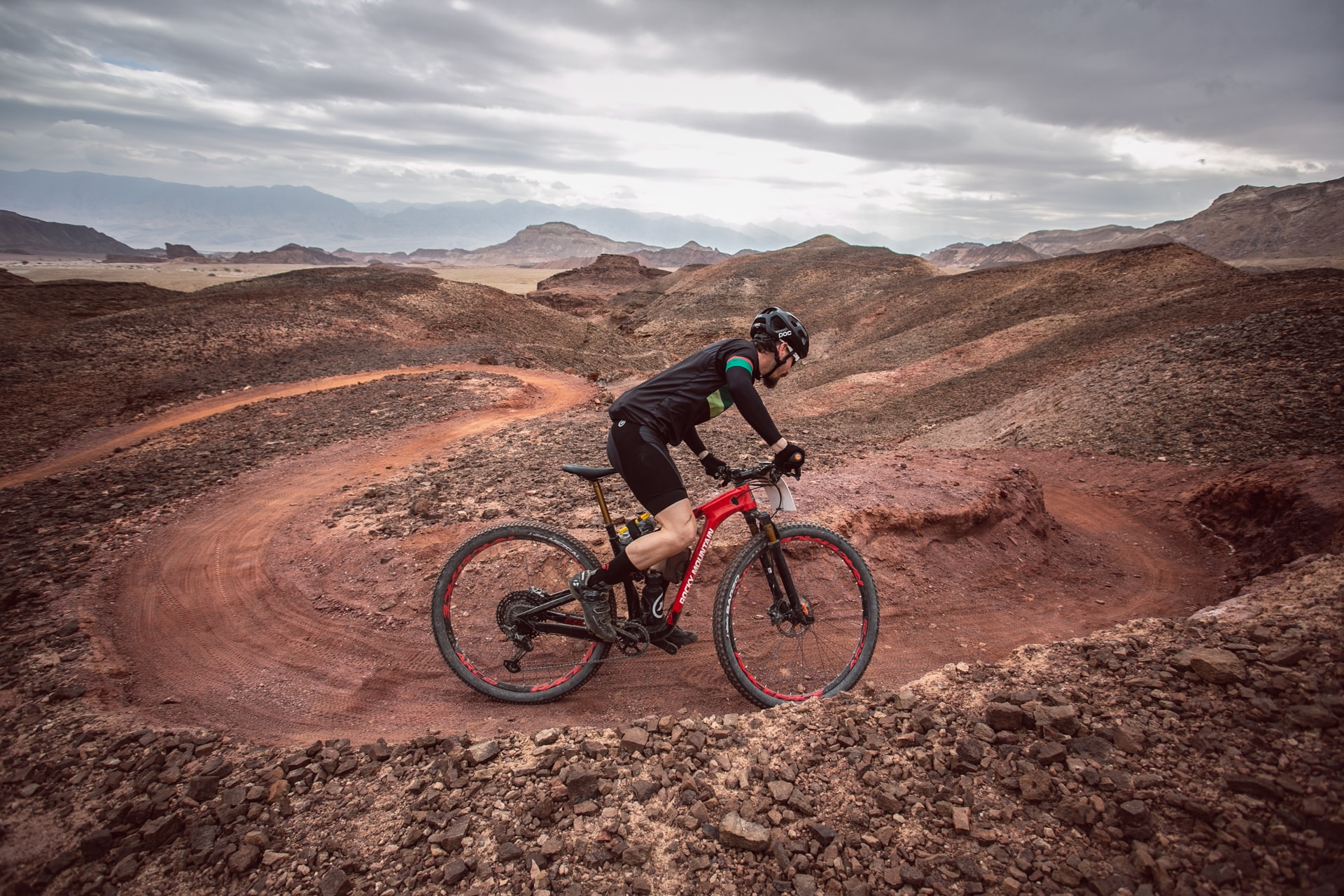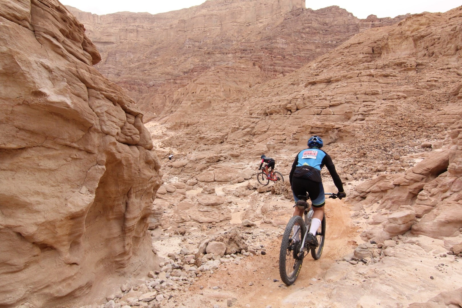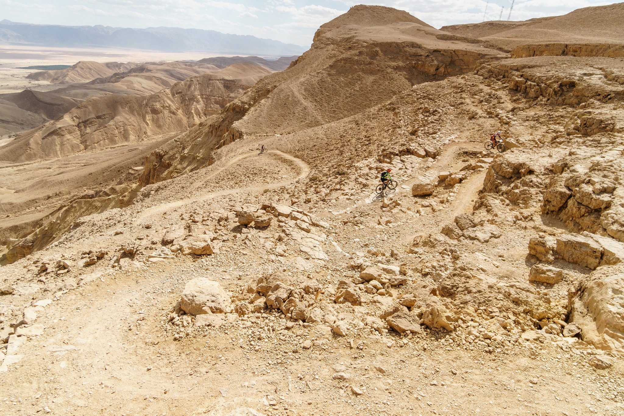 C’est avec beaucoup d’enthousiasme que nous abordons la première étape type marathon, qui laisse davantage place à la découverte de nouveaux sentiers, de nouvelles couleurs, de nouveaux points de vue. Après huit kilomètres plus roulants et rapides que la veille, l’ensemble des coureurs prennent de l’altitude pour atteindre le plateau Maale Shaharut et sa vue imprenable sur la vallée désertique. La montée devient de plus en plus raide, nous obligeant à descendre du vélo en son final.