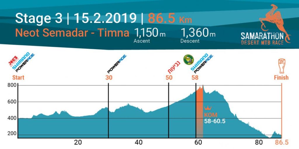 Les participants s’élancent par équipes de 2 sur le prologue de 21 kilomètres toutes les minutes et nous découvrons le terrain très caillouteux qui nous attend durant 4 jours. Le parcours de ce prologue n’est pas de tout repos puisqu’il est constitué principalement de singletracks sur un terrain vallonné et caillouteux. L’on retrouve deux types de singletracks dans le désert de Samar : ceux naturels empruntés historiquement par les chameaux (d’où l’emblème de l’épreuve) et ceux construits plus récemment à la main par les locaux spécifiquement pour la pratique du VTT. De gros efforts sont d’ailleurs mis en oeuvre pour agrandir et améliorer ce réseau de sentiers afin de faire de Timna Park une destination de premier choix pour la pratique du VTT. A moyen terme, l’épreuve Samarathon devrait d’ailleurs comporter environ 70% de Singletracks.