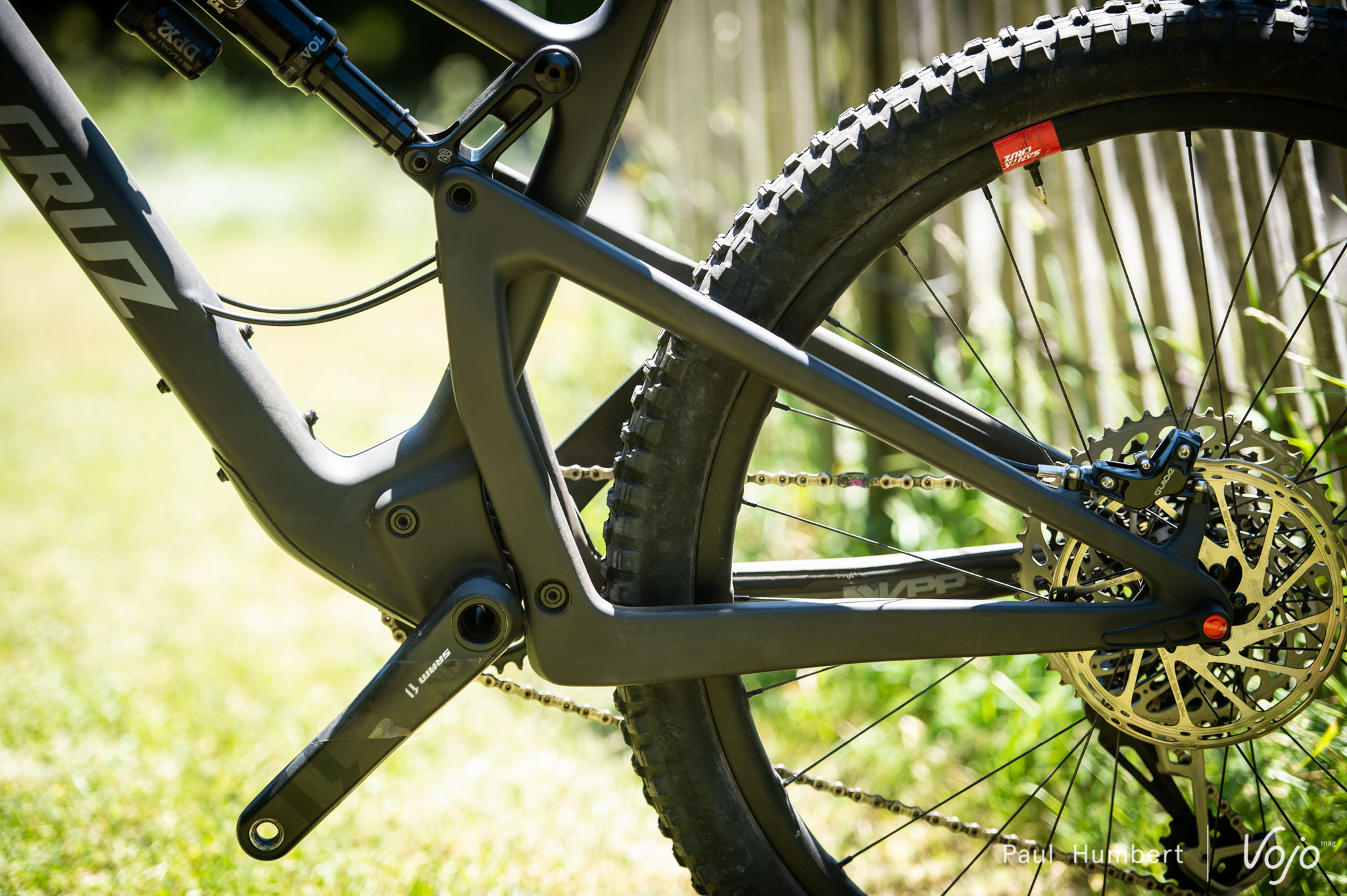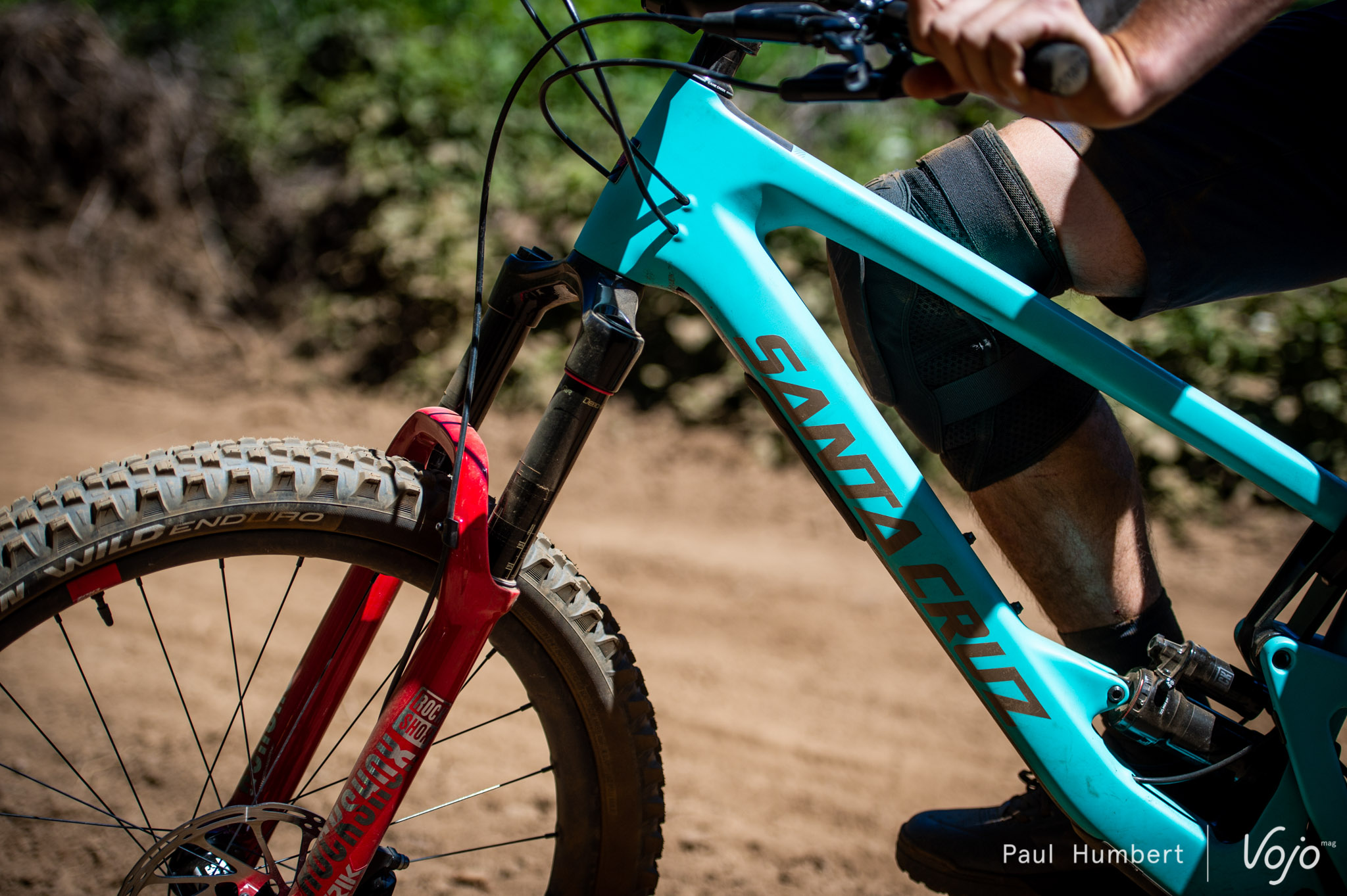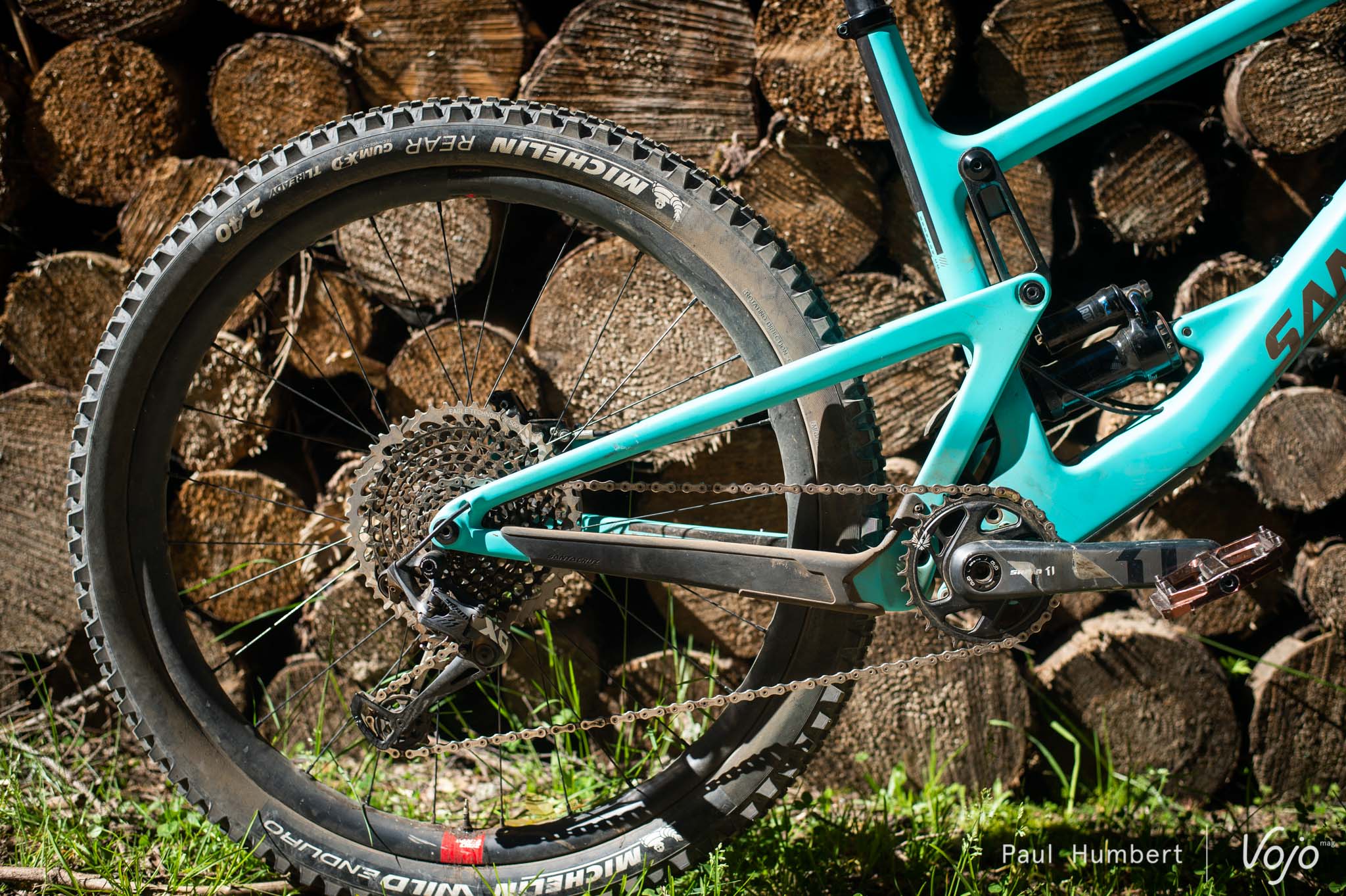 C’est encore sur un modèle haut de gamme X01 que nous grimpons. Des pneus de section 2.35 sont montés sur des roues Reserve de 27mm de largeur interne. L’amortisseur est ancré sur la position basse du flip chip.