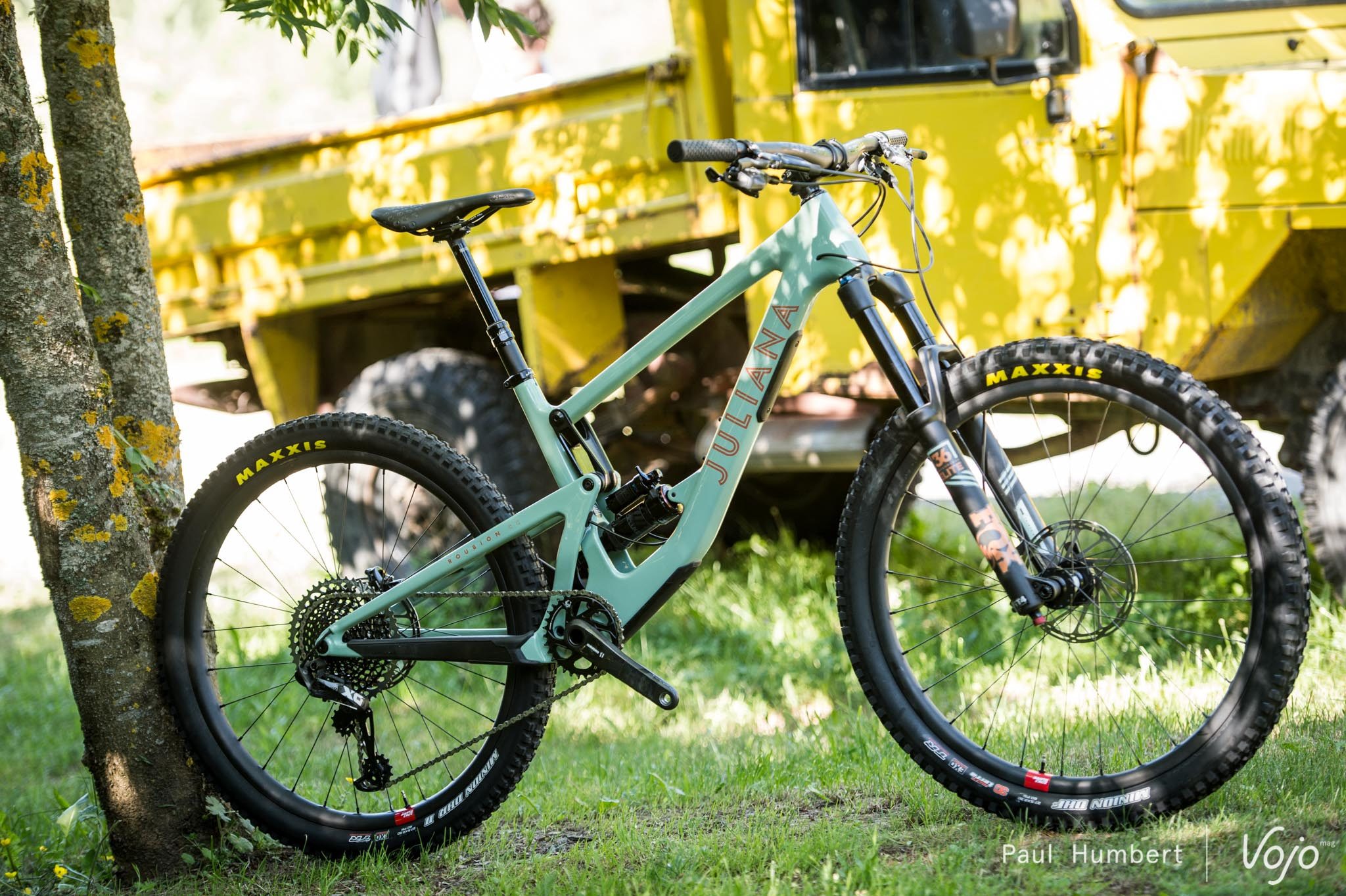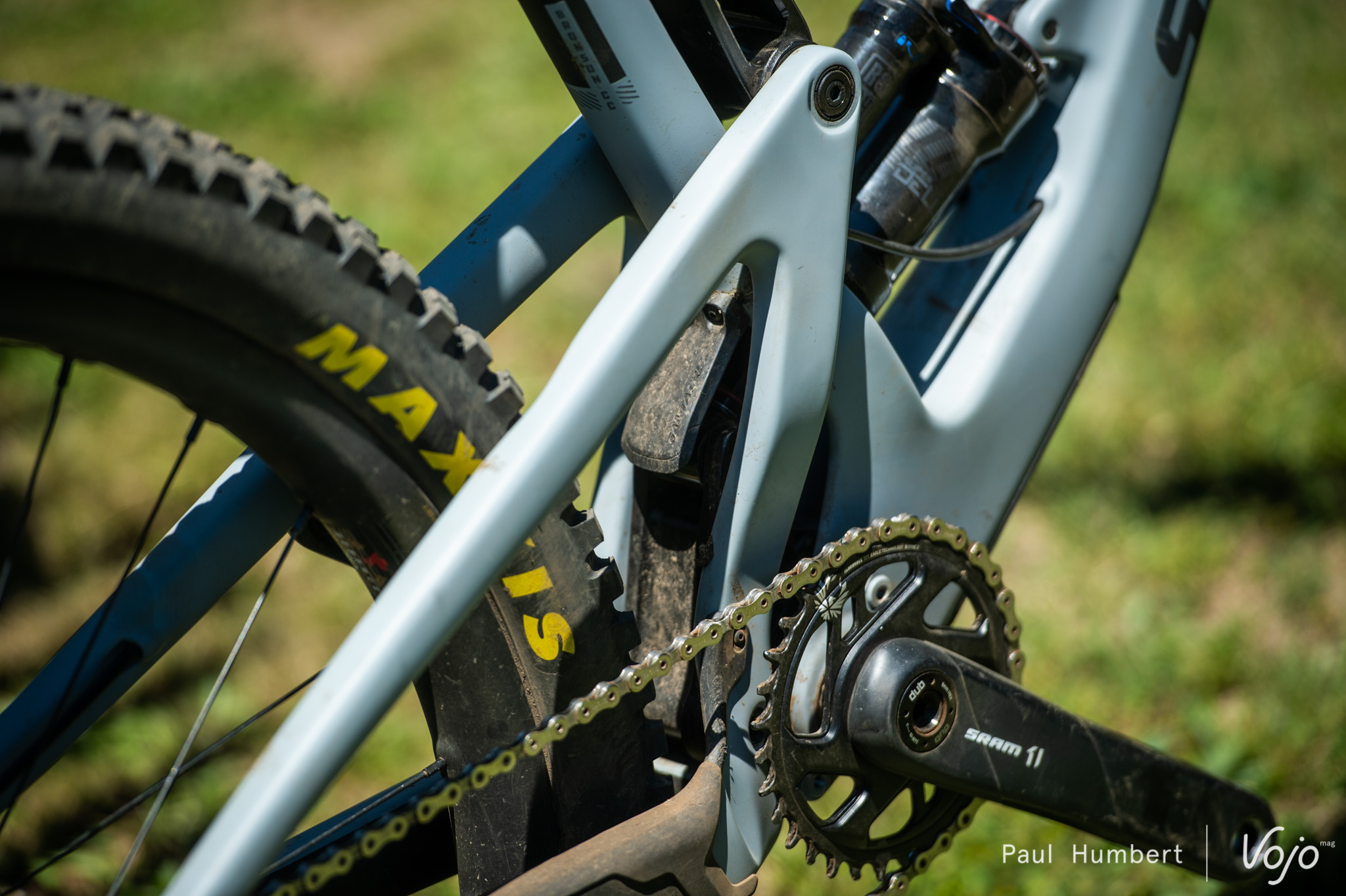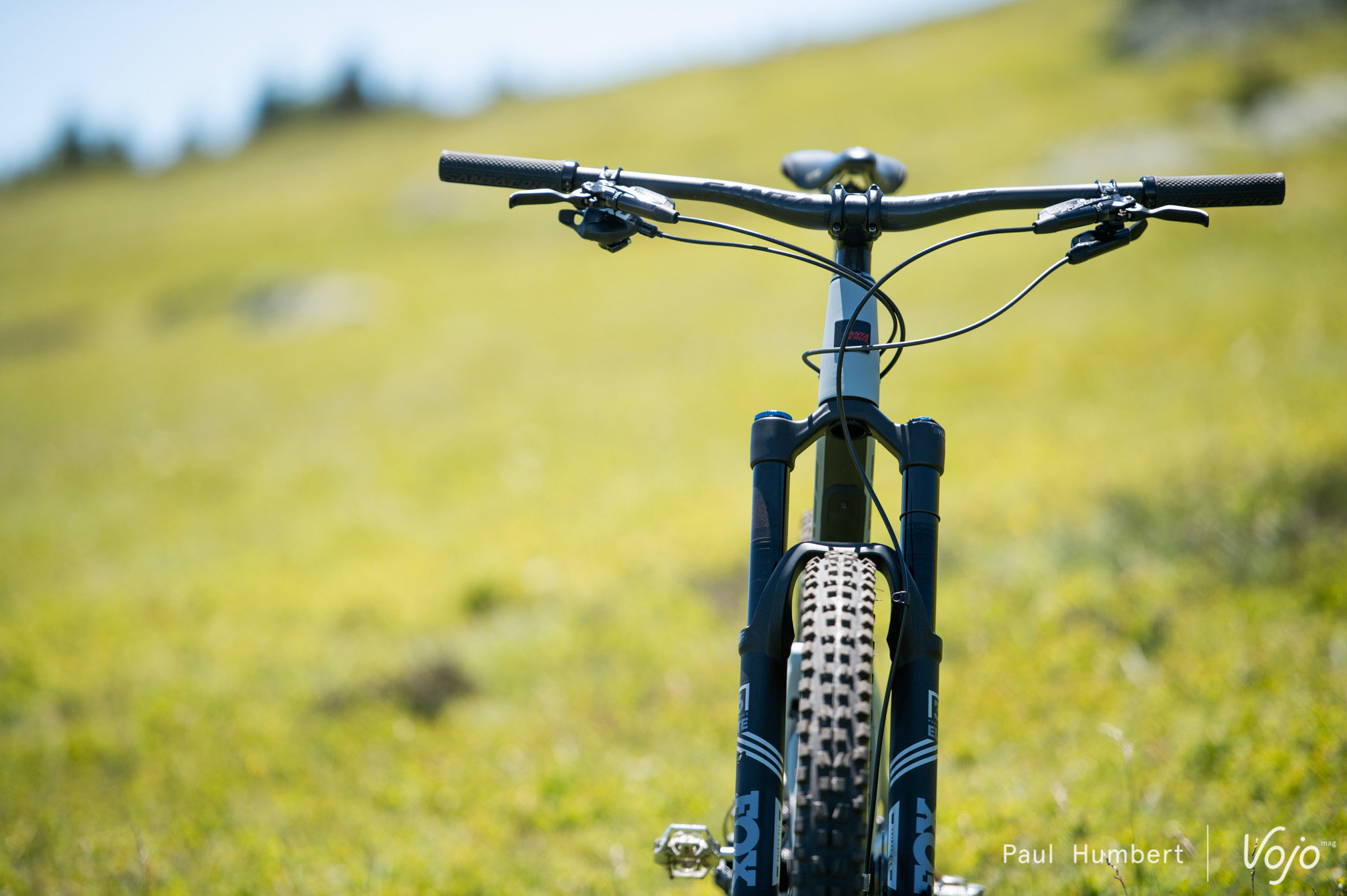 C’est encore sur un modèle haut de gamme X01 que nous grimpons. Des pneus de section 2.35 sont montés sur des roues Reserve de 27mm de largeur interne. L’amortisseur est ancré sur la position basse du flip chip.