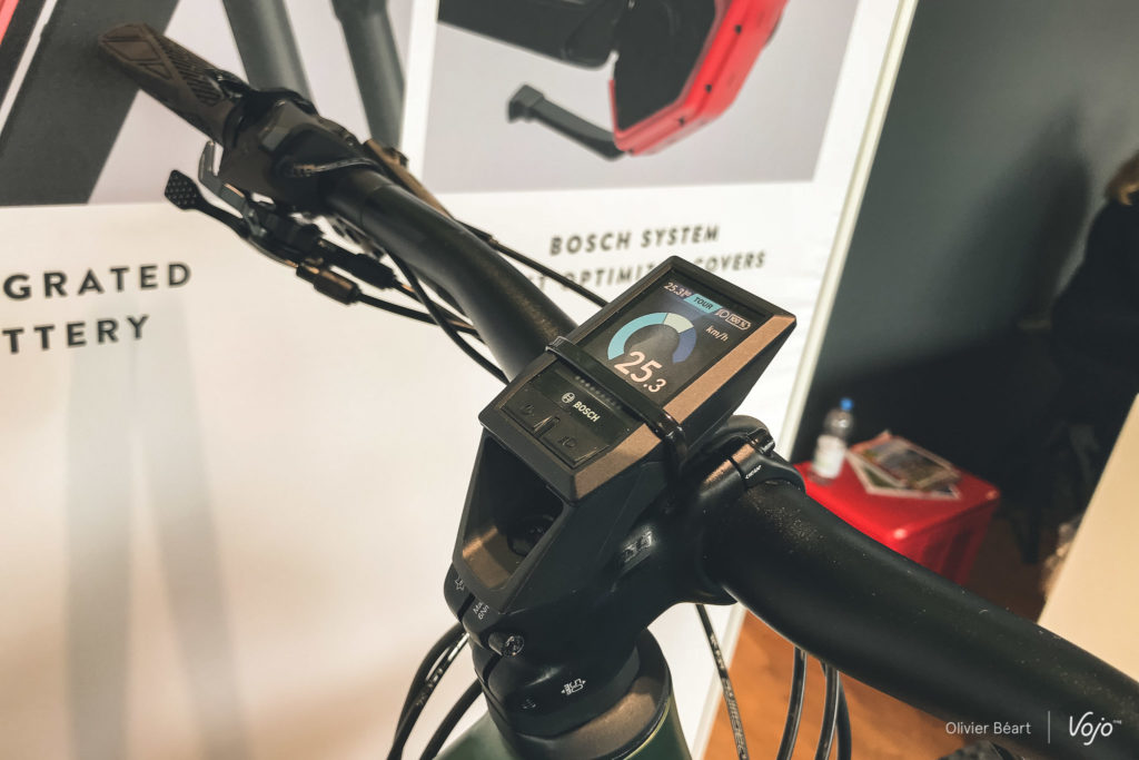 Le Scott Strike Eride s’équipe d’un nouvel écran de contrôle Bosch baptisé Kiox. Il se positionne sur la potence, au-dessus du guidon et se veut bien plus « intelligent » que les autres modèles de la marque. L’interface est nouvelle et permet de suivre la fréquence cardiaque de l’utilisateur et de lui permettre d’évaluer sa forme en temps réel. Le tout se veut plus solide et plus « franc » lors de la sollicitation des commandes, ce qui était un reproche fait pour la commande Purion.