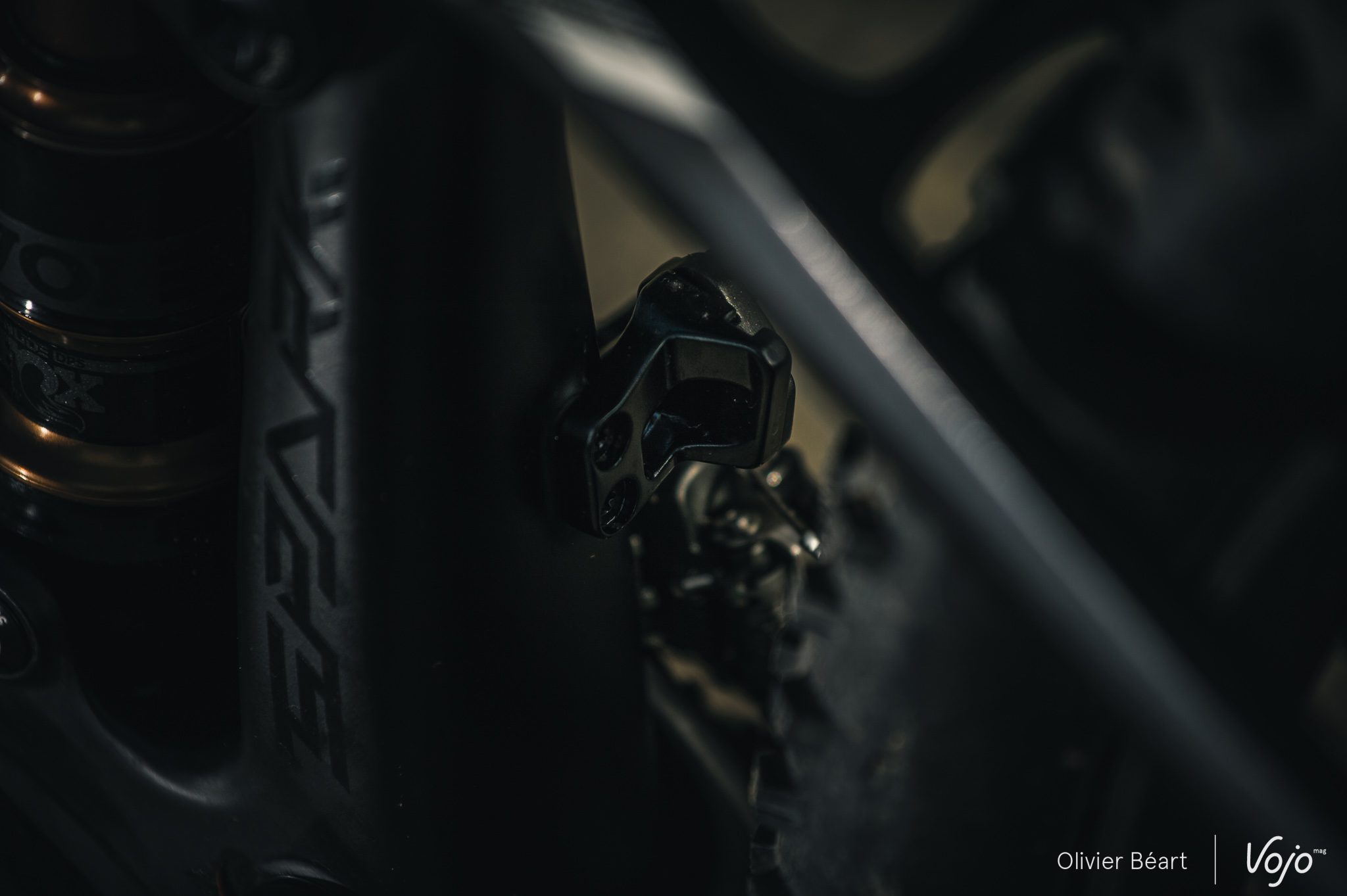 Sur la version haut de gamme Spark 900 Premium que vous avez ici sous les yeux, tout le cadre reste en carbone, biellette comprise. Par contre, pas de fibres HMX SL au programme, on reste ici sur du HMX pour un cadre qui reste sous les 2kg avec amortisseur mais qui s’écarte des 1800g du RC SL. Autre changement : contrairement au RC, le Spark 120 accepte le montage d’un dérailleur avant via l’adjonction d’une patte très discrète derrière le tube de selle. A propos de selle, c’est le moment de grimper dessus !