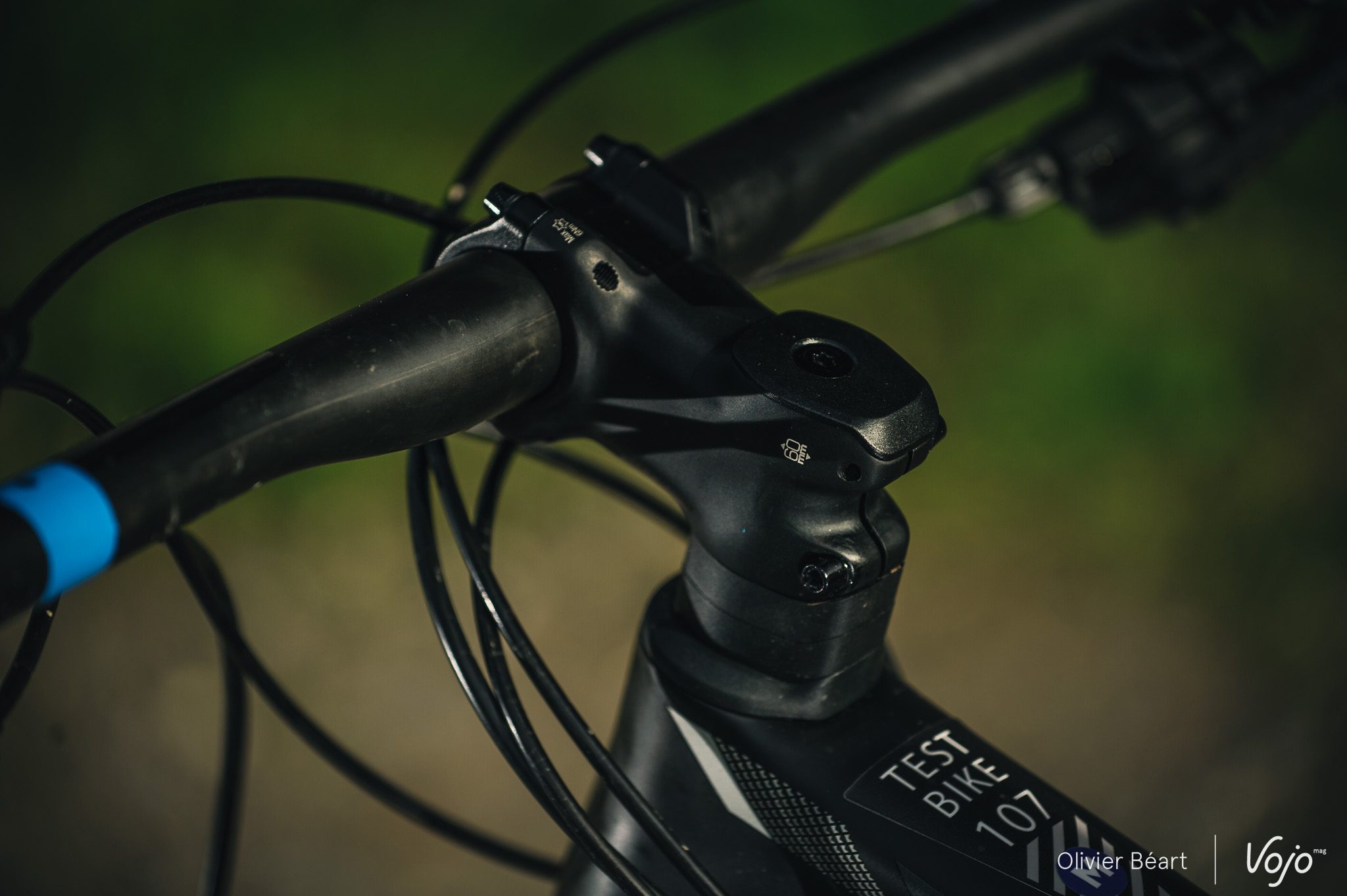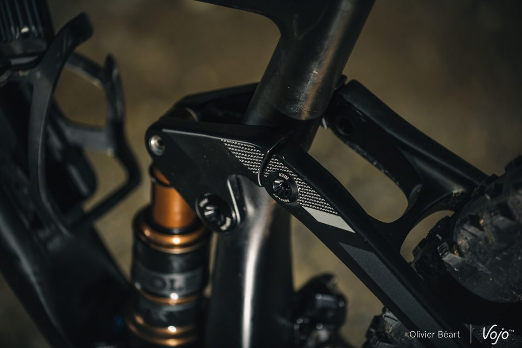 L’augmentation du débattement va de pair avec une modification de la géométrie. L’angle de direction passe de 68,5°, ce qui est déjà plutôt couché, à 67,2°. Cela entraîne un léger allongement du reach, compensé par l’adoption d’une potence de 60mm contre 70mm sur le RC.