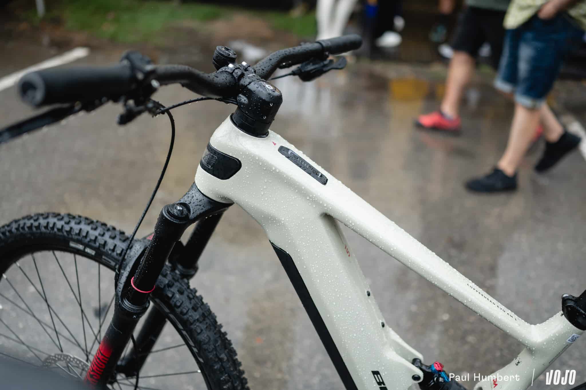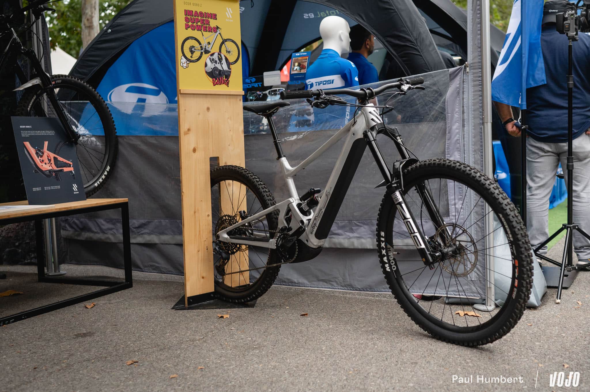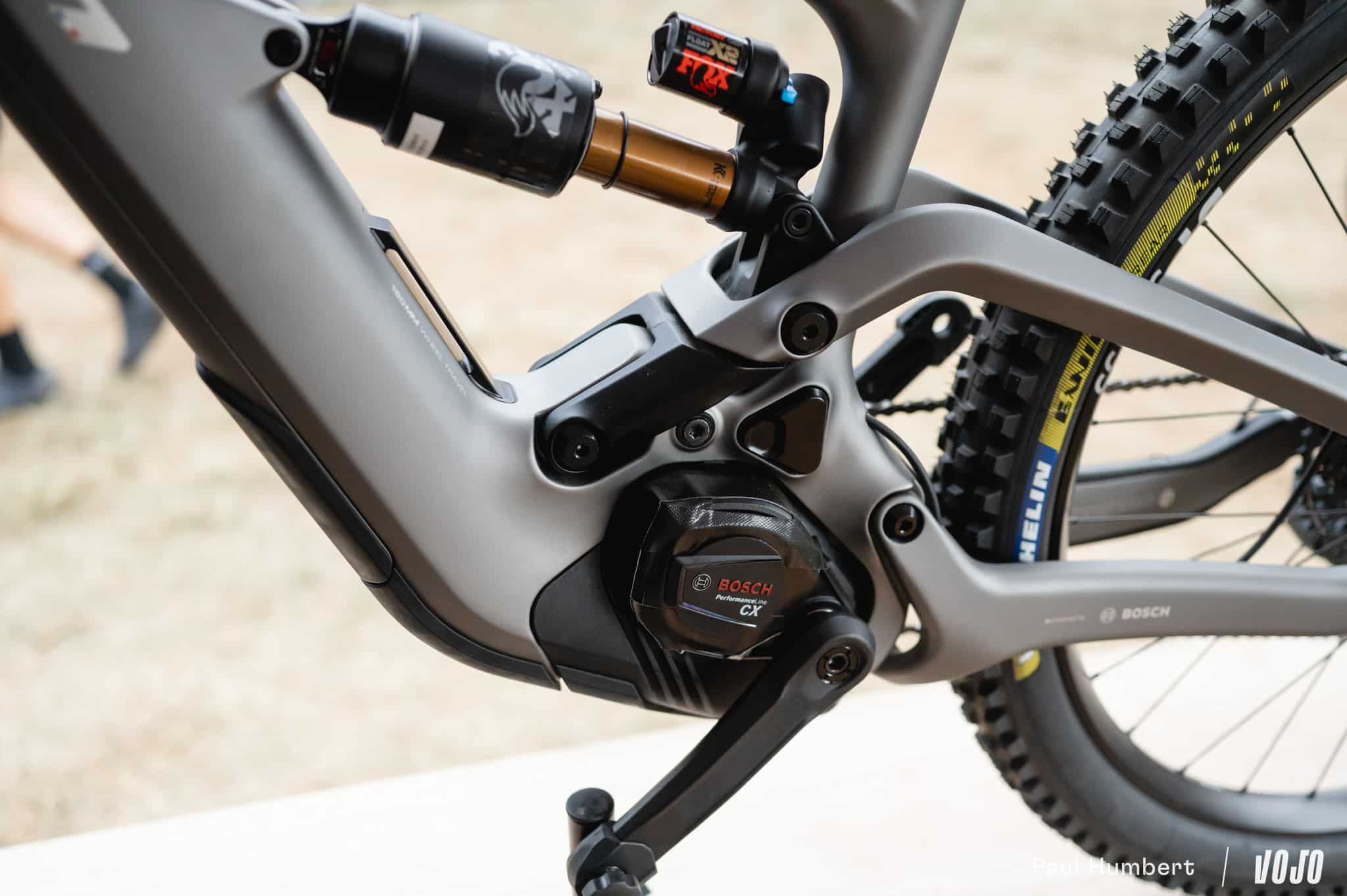 Le vélo est présenté dans un montage « mulet » (avec une roue de 27,5″ à l’arrière mais sera compatible en tout 29 pouces). On retrouve la petite commande Bosch qu’on apprécie et on découvre un gros travail fait sur la cinématique et les formes du cadre.